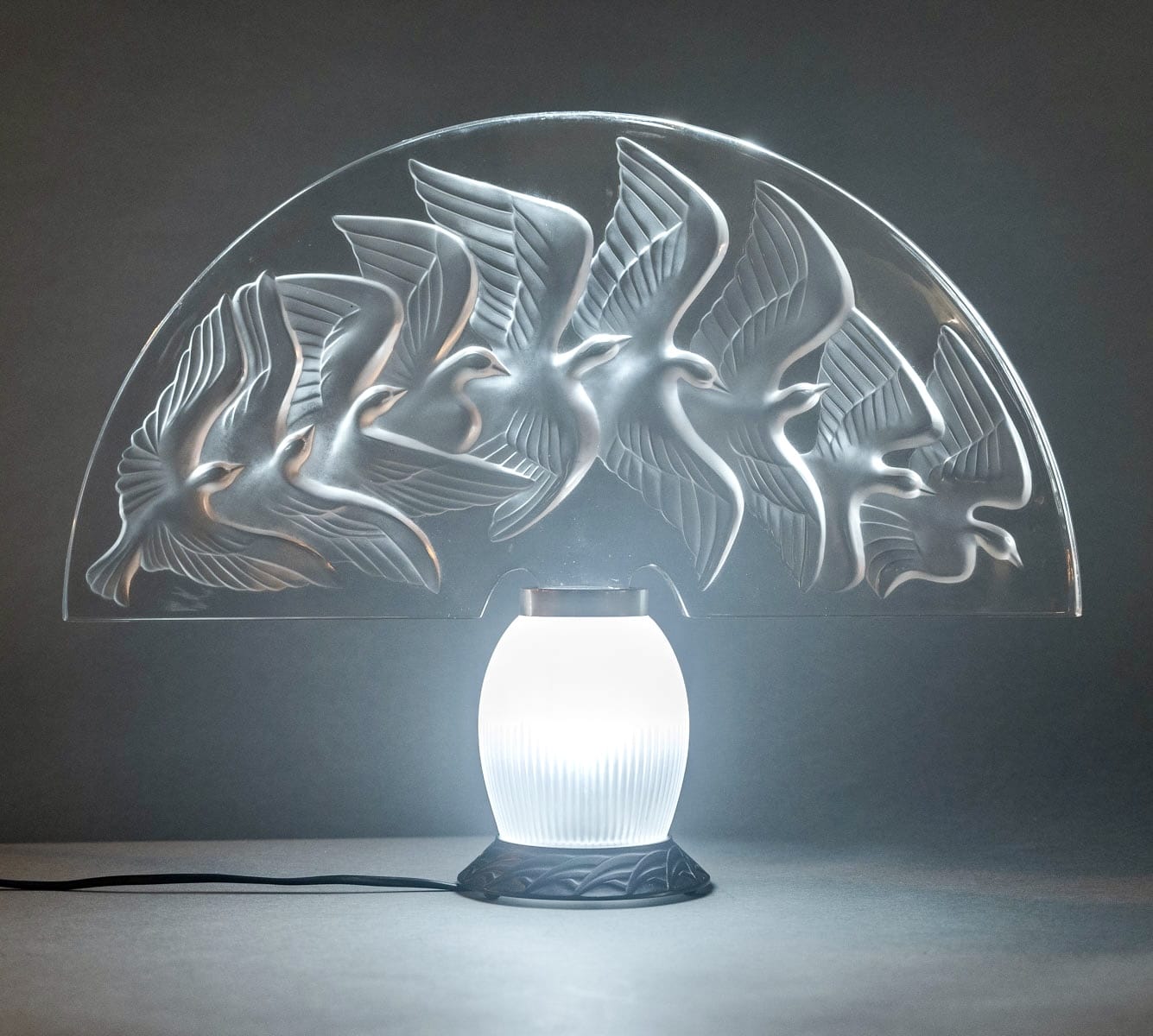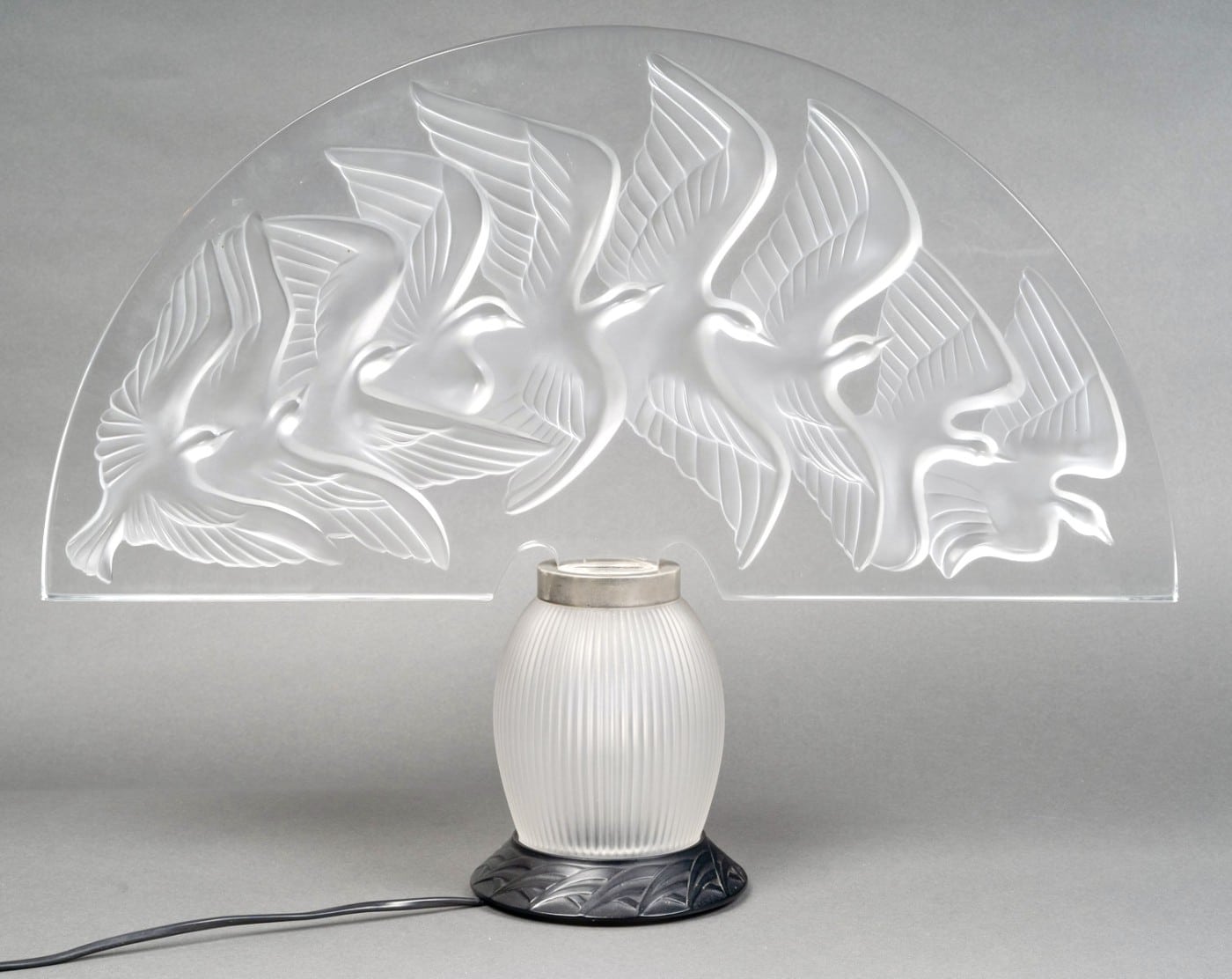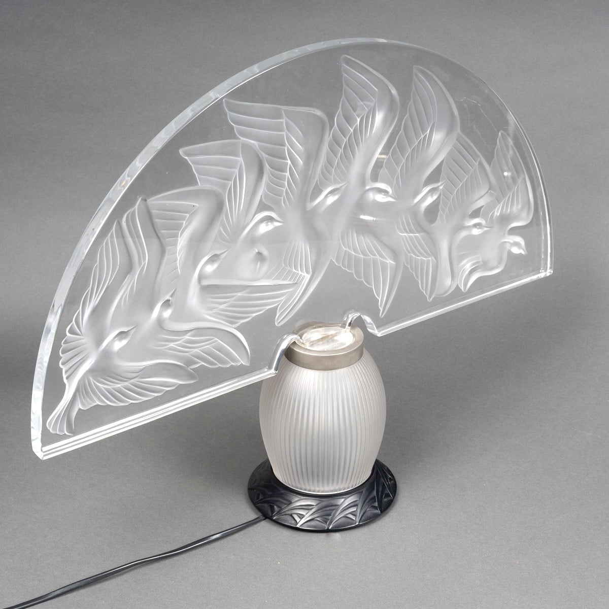 Lampe « Hokkaido » à décor de d’hirondelles en vol en cristal blanc de Marie-Claude Lalique créée 1990.