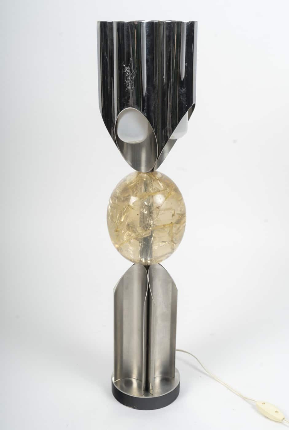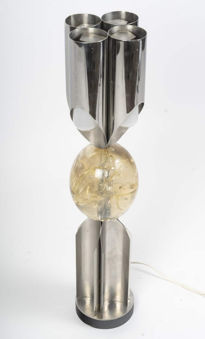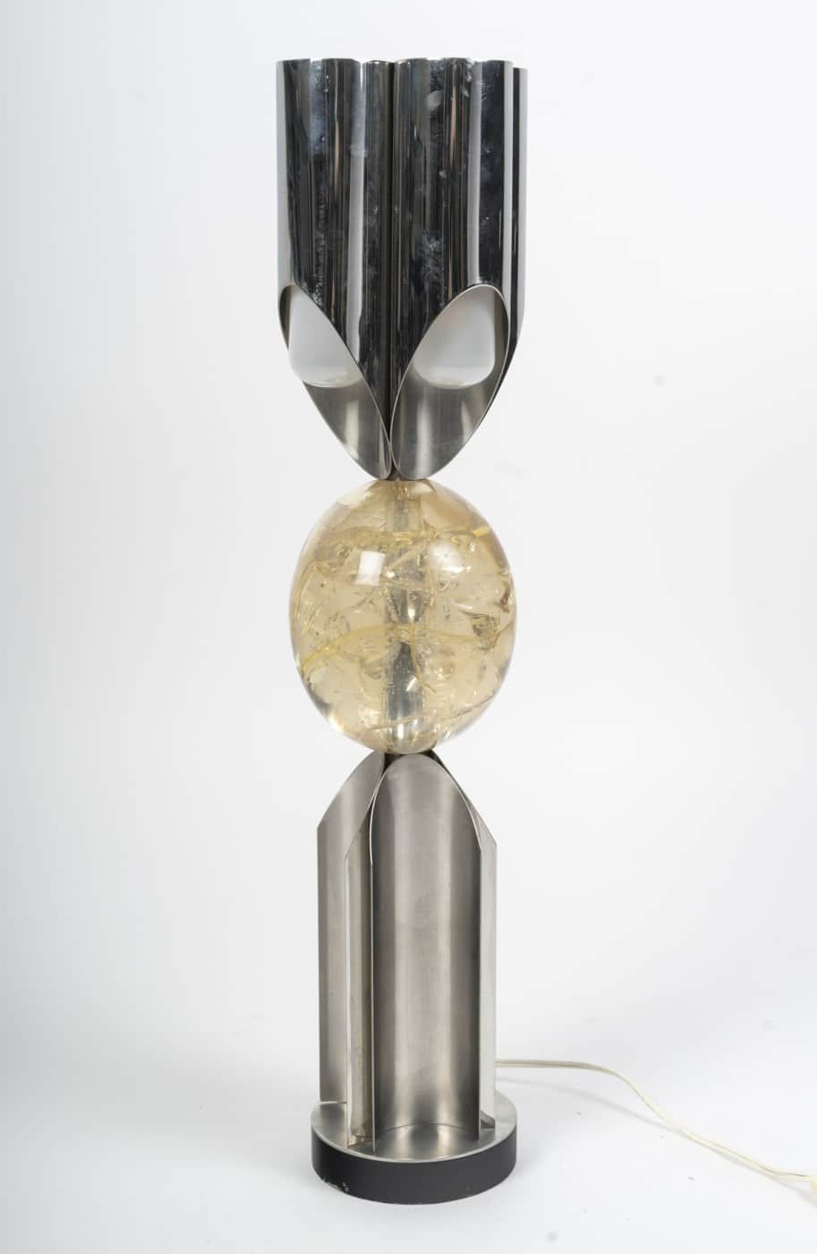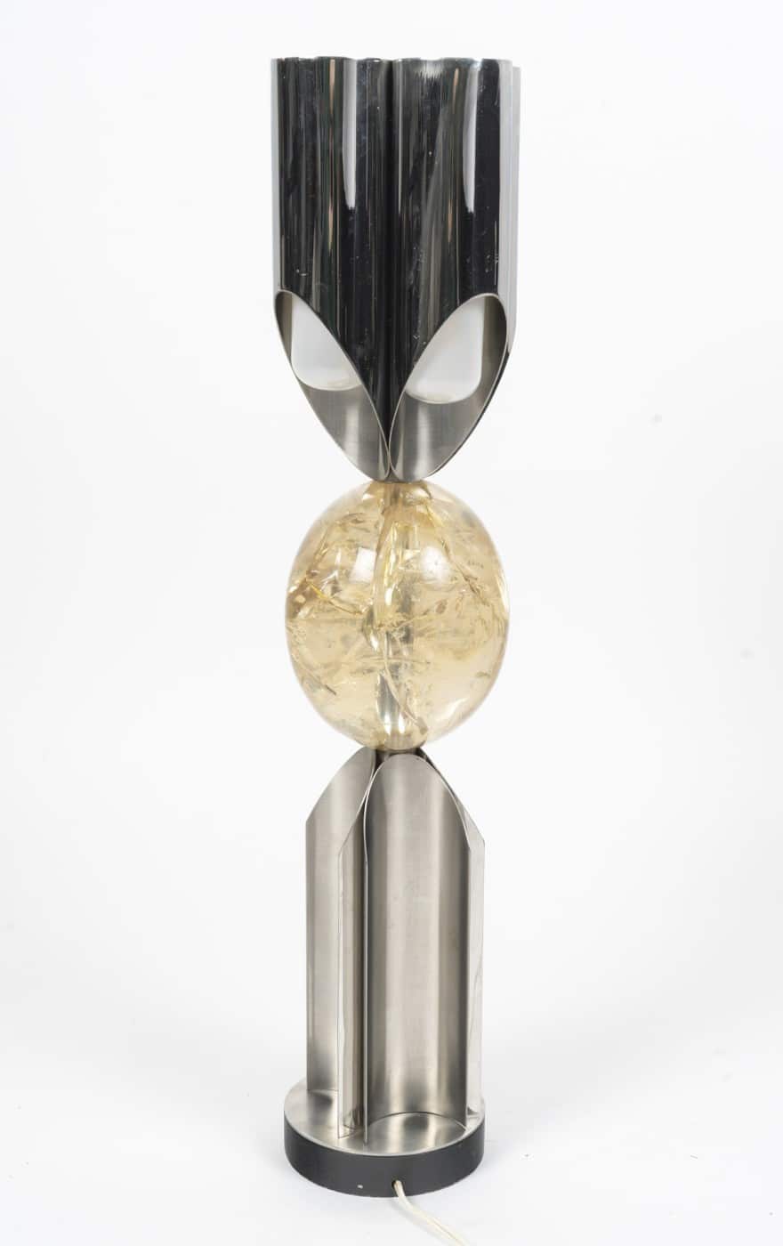Rare lampe à poser en inox centrée d’un oeuf en résine.