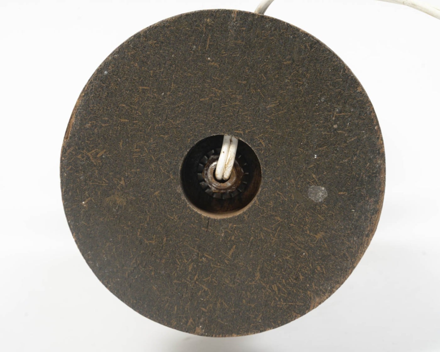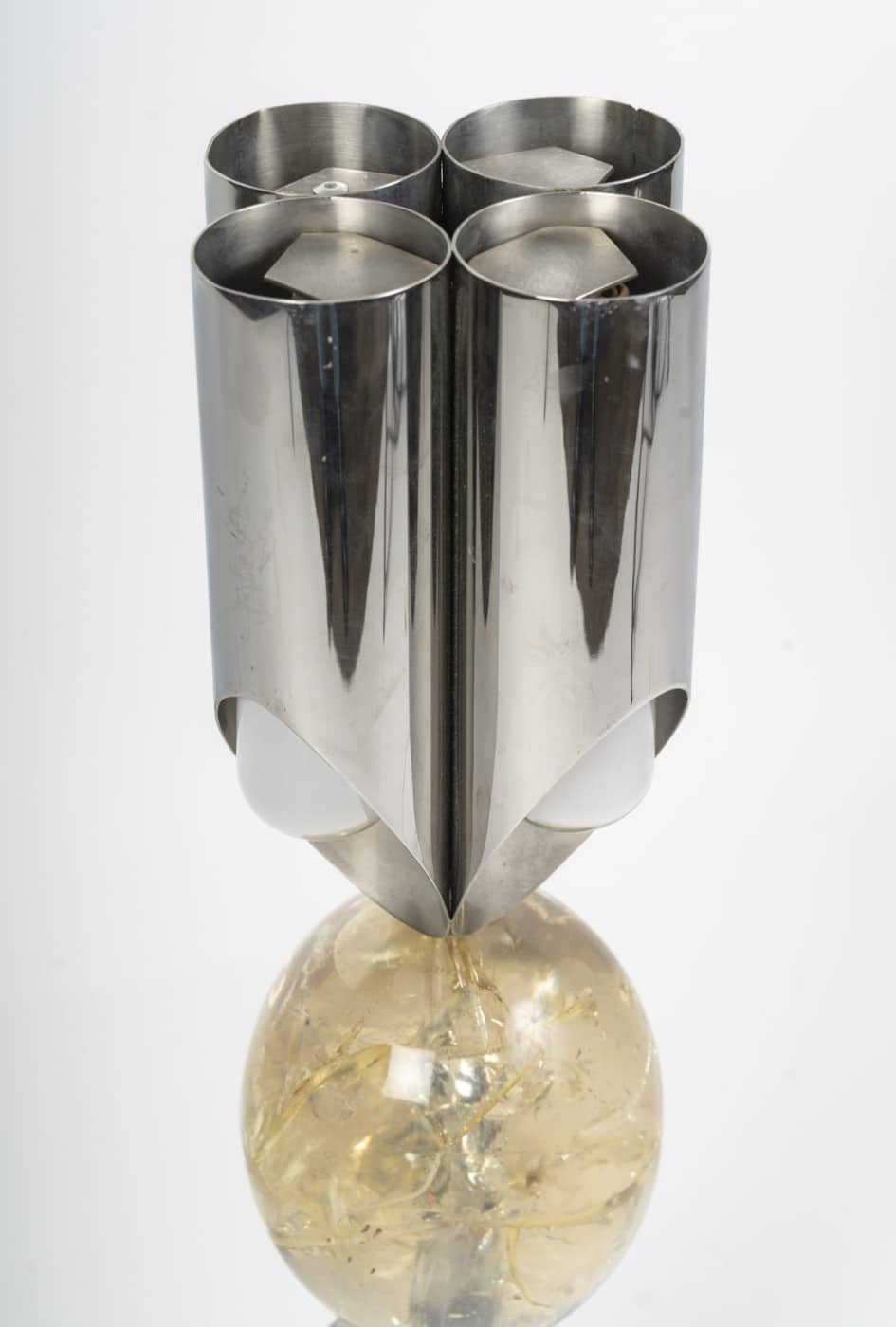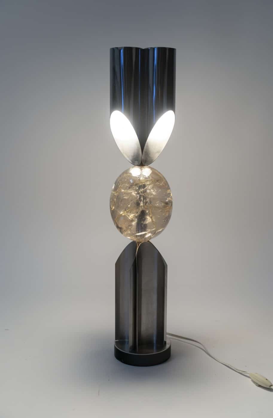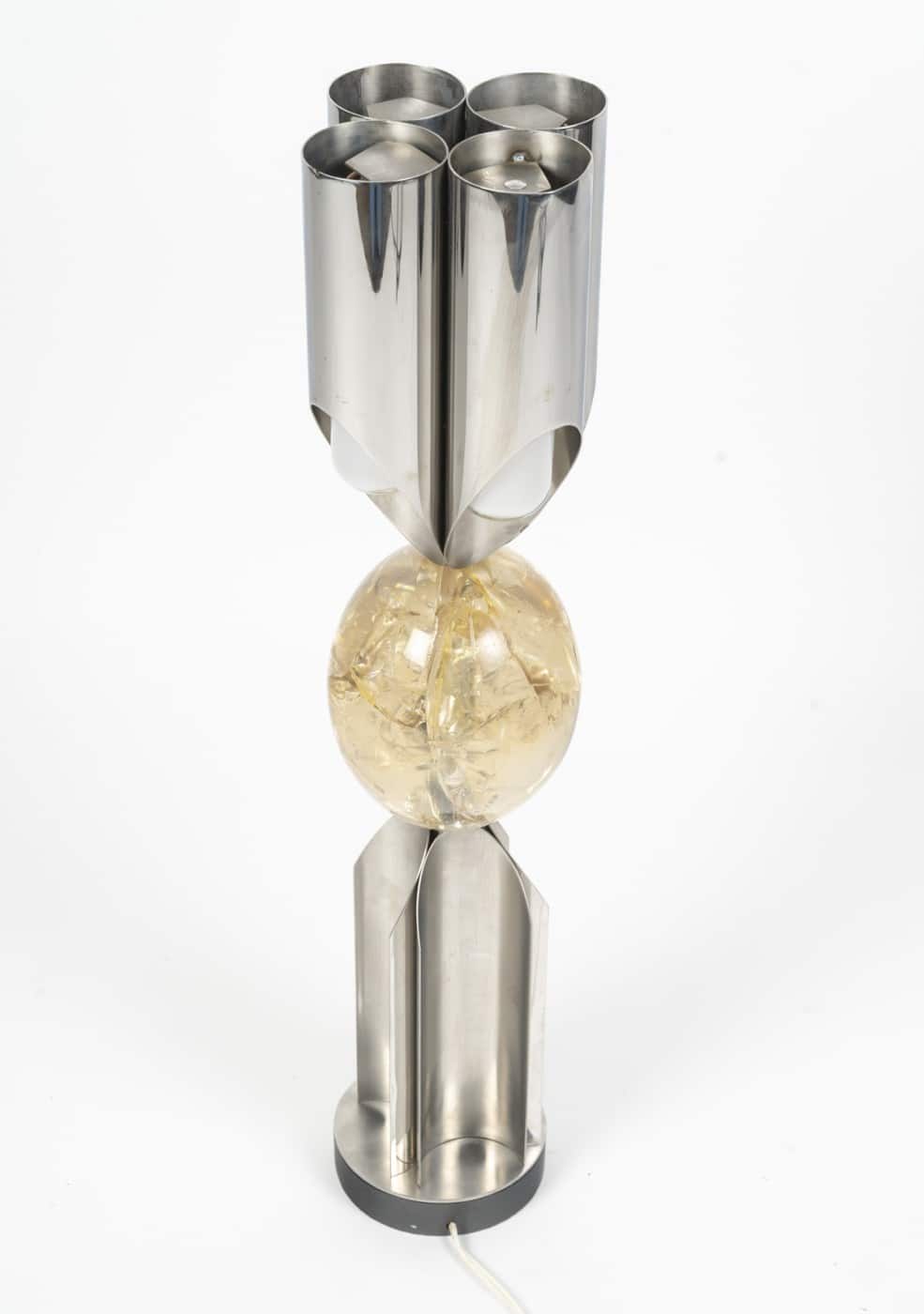 Rare lampe à poser en inox centrée d’un oeuf en résine.