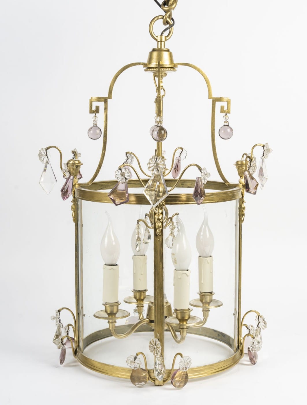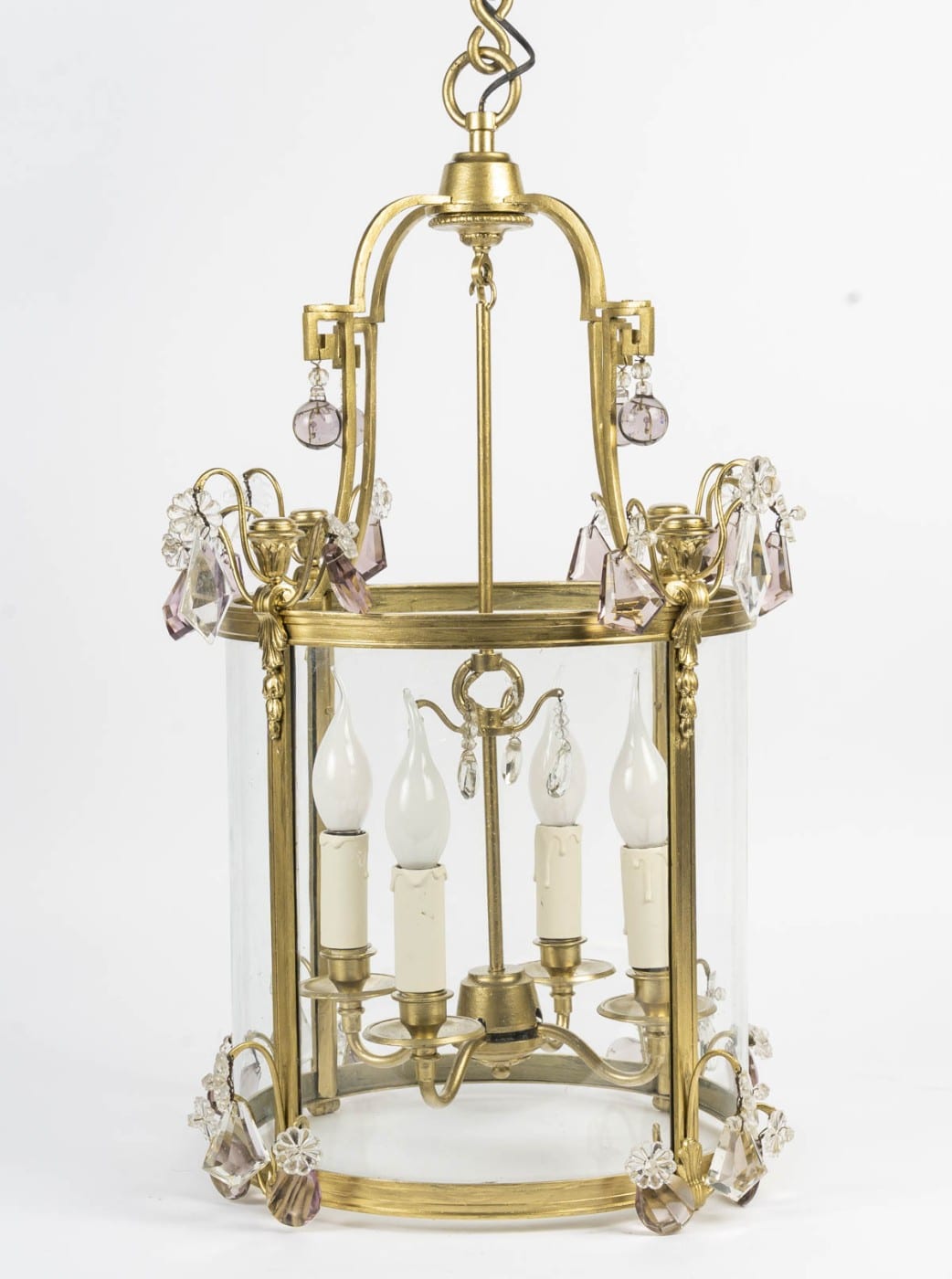 Lanterne à vitre galbée en bronze doré et cristal à quatres bras de lumières de style Louis XVI, d’époque XIXème.