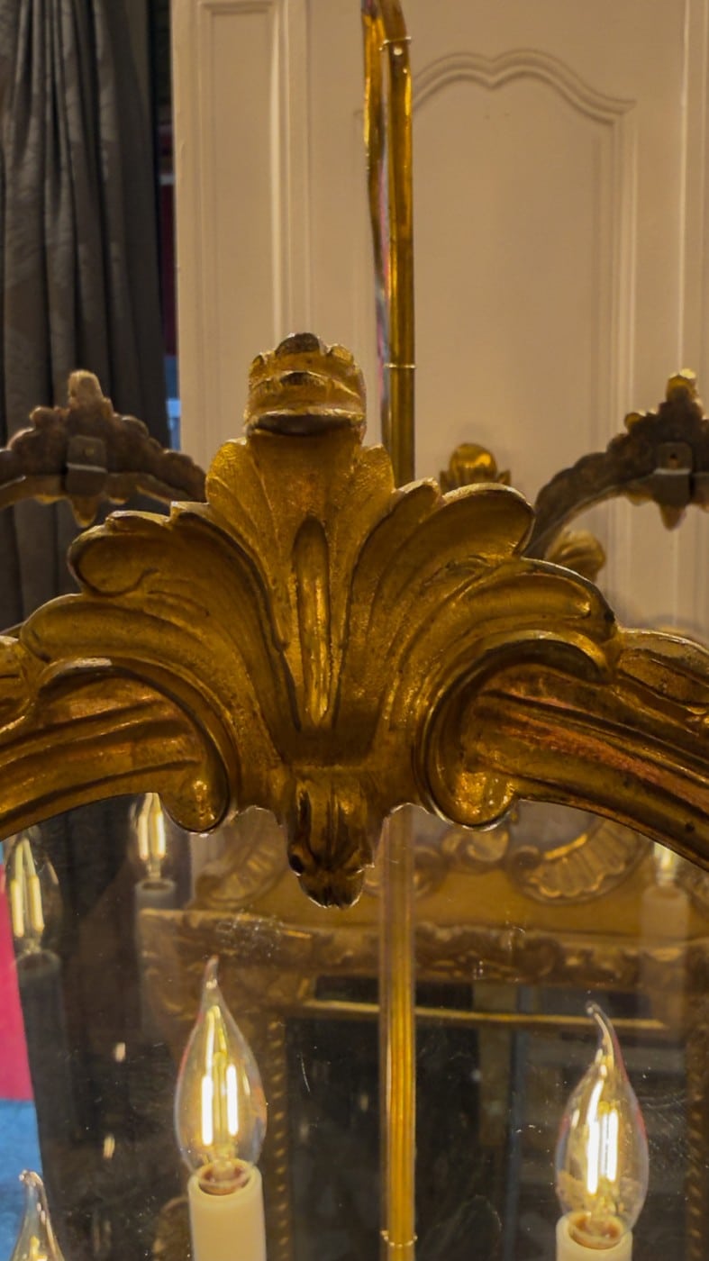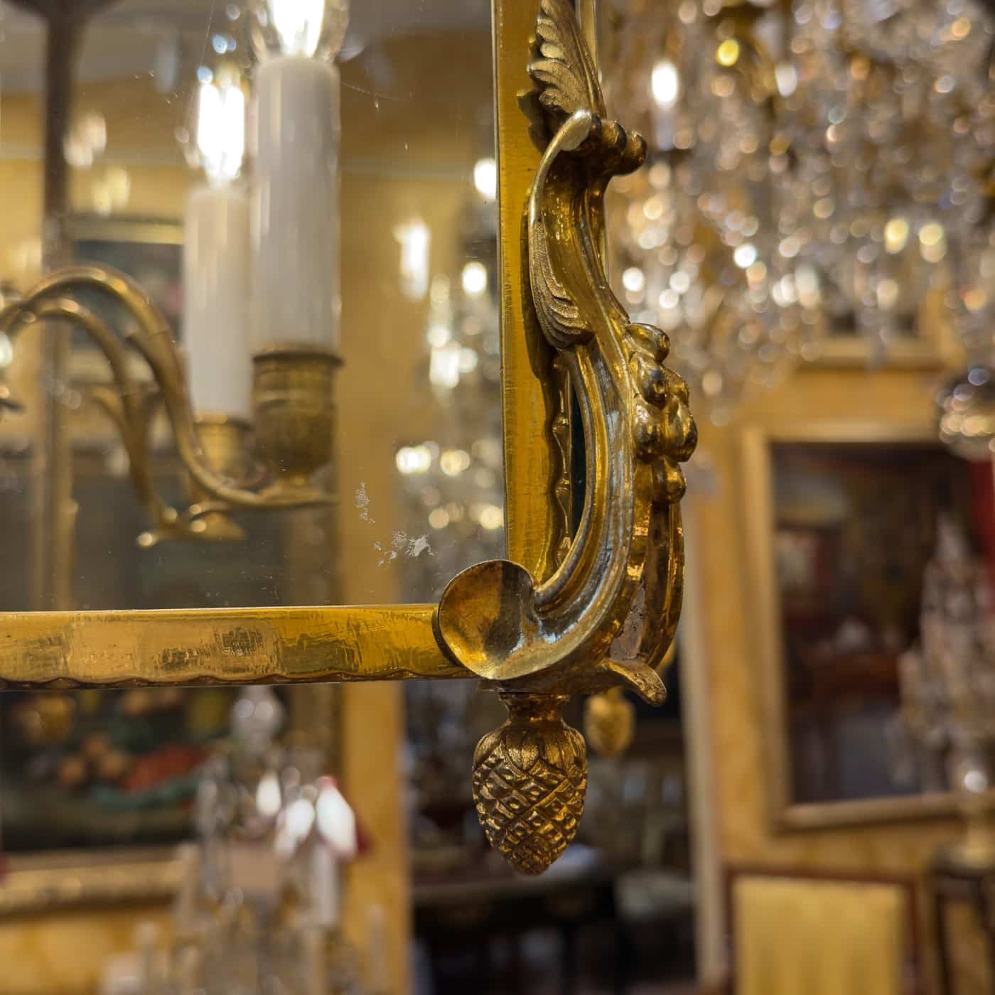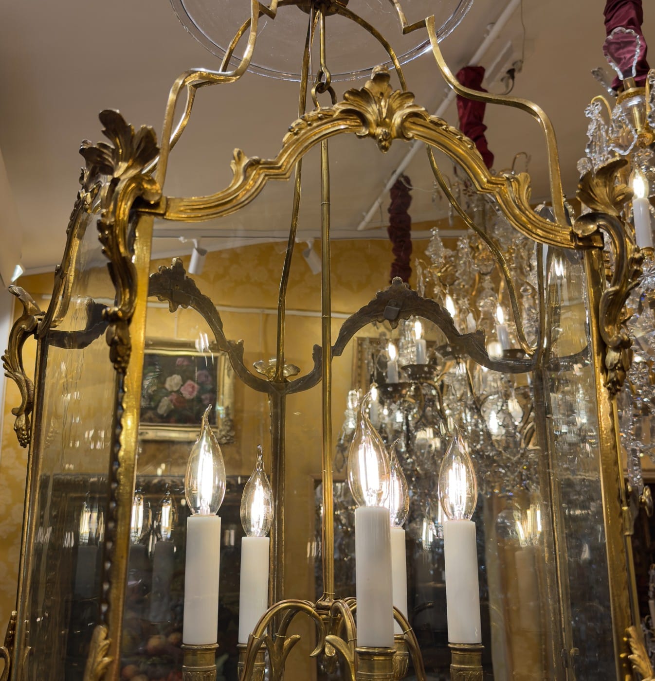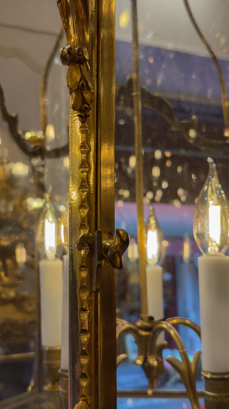 This pentagonal lantern, crafted in chiseled and gilt bronze, is illuminated by five interior lights protected by original flat glass panels. The upper section is topped with a glass smoke guard, from which five bronze arms descend, supporting the five-sided structure. The uprights are adorned with foliate scrolls at the top and beaded, leafy motifs at the bottom, framing a large glass door integrated into one of the panels. The base is enclosed by its original pentagonal glass.
