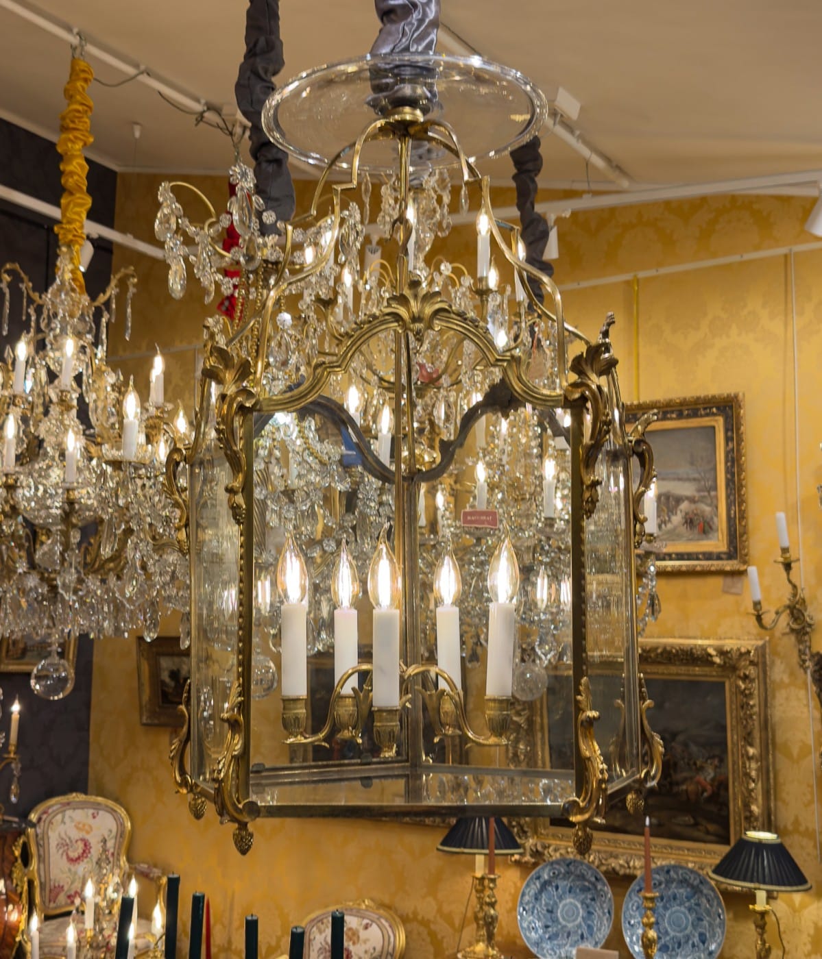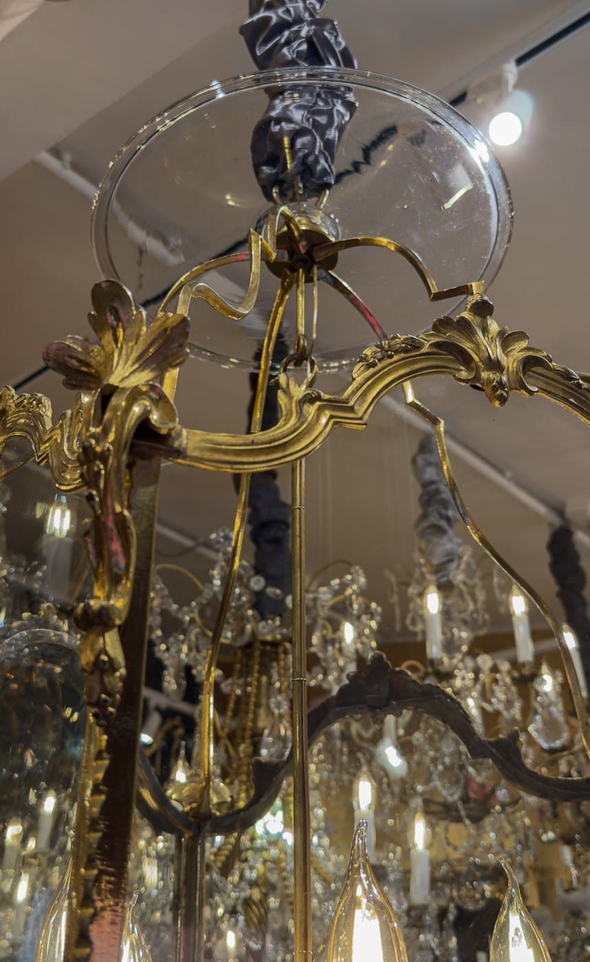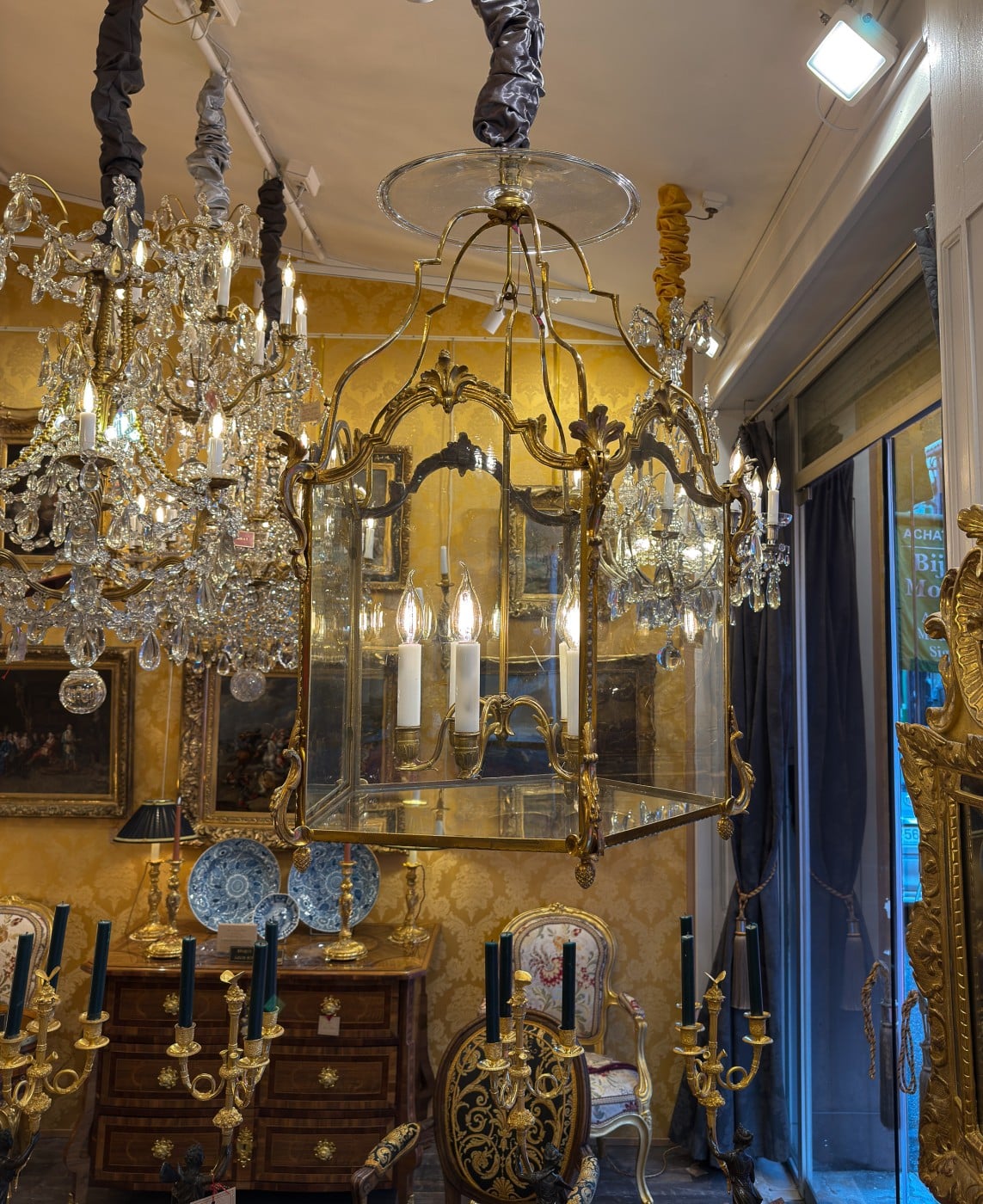 This pentagonal lantern, crafted in chiseled and gilt bronze, is illuminated by five interior lights protected by original flat glass panels. The upper section is topped with a glass smoke guard, from which five bronze arms descend, supporting the five-sided structure. The uprights are adorned with foliate scrolls at the top and beaded, leafy motifs at the bottom, framing a large glass door integrated into one of the panels. The base is enclosed by its original pentagonal glass.