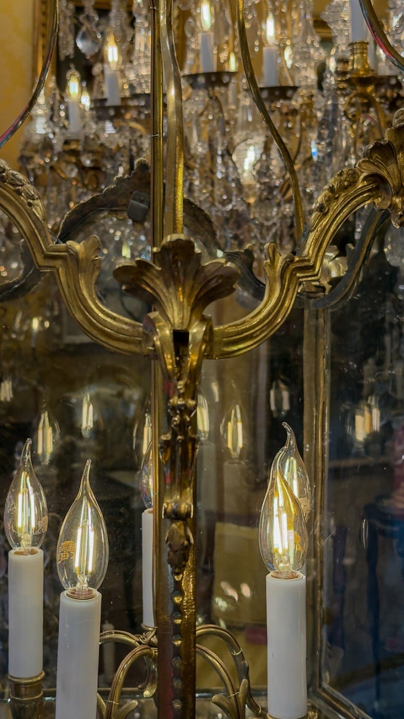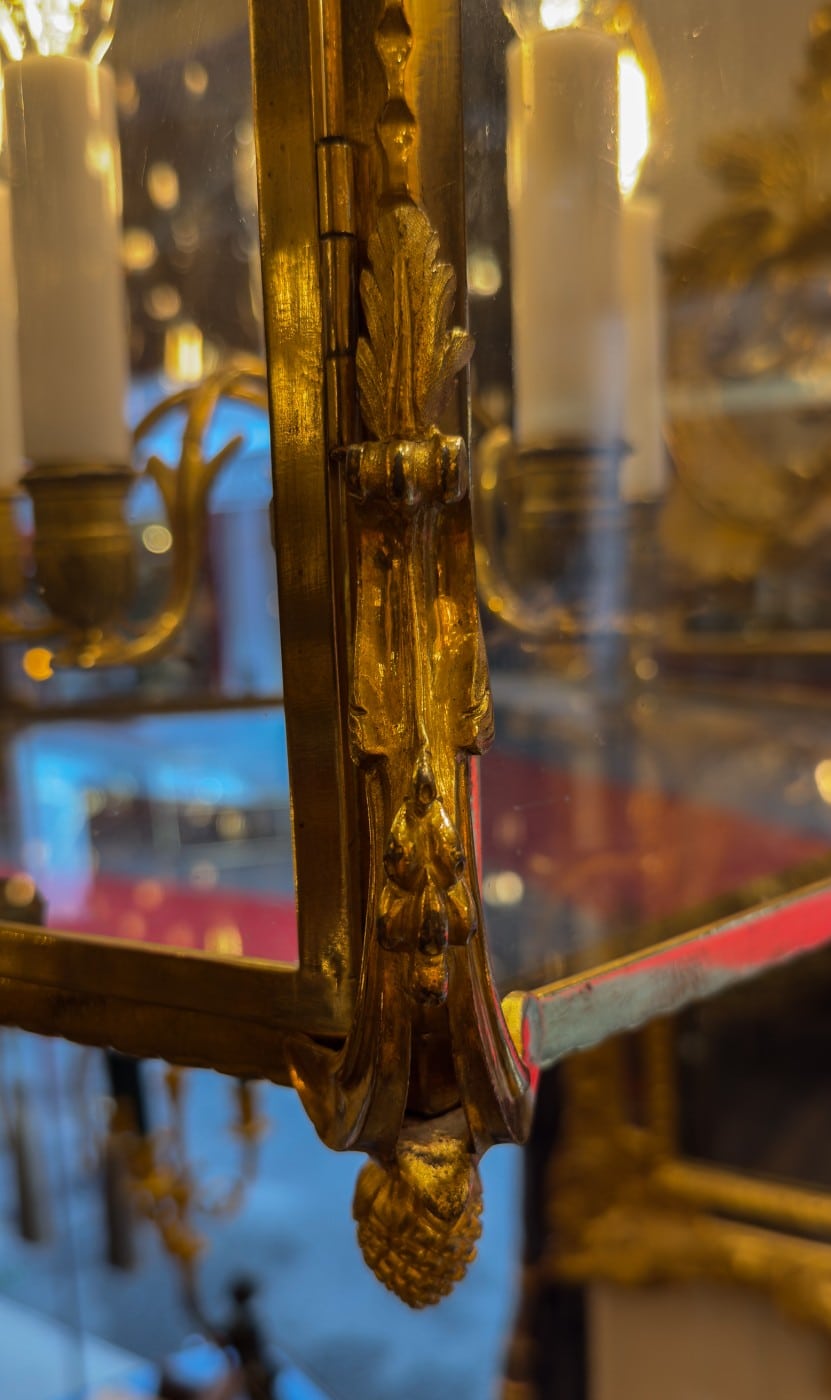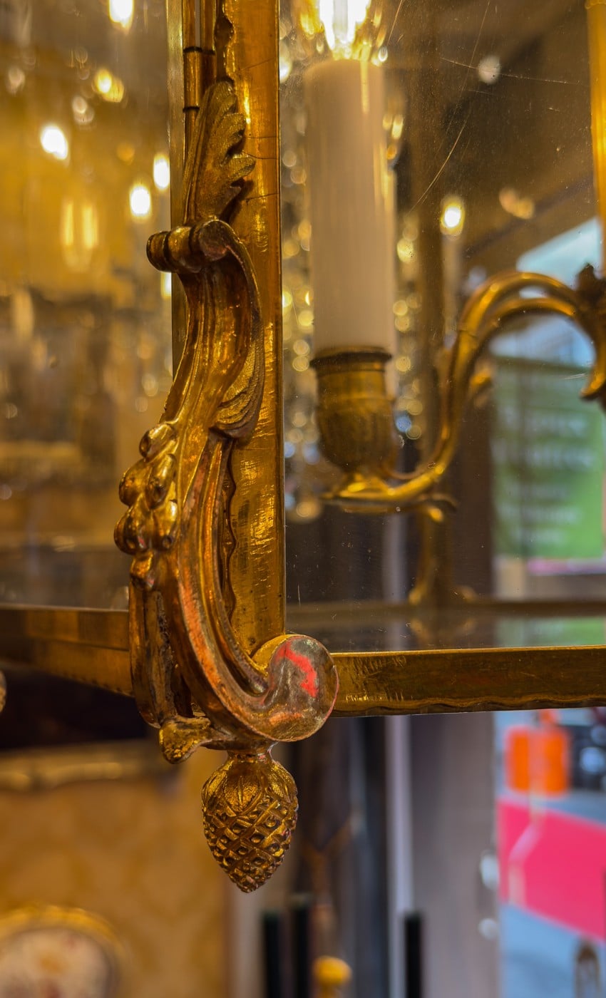 Cette lanterne pentagonale, en bronze ciselé et doré, s’illumine par cinq feux intérieurs protégés par des vitres plates d’origine. Sa partie supérieure est surmontée d’un pare-fumée en verre, d’où descendent cinq bras en bronze soutenant la structure à cinq pans. Les montants, ornés de volutes feuillagées en partie haute et de perles ainsi que d’épis feuillagés en partie basse, encadrent une large porte vitrée intégrée à l’un des pans. La base est fermée par son verre pentagonal d’origine.