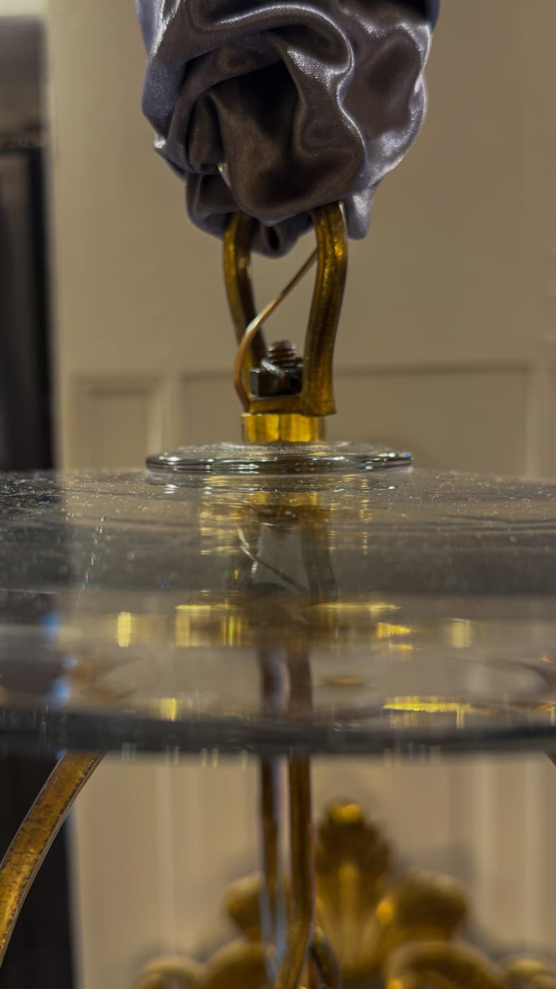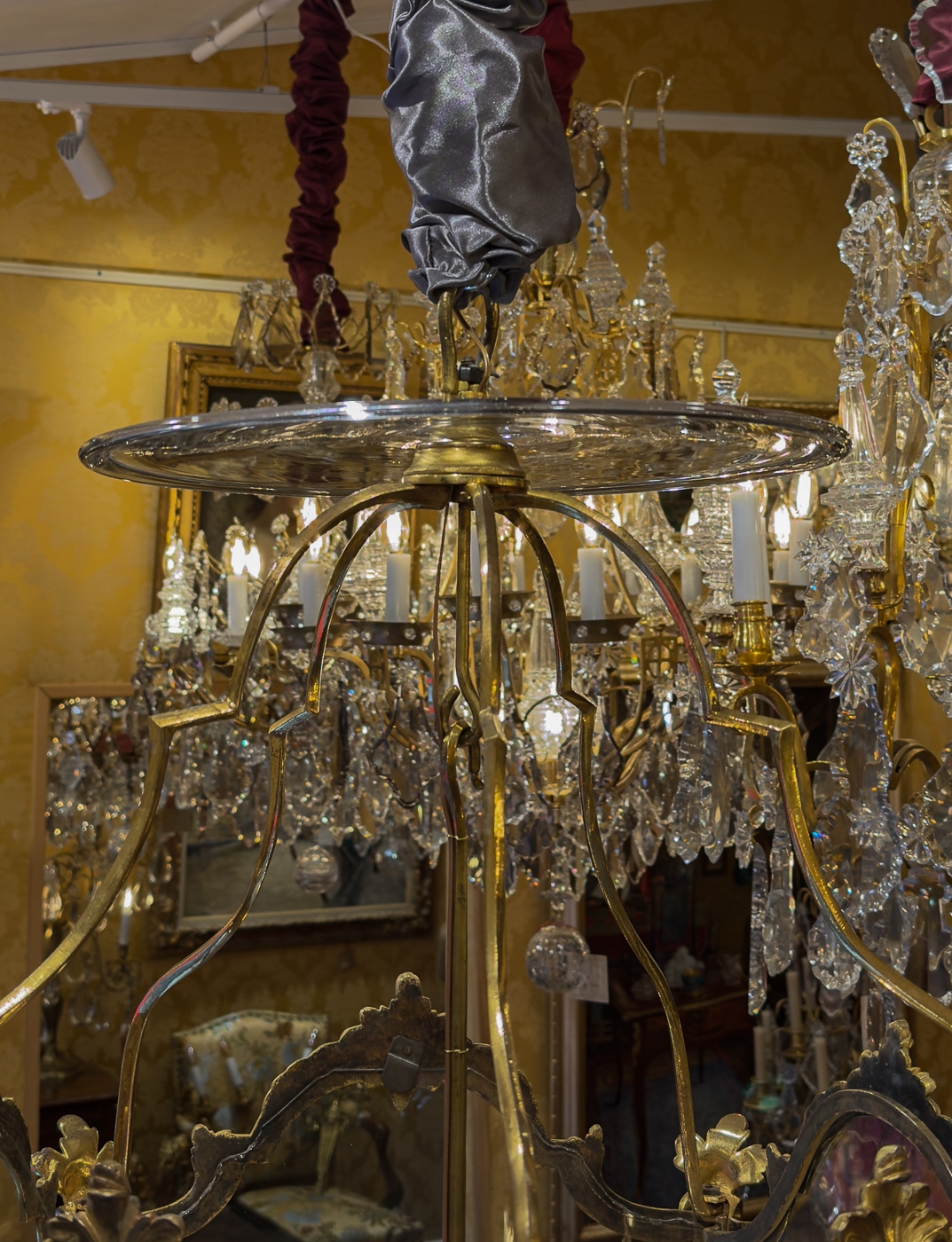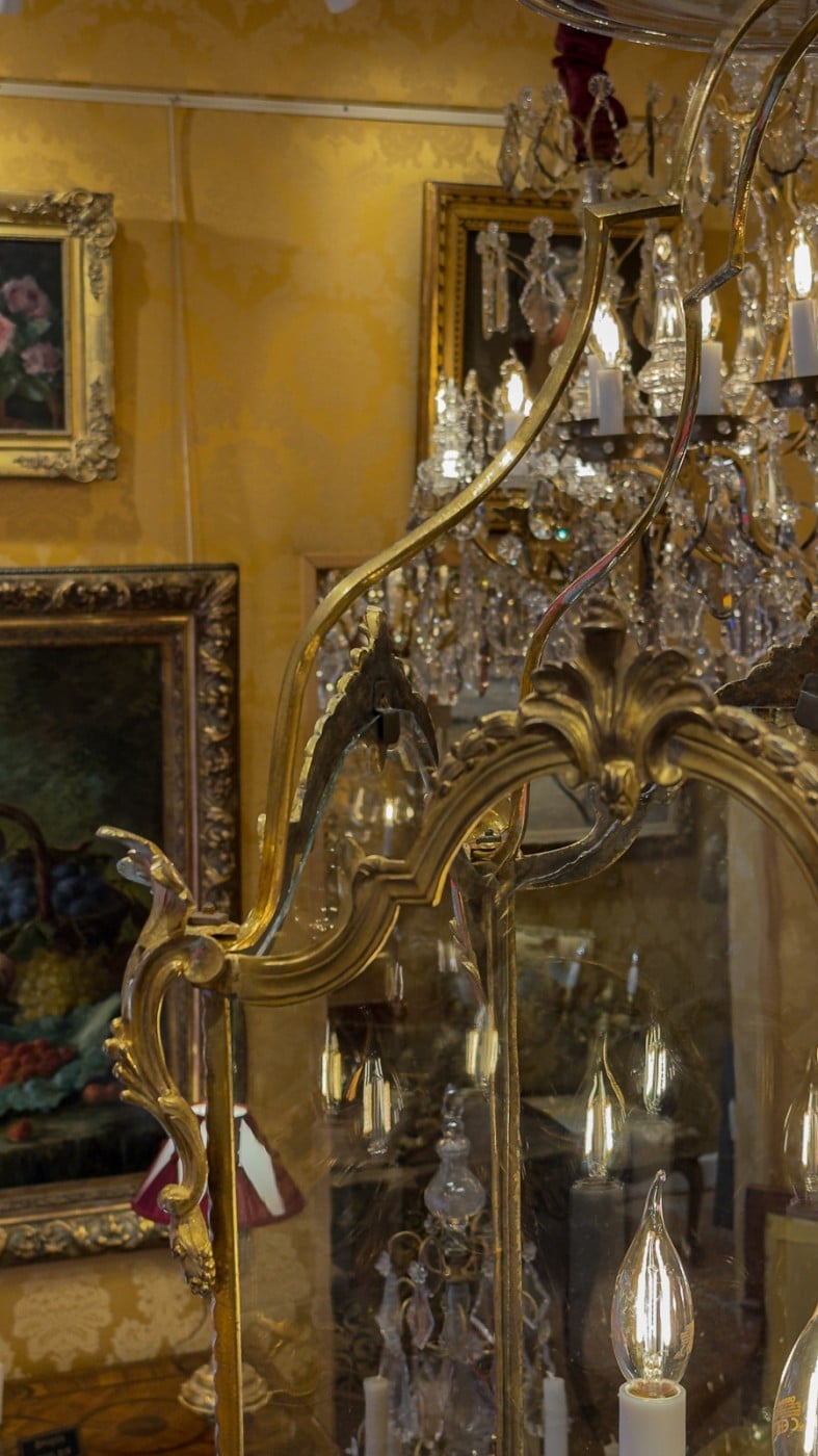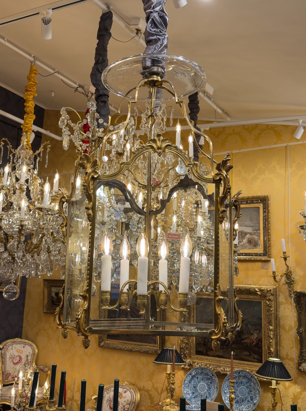Cette lanterne pentagonale, en bronze ciselé et doré, s’illumine par cinq feux intérieurs protégés par des vitres plates d’origine. Sa partie supérieure est surmontée d’un pare-fumée en verre, d’où descendent cinq bras en bronze soutenant la structure à cinq pans. Les montants, ornés de volutes feuillagées en partie haute et de perles ainsi que d’épis feuillagés en partie basse, encadrent une large porte vitrée intégrée à l’un des pans. La base est fermée par son verre pentagonal d’origine.