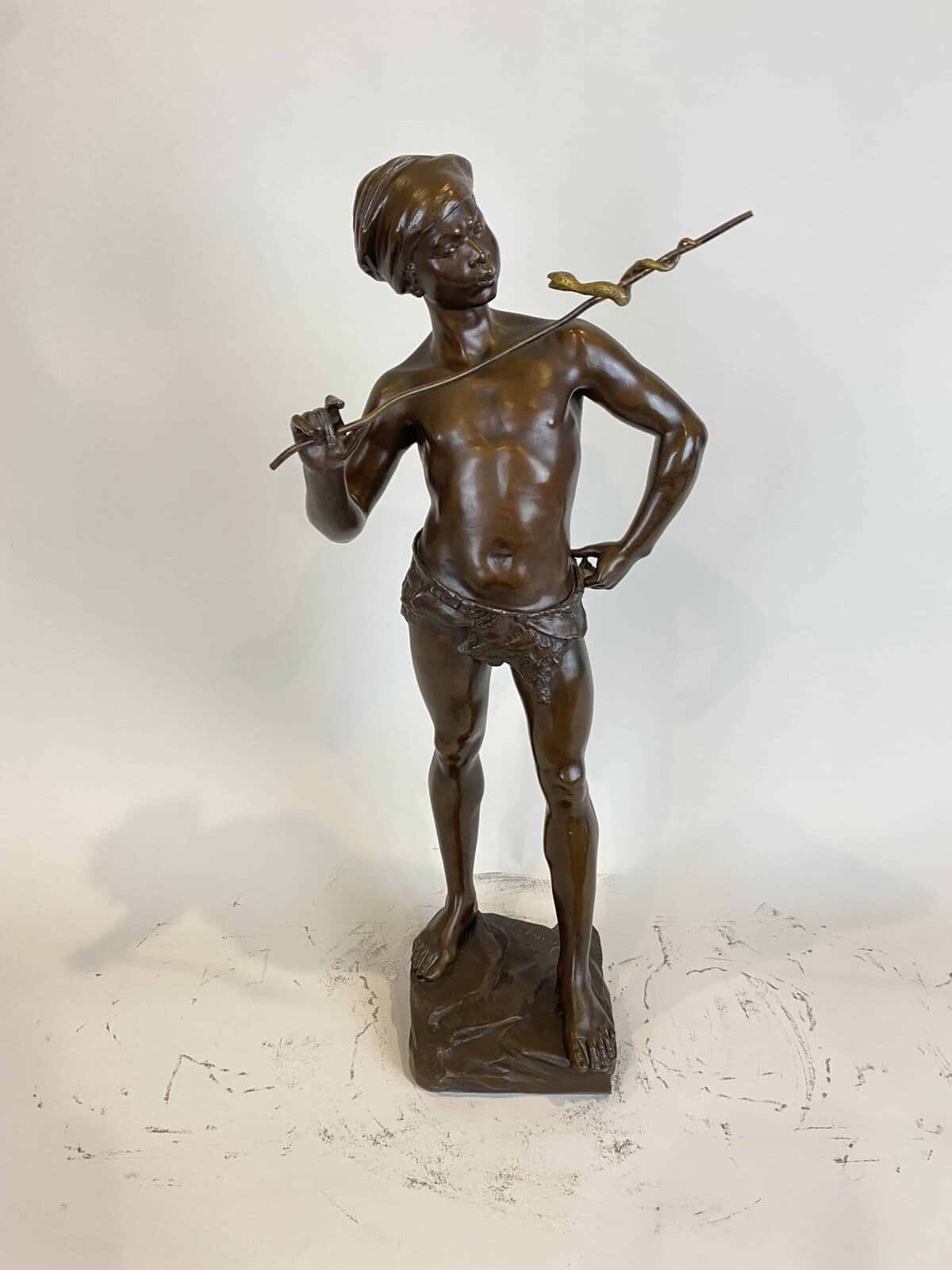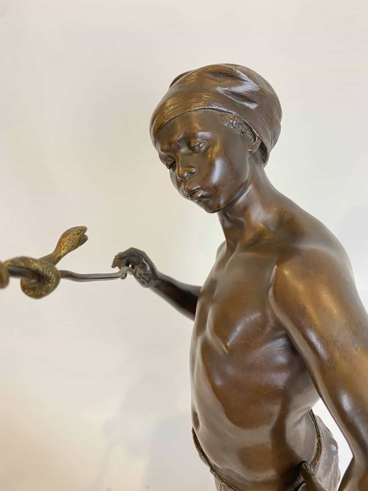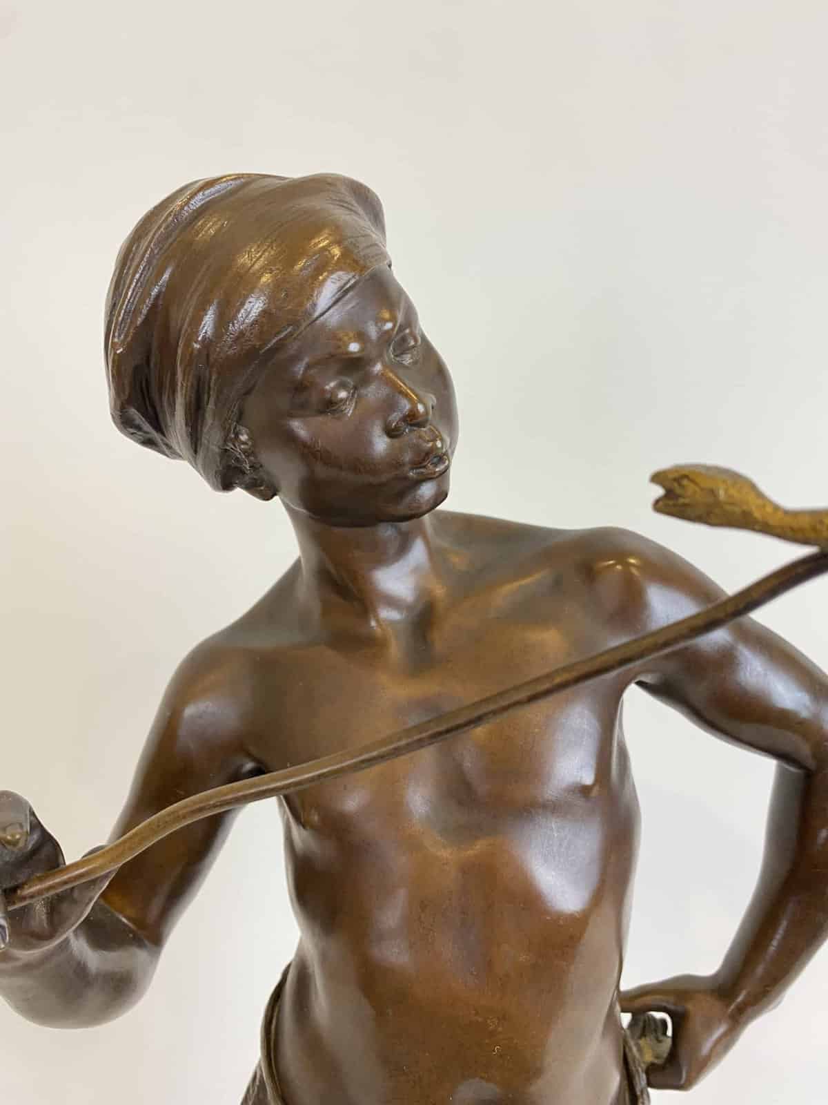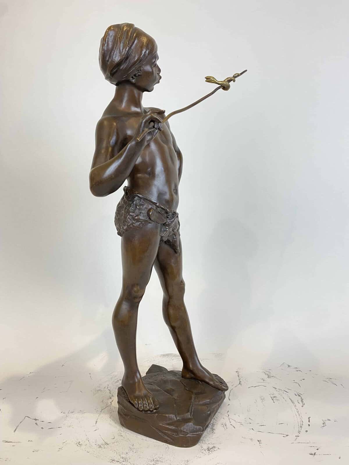 Belle sculpture Orientaliste figurant un jeune homme charmeur de serpent en bronze à patine brune et dorée pour le serpent.