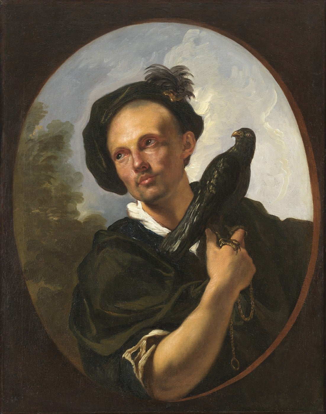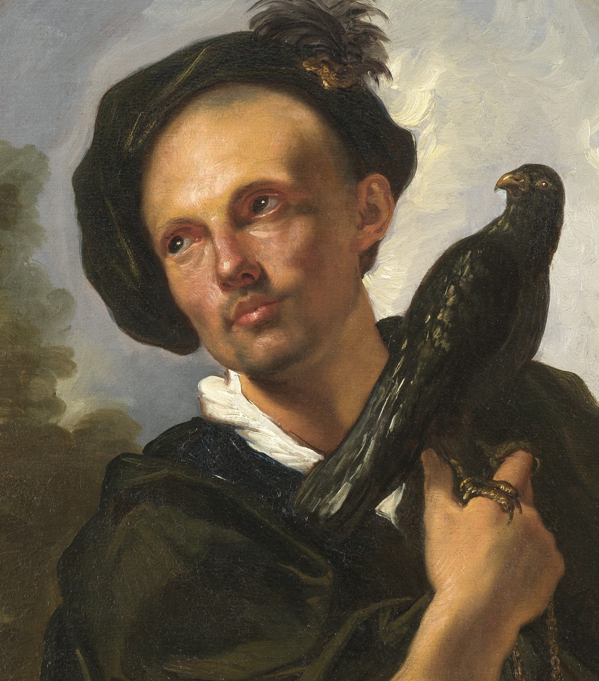 Notre fauconnier au regard mélancolique a été brossé par le plus cosmopolite des peintres d’Europe centrale, Johann Kupezky. D’un pinceau vigoureux et avec une pâte généreuse, le jeune homme coiffé d’un béret est saisi dans un mouvement de retournement. La composition le représente dans un ovale feint sur lequel il parait s’accouder. Notre portrait, réaliste sans être idéalisé, n’échappe pas à la vérité artistique de Kupezky qui montre un jeune homme dégarni et aux yeux cernés avec une grande profondeur psychologique.