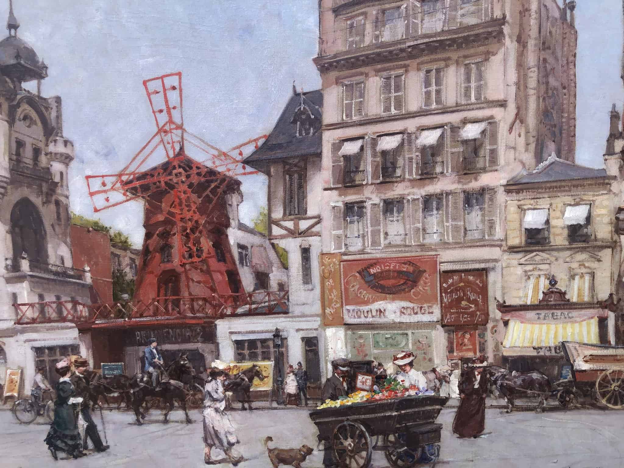 Leon ZEYTLINE D’origine russe et amoureux de Paris, le peintre postimpressionniste Léon Zeytline a su avec brio saisir l’esprit grisant de Paris. Il fait de la Ville Lumière le sujet principal de son oeuvre pendant de nombreuses années.Le Paris d’antan s’ouvre dans toute sa splendeur et dans des moindres détails, joyeux et moderne, dynamique et charmant, dans les tableaux d’un artiste méconnu aujourd’hui du grand public, la majeure partie de ses oeuvres étant conservées chez des particuliers. Seuls les musées Carnavalet, de Hambourg et de Mulhouse possèdent quelques tableaux de Léon Zeytline.Léon Zeytline est né en France, où sa famille d’origine russe s’est installée bien avant la révolution. A 15 ans, le jeune homme a entamé ses études à l’École de Moscou de peinture, sculpture et architecture, les circonstances familiales ayant obligé ses proches à retourner en Russie. Même pendant ses années d’études, il a beaucoup voyagé en Europe. Au cours d’un de ces voyages en 1909 ( après avoir obtenu son diplôme en 1908 ), il est reparti en France, où il décide de s’établir définitivement.Ebloui par la beauté de la capitale française, le jeune peintre fait de Paris le sujet central de son œuvre pendant de nombreuses années. Il y consacre plus de 500 tableaux, une véritable encyclopédie qui raconte avec une précision caractéristique de l’école russe, et une luminosité empruntée aux impressionnistes Français, la ville dans tous ses états.À la différence de certains de ses contemporains postimpressionnistes, Léon Zeytline ne prenait pas de commande et n’a représenté que les sujets parisiens qui l’ont captivé, sans prétention commerciale. Il peignait la vie quotidienne parisienne ainsi que les lieux à la mode de la capitale.On retrouve dans ses œuvres les fameux boulevards haussmanniens très en vogue, tels que les Champs-Elysées ou encore l’Avenue de l’Opéra, avec leurs cafés prestigieux, les monuments emblématiques comme la Tour Eiffel, mais aussi les quartiers populaires avec leurs marchés et leurs commerces.Toutes les scènes sont animées de personnages en promenade ou occupés à leurs besognes quotidiennes. Les frous-frous et chapeaux sophistiqués des élégantes habillées à la mode et les robes des ouvrières sont représentés avec un soin égal. Par leur diversité et leur authenticité, les scènes parisiennes constituent de véritables documents historiques, témoins de cette époque.La description architecturale est particulièrement précise dans les tableaux de l’artiste. Sur son œuvre représentant le Moulin Rouge, on peut découvrir l’aspect de ce célèbre cabaret tel qu’il se présentait avant l’incendie du 27 février 1915, qui a détruit en une grande partie la façade Art Nouveau du bâtiment.Zeytline prend le temps de décrire tous les éléments décoratifs architecturaux, l’entrée des salles et de la billetterie, les affiches des spectacles de music-hall. Les photographies d’époque du Moulin Rouge confirment la précision de Zeytline dans la représentation des détails qui caractériseront ce lieu jusqu’en 1915.Nous observons également de nombreux moyens de transport dans ces tableaux : impérial, omnibus américain, bus Schneider, tramway, calèche, train, cariole et charrette, sans oublier les bicyclettes.Peu à peu, les chevaux cèdent les avenues parisiennes aux automobiles. Les entrées de métro signés Hector Guimard font également partie des scènes de la vie des Parisiens immortalisées par le peintre.Zeytline aime le Paris festif, sous ses airs d’élégance un brin de canaille. Dans les scènes représentant les nuits parisiennes et les cafés-concerts ainsi que dans les scènes de genre, les femmes occupent toujours une place de premier plan dans l’oeuvre de Zeytline.Elles charment les messieurs, déploient leur séduction sans ménagement pour leurs partenaires, s’amusent et s’attristent, regardant les bulles de champagne scintiller à la lumière d’un chandelier. Elles nous font penser aux personnages de Toulouse-Lautrec, Degas, Manet ou Renoir, mais les robes, le maquillage et les coiffures nous renvoient aux années 1920.Léon Zeytline a réussi à vivre de ses peintures, qui furent appréciées pour leurs qualités artistiques, mais également pour avoir su si bien saisir l’esprit grisant de Paris.