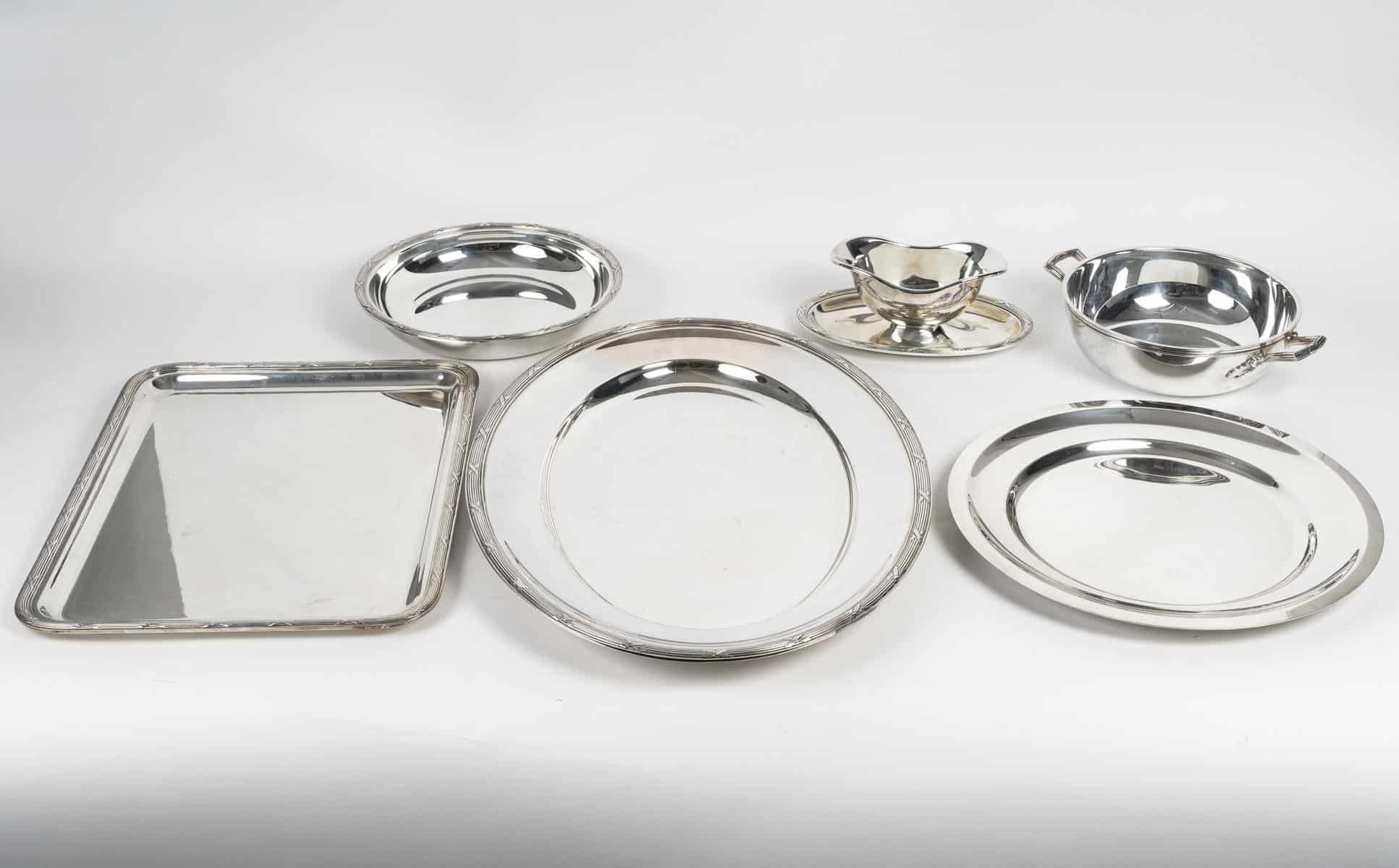 Ensemble de plateaux et pièces de service en métal argenté Christofle, emblématique maison d’orfèvrerie française. Ce lot représente une belle opportunité pour les amateurs d’arts de la table et de pièces raffinées.