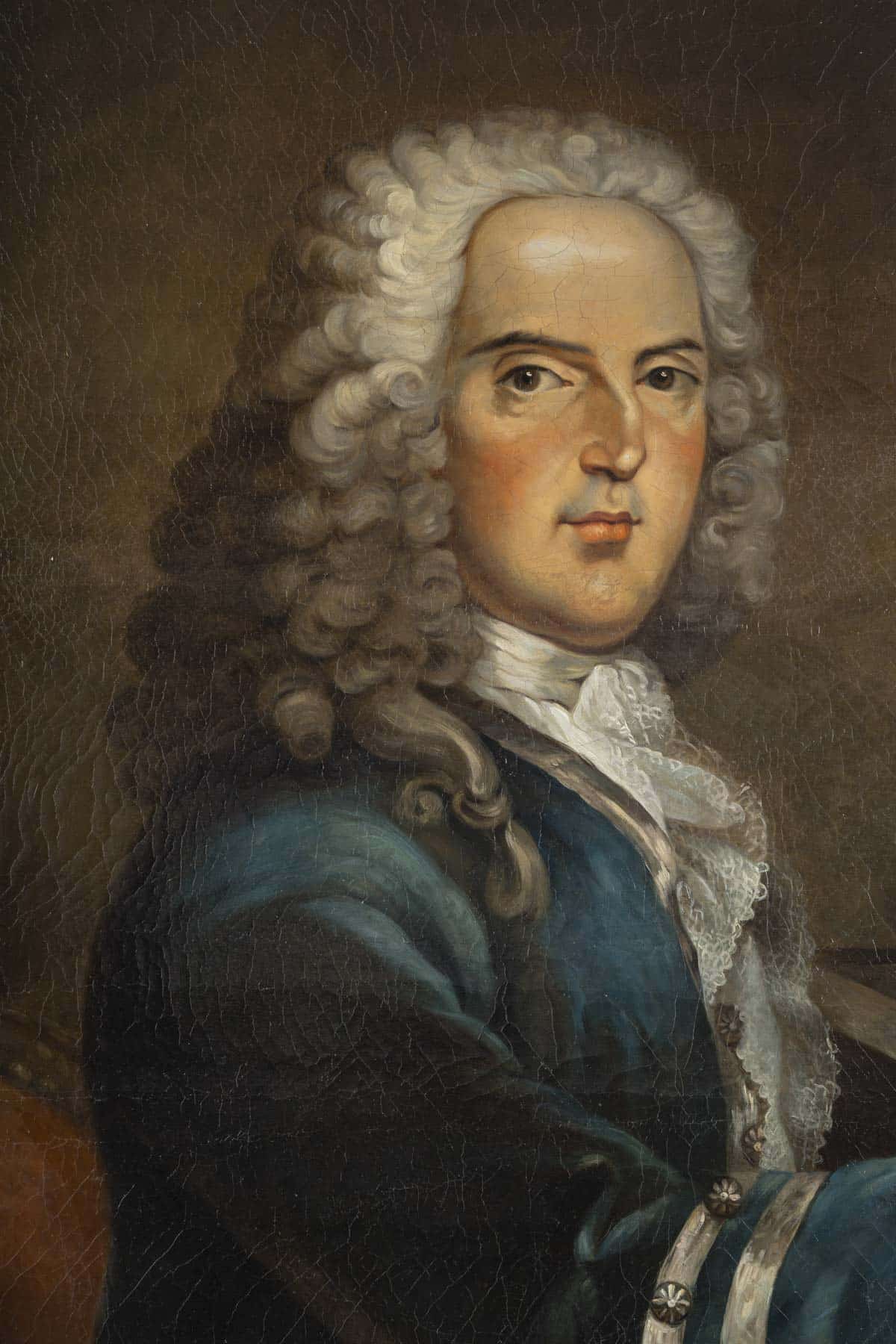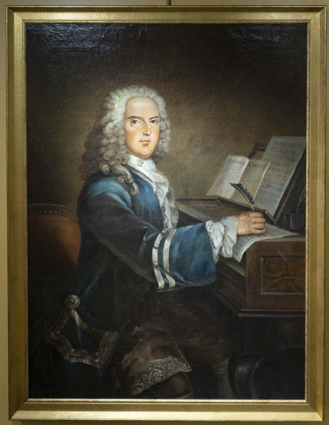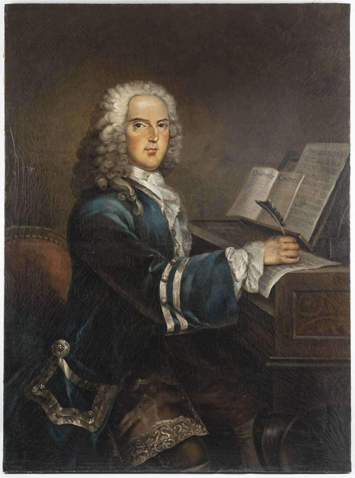 Le peintre présente l’artiste de trois-quarts vêtu d’une élégante redingote en velour bleu sur un gilet de soie rose garni de dentelle. Il est assis devant son clavecin, une partition « cantate d’Orphée » posée sur son chevalet. Notre portrait a été repris par Louis-Simon LEMPEREUR graveur d’interprétation né en 1728 et mort en 1807qui fut graveur du Roi. Cette gravure est conservée à la BNF.