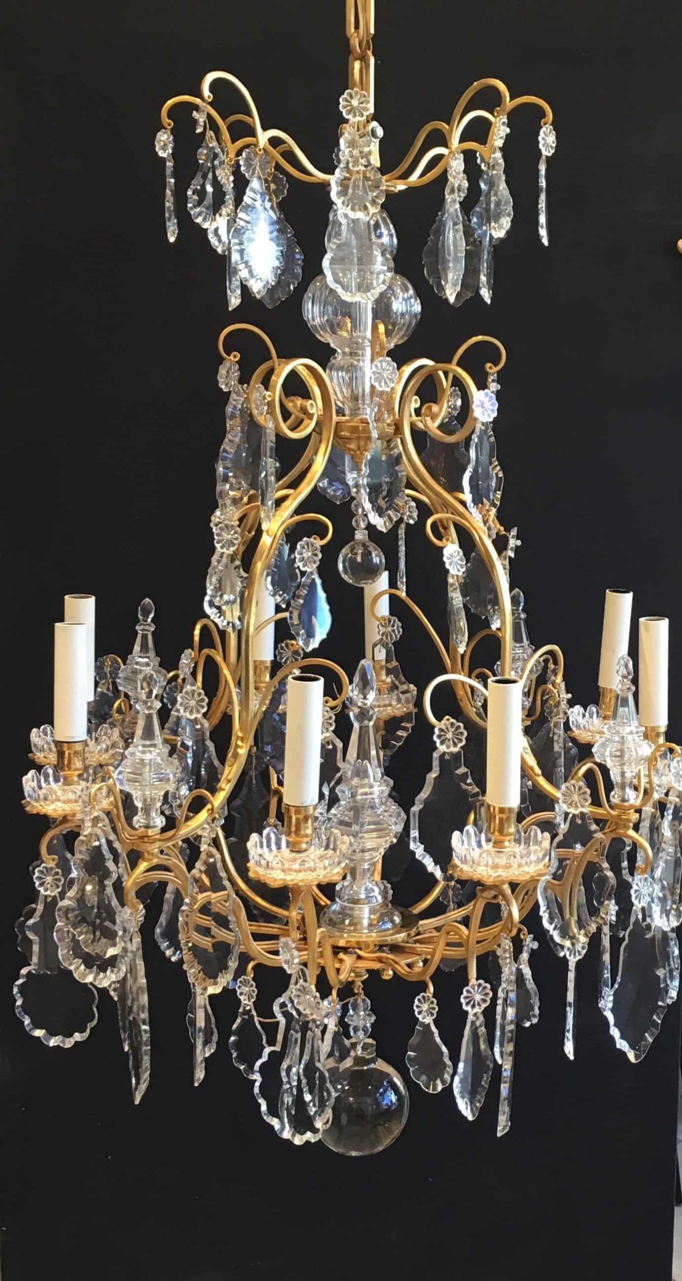 Élégant lustre à 8 bras de lumière en bronze doré et cristal , chaque bassin signé de la maison baccarat.