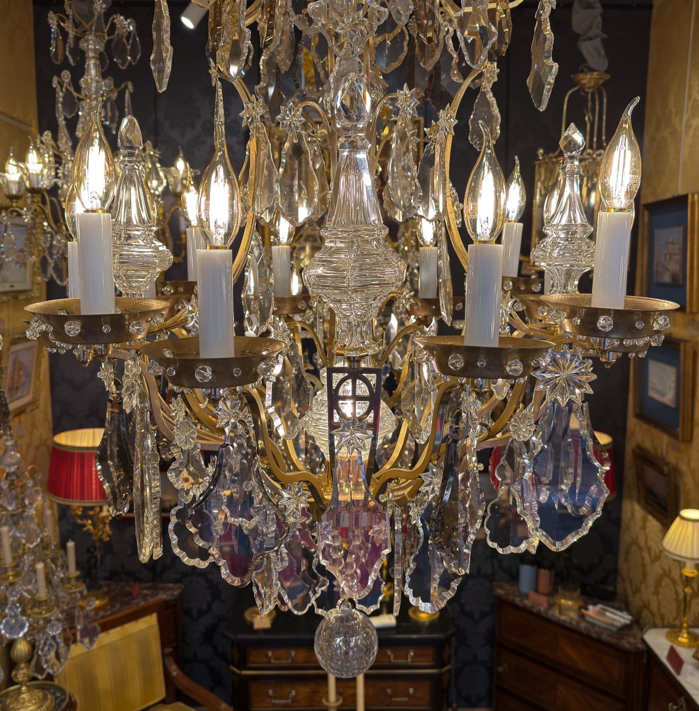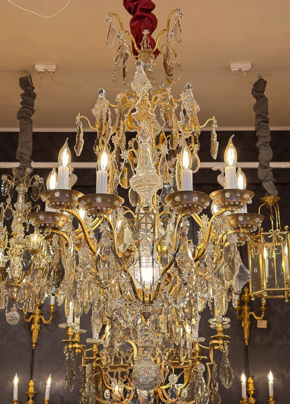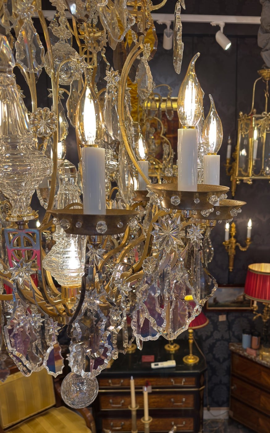 This French chandelier, inspired by the designs of Maison Baguès, embodies the elegance and refinement of the Louis XV cage style. It features eight peripheral crystal daggers and a large central dagger, along with an interior crystal ball. The upper section is adorned with large crystal plaques, numerous stars, and rosettes, culminating in a cut crystal finial. The chandelier illuminates with twelve candle arms, each fitted with electrification and opaline false candles, compliant with European standards. Adaptation to American standards is available upon request.