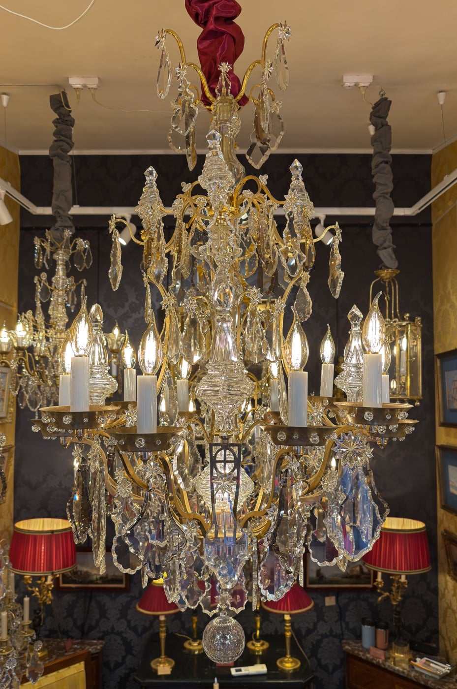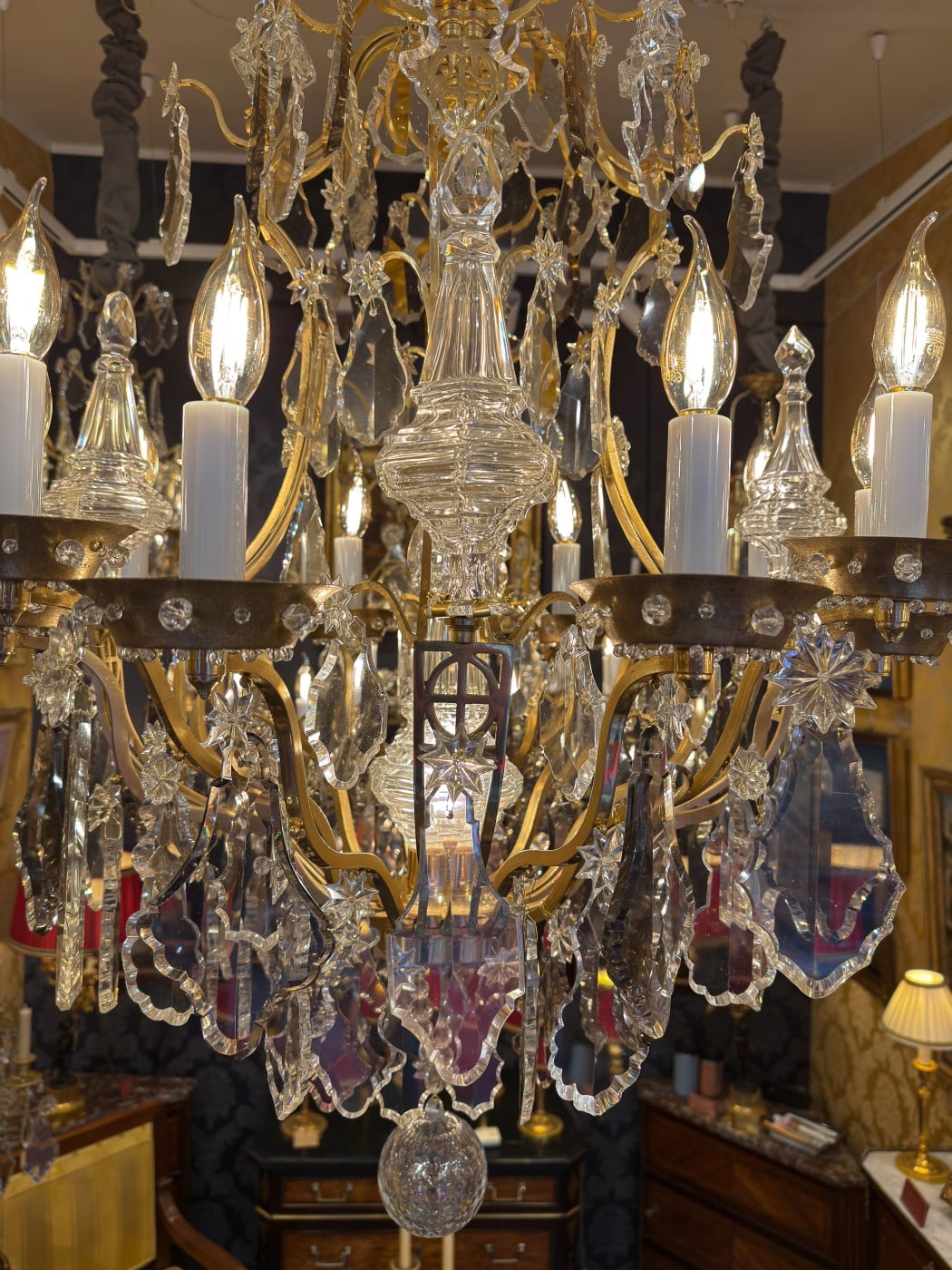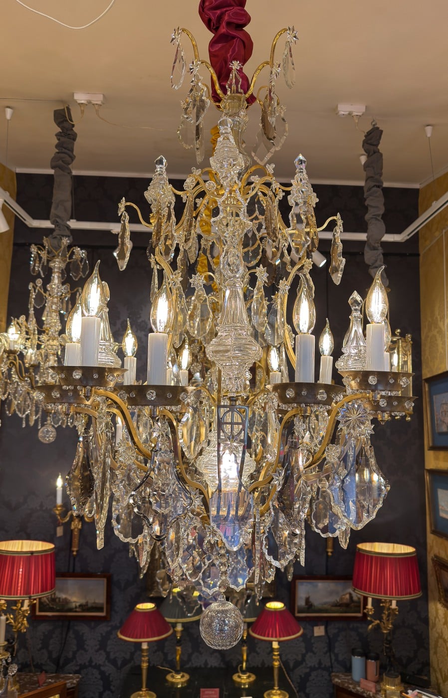 This French chandelier, inspired by the designs of Maison Baguès, embodies the elegance and refinement of the Louis XV cage style. It features eight peripheral crystal daggers and a large central dagger, along with an interior crystal ball. The upper section is adorned with large crystal plaques, numerous stars, and rosettes, culminating in a cut crystal finial. The chandelier illuminates with twelve candle arms, each fitted with electrification and opaline false candles, compliant with European standards. Adaptation to American standards is available upon request.