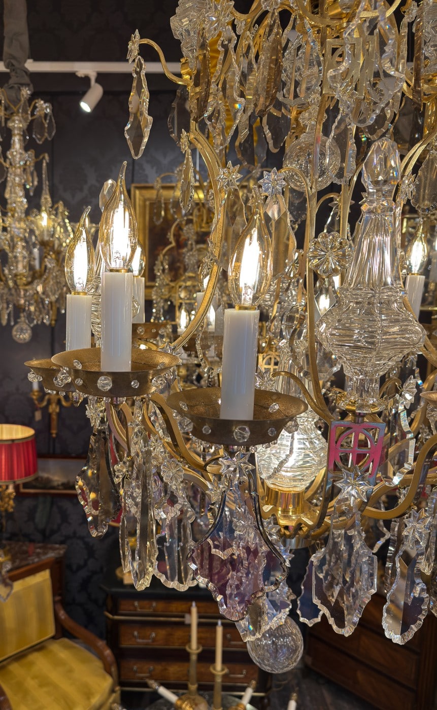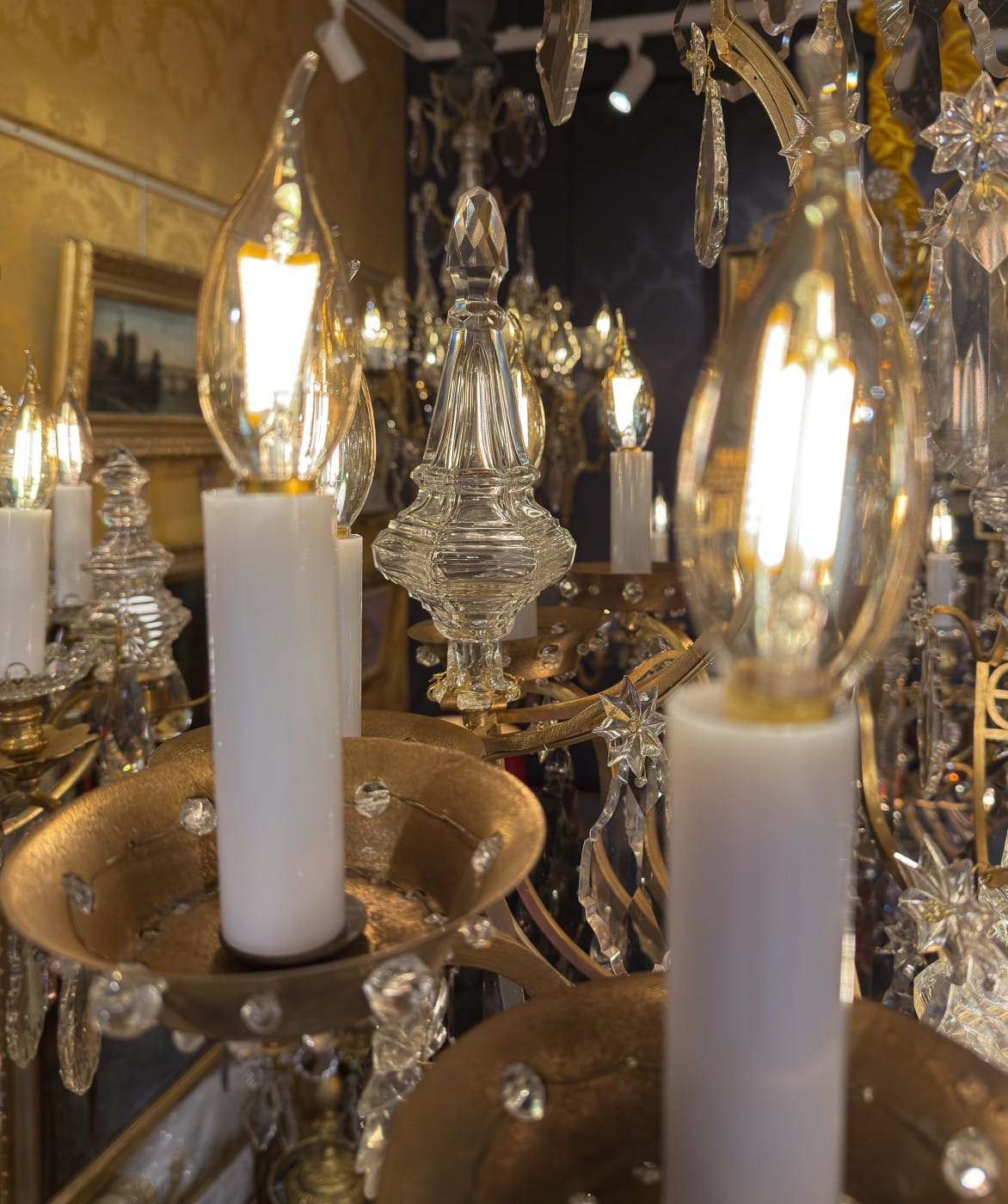 Il éclaire par douze bras de lumière en périphérie, chacun muni d’un système d’électrification et de fausse bougie en opaline, conforme aux normes européennes. Il peut également fonctionner sur demande avec les standards américains à l’aide d’un adaptateur.