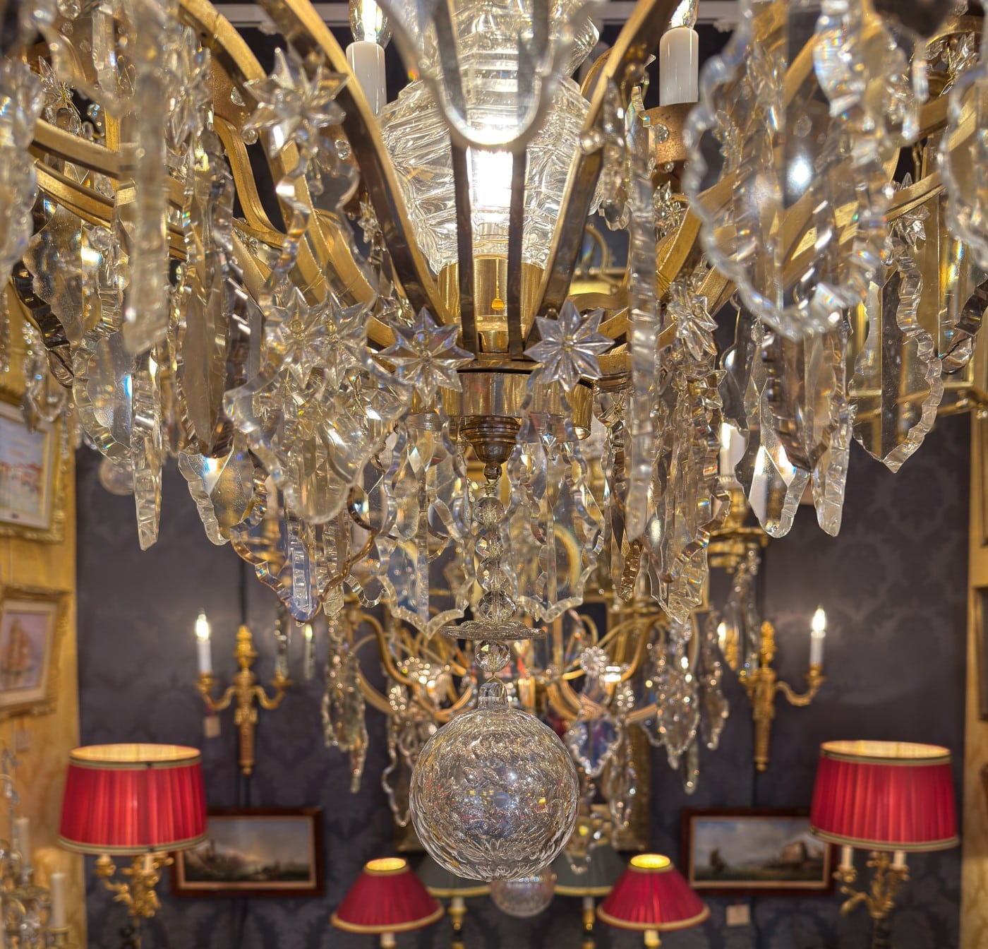 Ce lustre français dans le gout des lustre de la Maison Baguès, de forme cage de style Louis XV se distingue par son élégance et son raffinement. Il est composé de huit poignards disposés en périphérie et d’un grand poignard central éclairant, ainsi que d’une boule en cristal intérieur. En partie haute. Le lustre est orné de grandes plaquettes, de nombreuses étoiles et rosaces en cristal taillé, et se termine par une boule en cristal taillé.