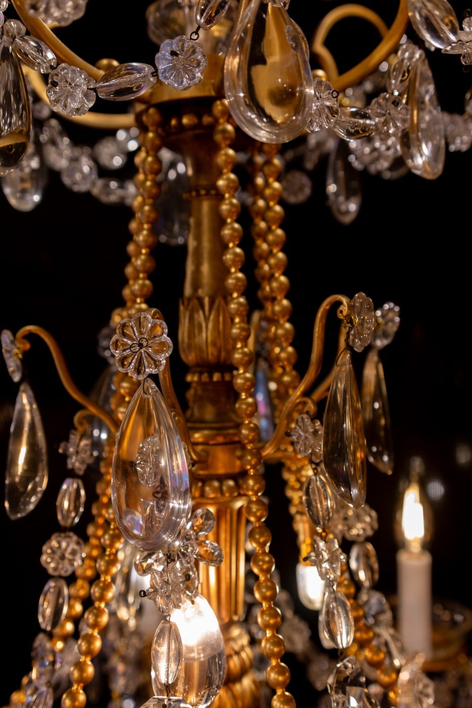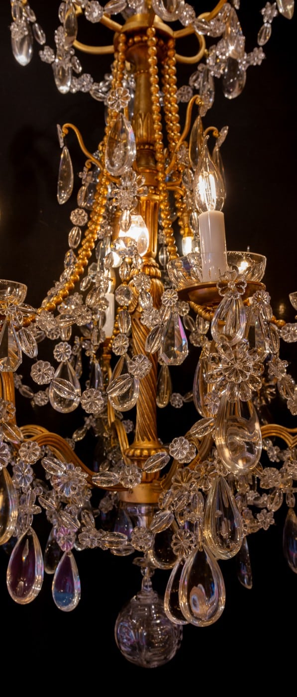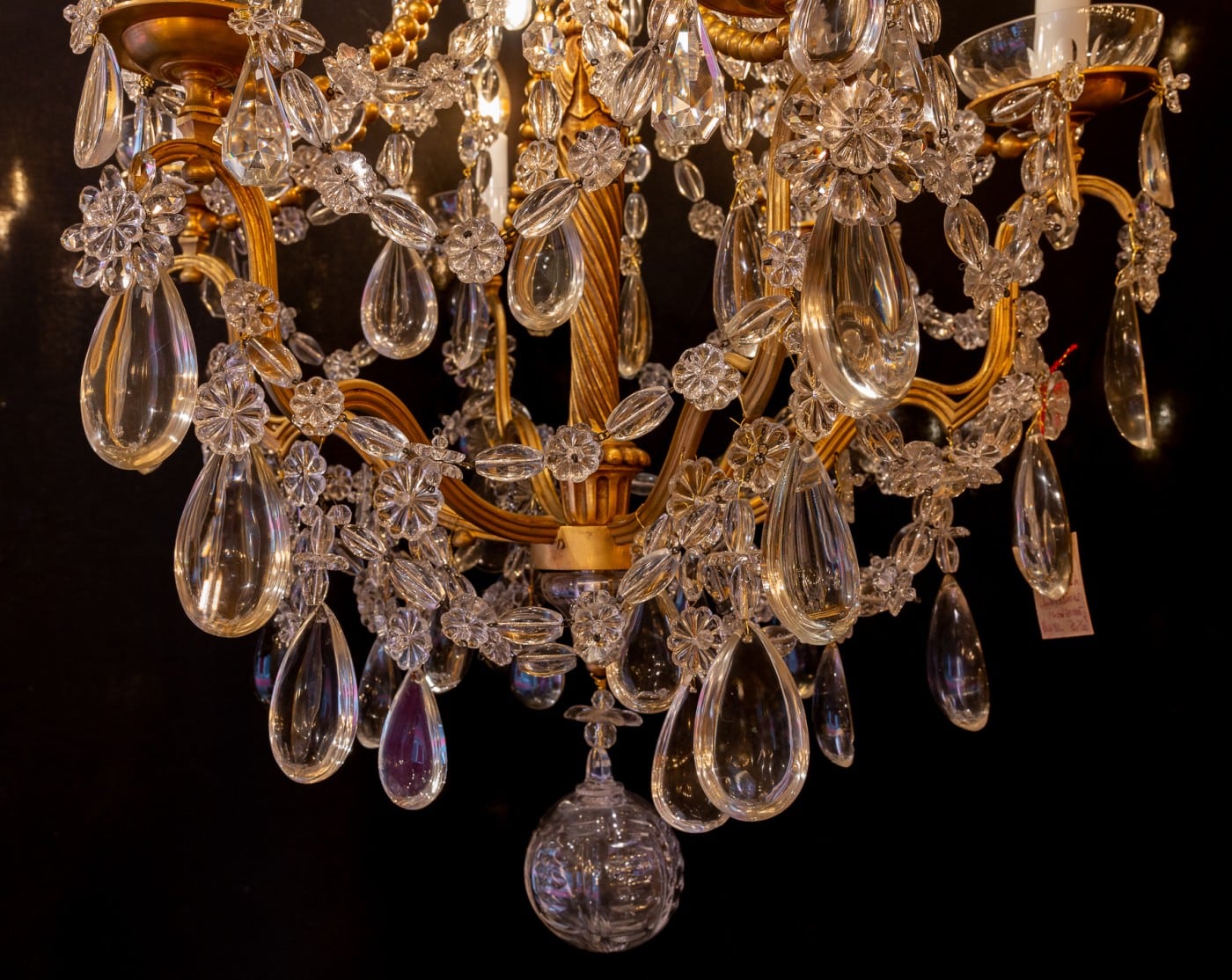 Notre lustre propose un magnifique décor de cristal taillé de couleur blanc composé de nombreuses demi-poires, amandes, fleurs, rosaces et une superbe descente de perles ciselées en bronze doré.