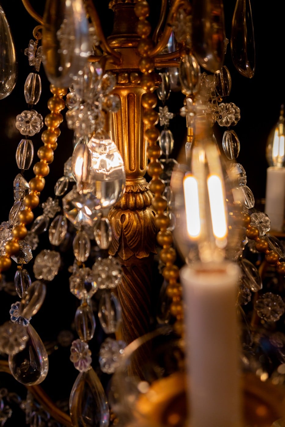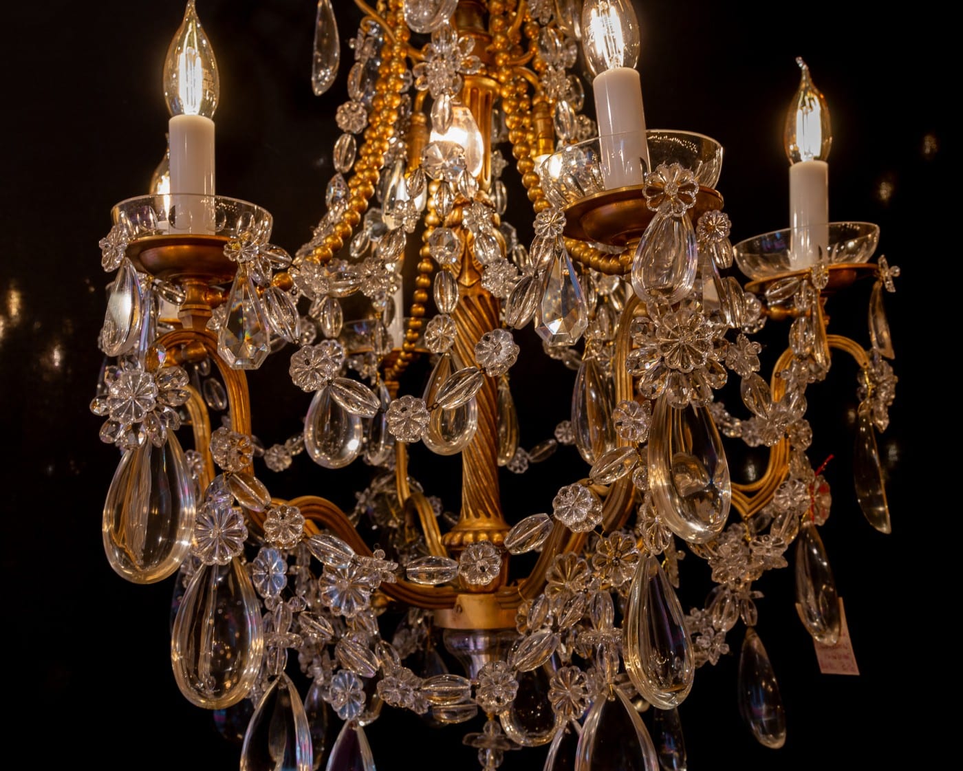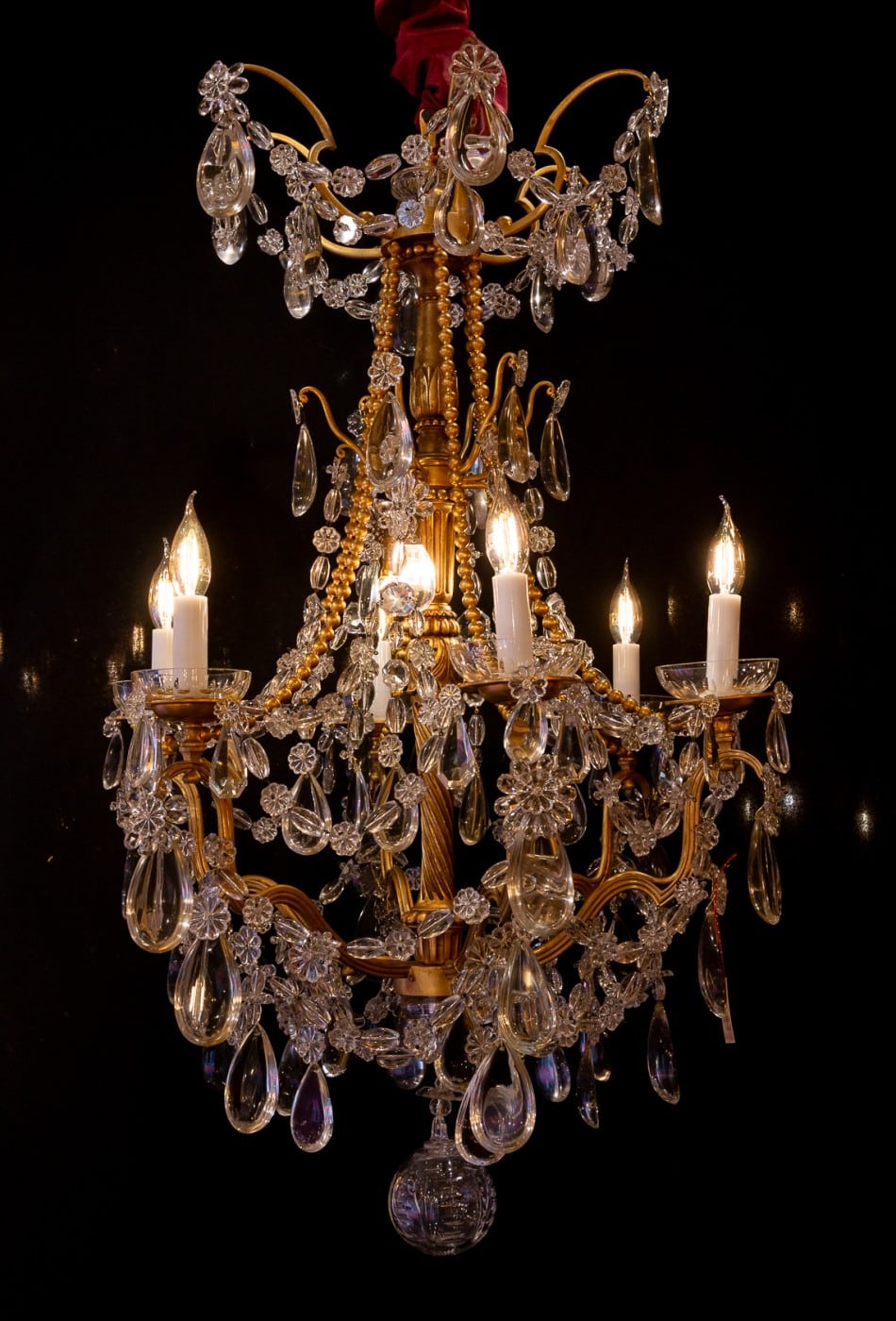 Notre lustre propose un magnifique décor de cristal taillé de couleur blanc composé de nombreuses demi-poires, amandes, fleurs, rosaces et une superbe descente de perles ciselées en bronze doré.