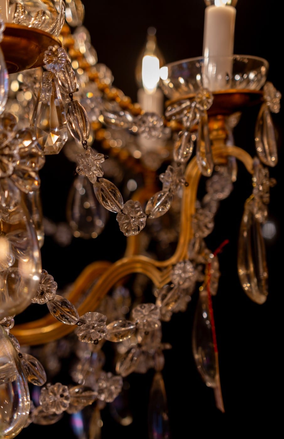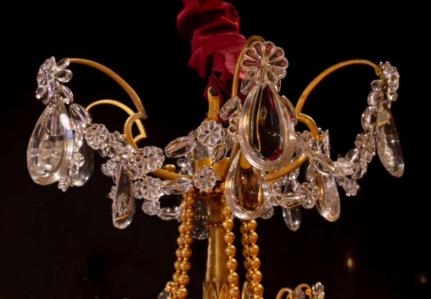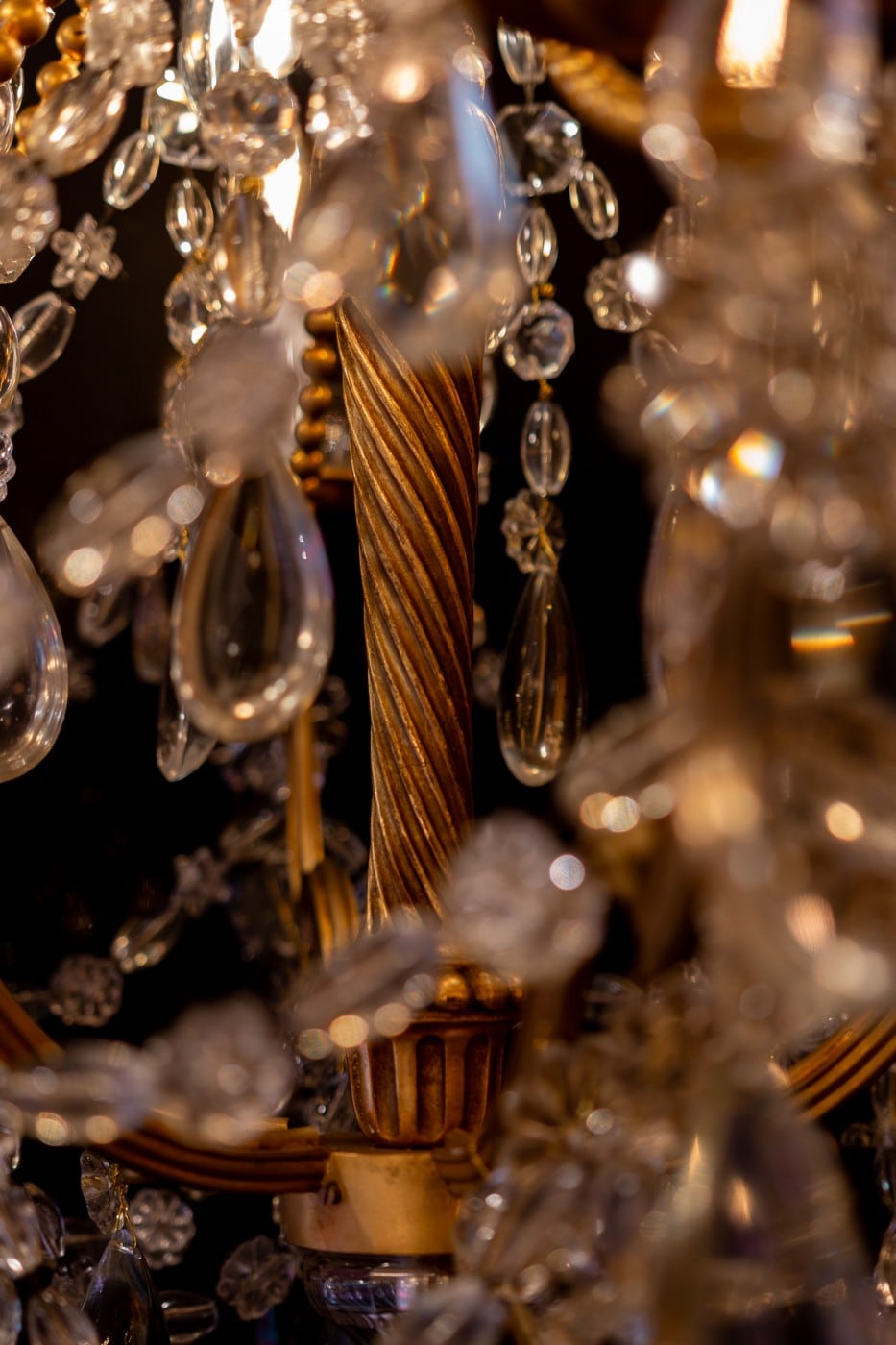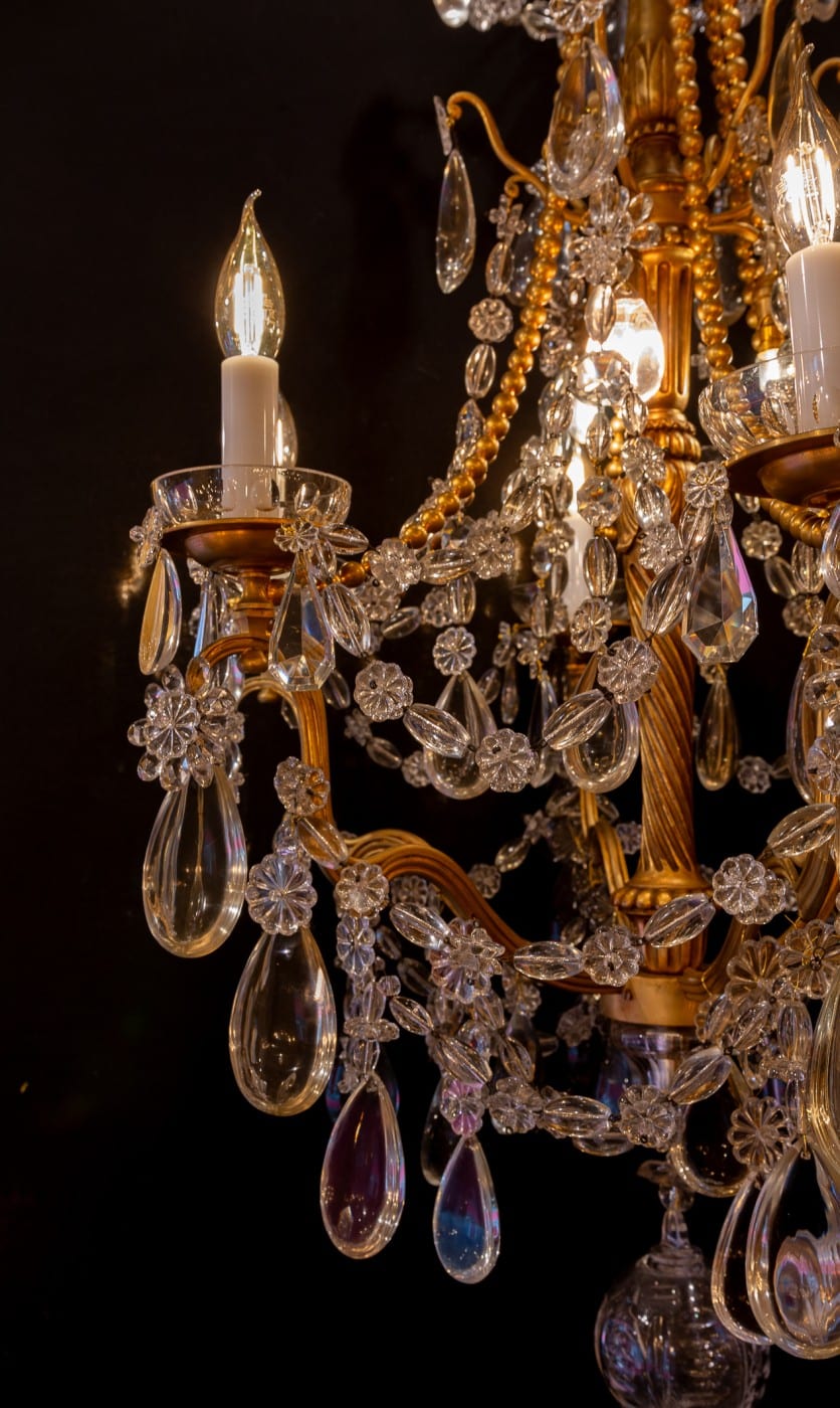 Our chandelier has a magnificent white cut-crystal décor featuring numerous half-pears, almonds, flowers, rosettes and a superb descent of pearls chased in gilded bronze.