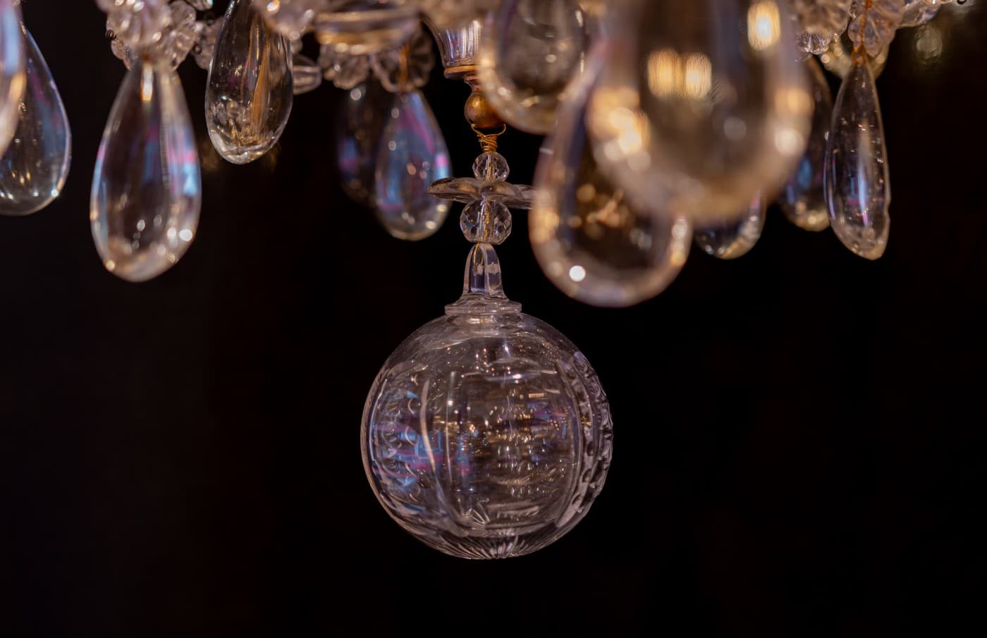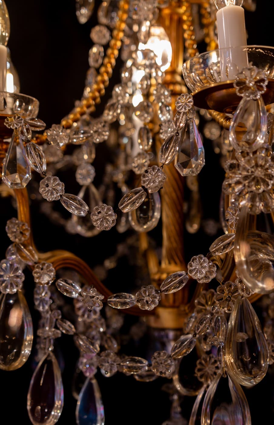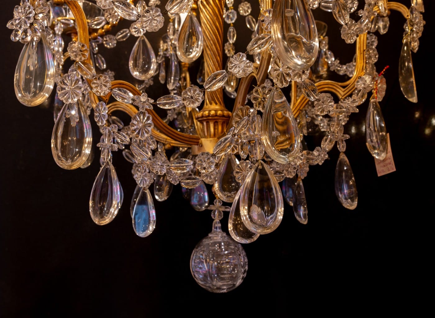 Our chandelier has a magnificent white cut-crystal décor featuring numerous half-pears, almonds, flowers, rosettes and a superb descent of pearls chased in gilded bronze.