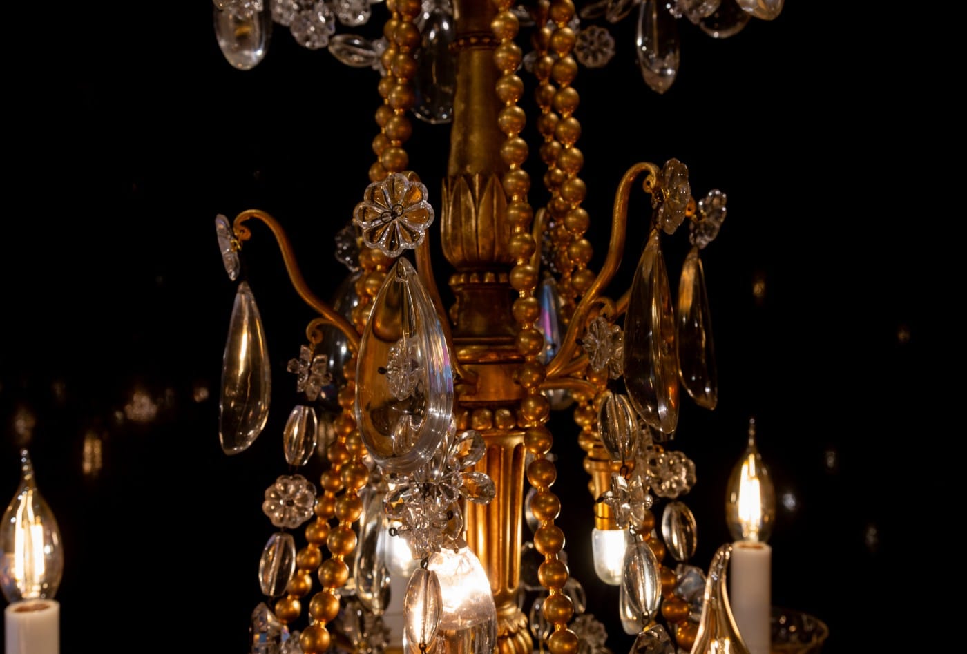 Un élégant et beau lustre en bois sculpté dans sa dorure d’époque et bronze finement ciselé dans sa dorure d’origine (petites usures), éclairant par six bras de lumière en périphérie et trois petites lumières intérieures.
