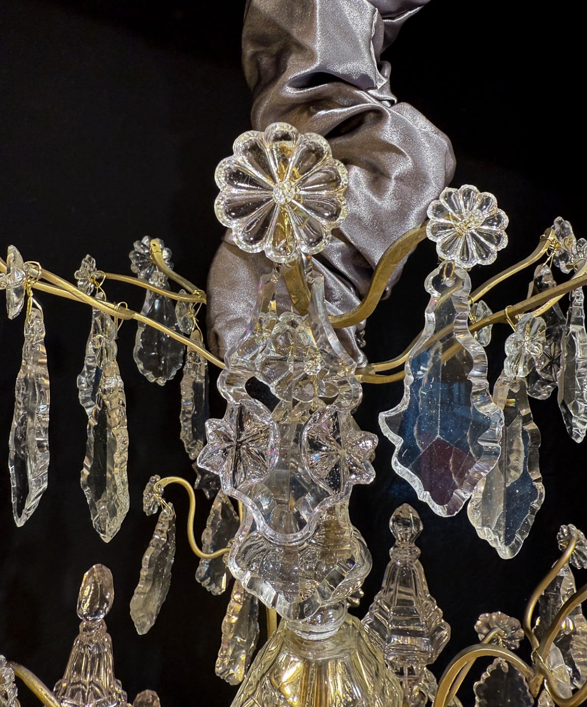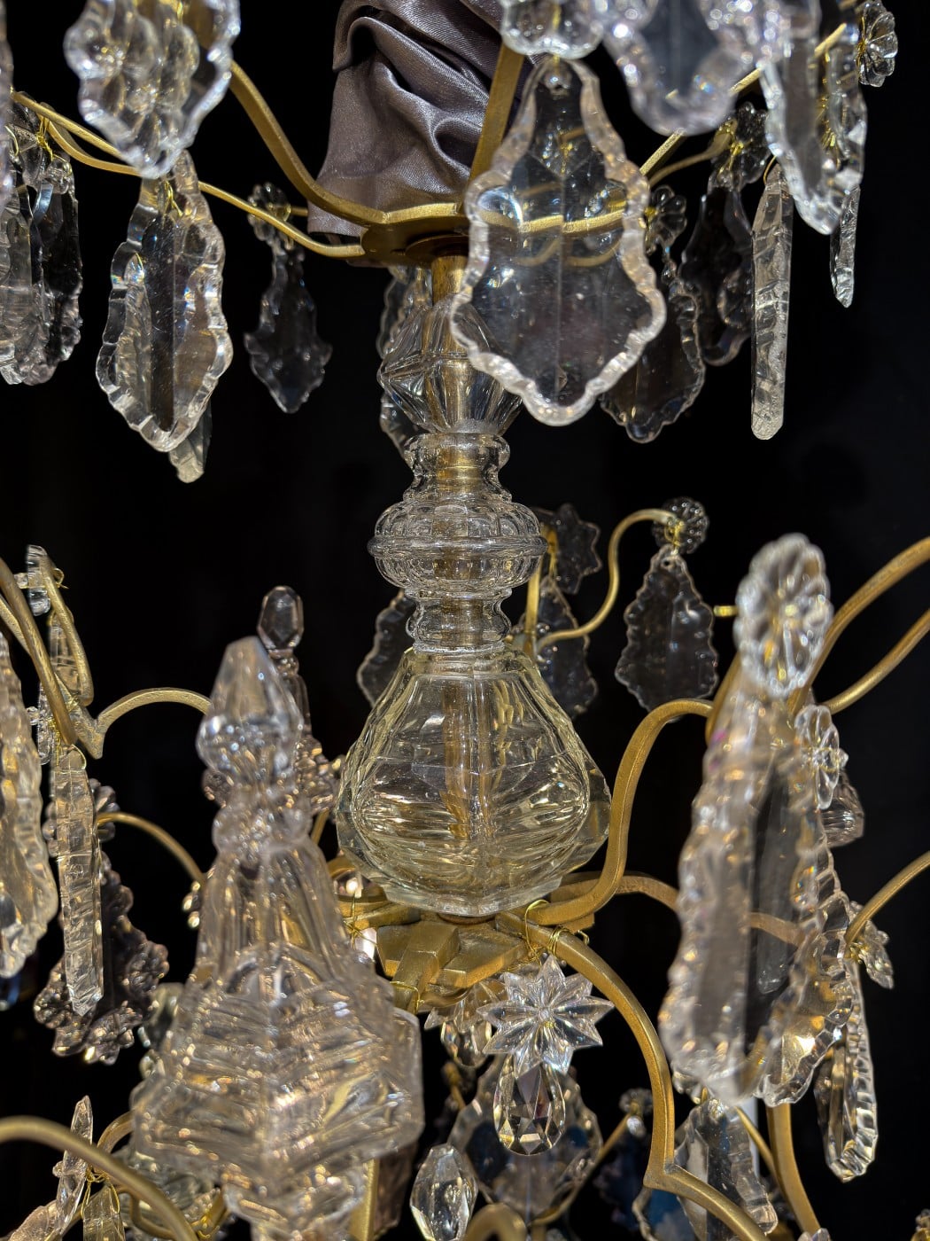 Ce lustre de forme cage du dernier tiers du XVIIIeme siècle se distingue par son élégance et son raffinement. Il est composé de neuf poignards disposés en périphérie et d’un grand poignard à l’intérieur. Le lustre est orné de grandes plaquettes, de nombreuses étoiles et rosaces en cristal taillé, et se termine par une boule en cristal taillé.