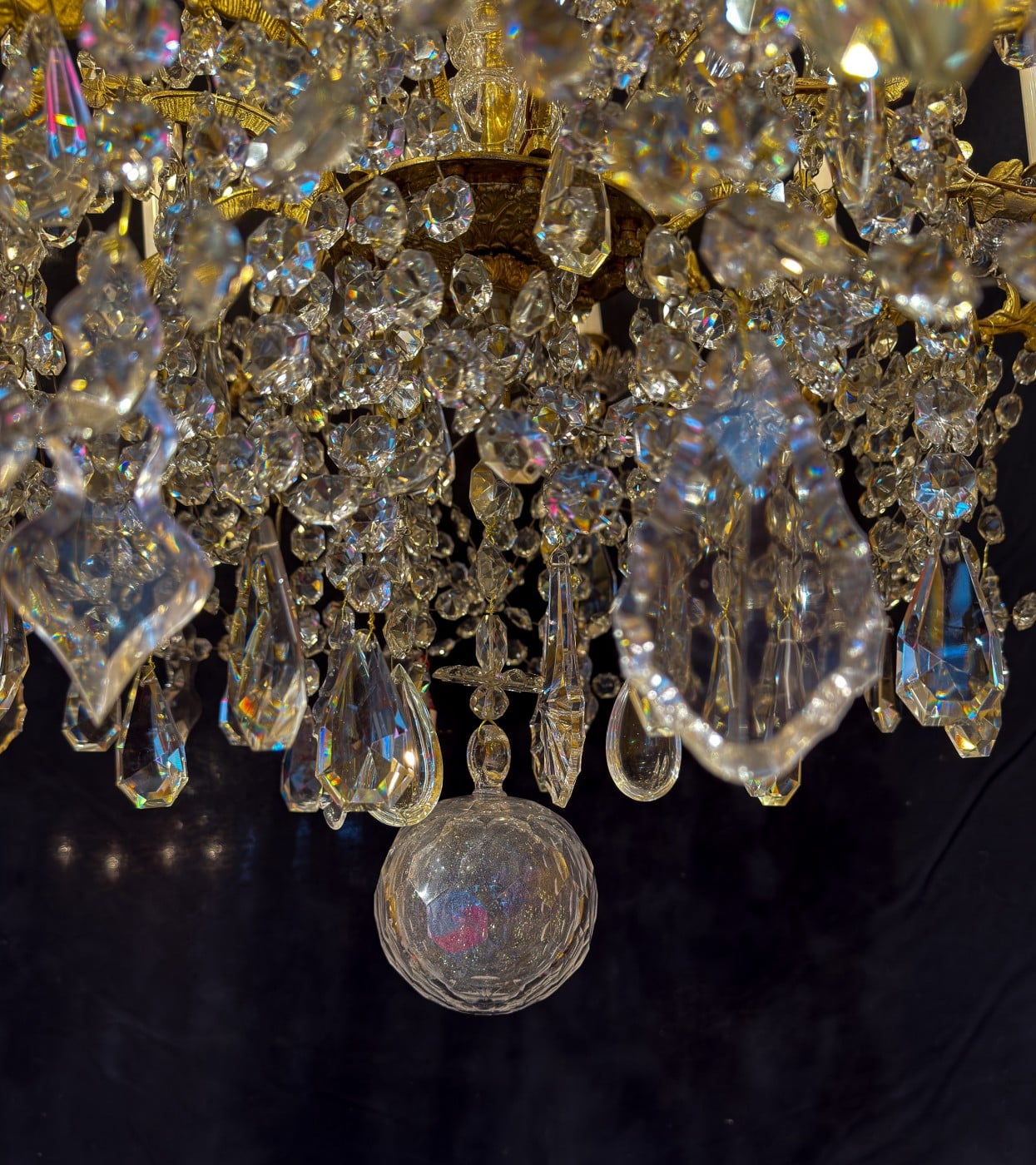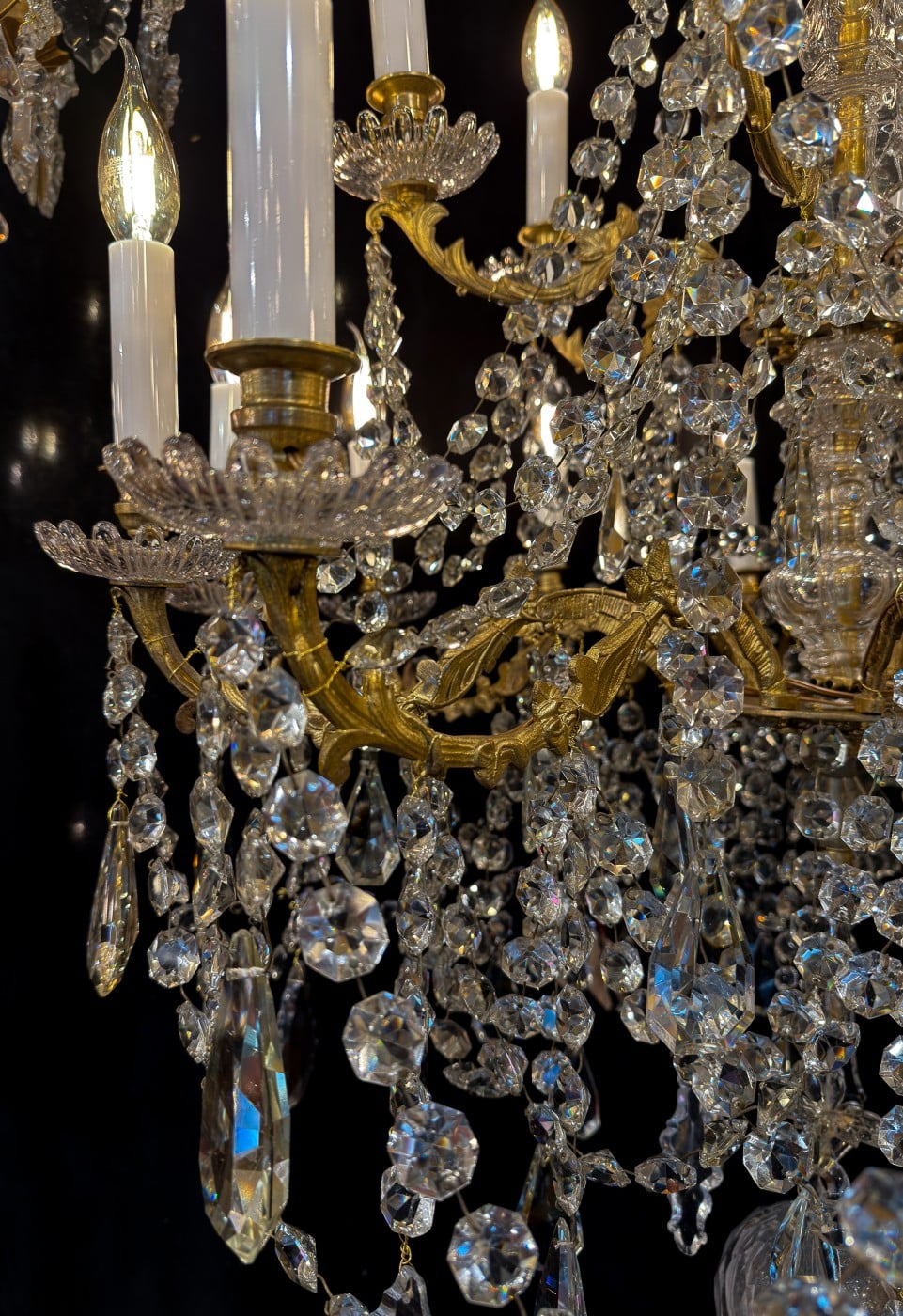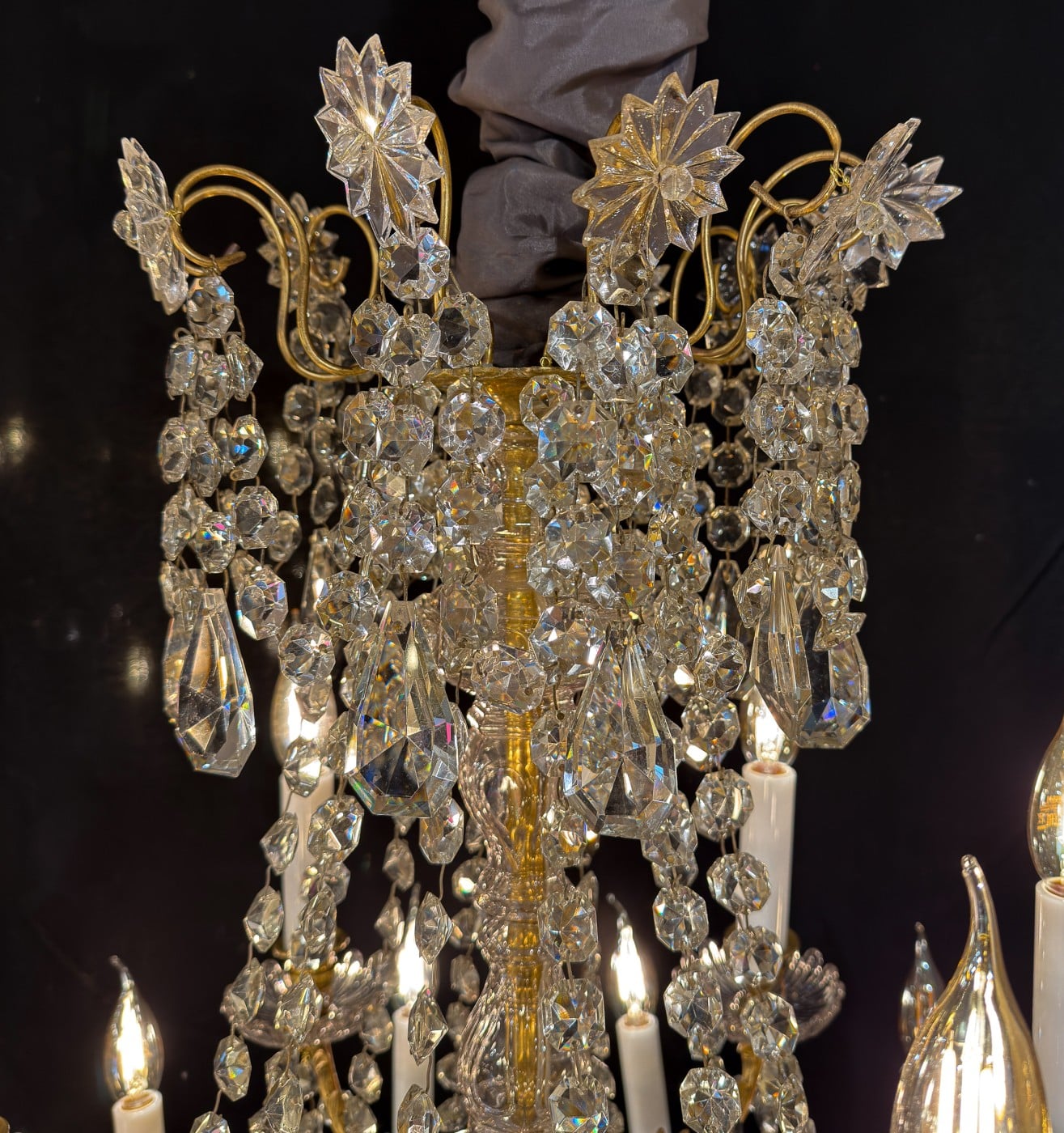 An elegant and decorative Louis XVI-style stem chandelier in gilt bronze, featuring eighteen candle arms arranged on two tiers. The chandelier is adorned with octagonal drops, star-shaped crystals, and clear cut-crystal elements. At its center, a tiered arrangement of cut-crystal « bottles » cascades down, culminating in a large, finely cut crystal finial.