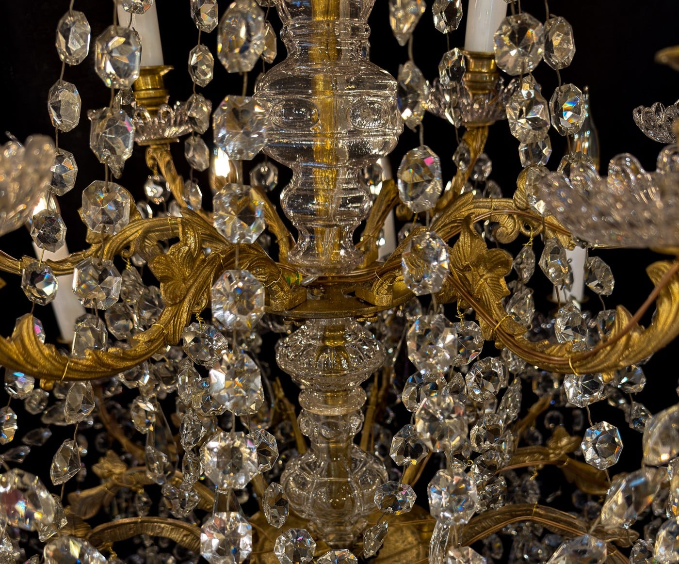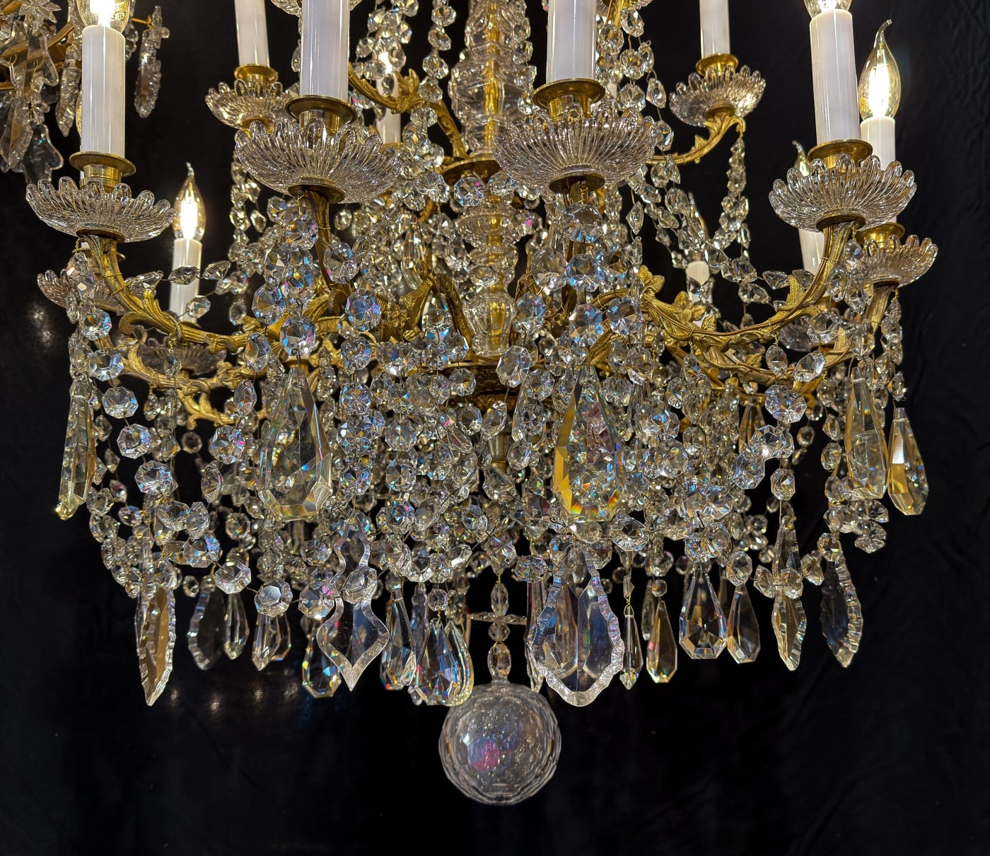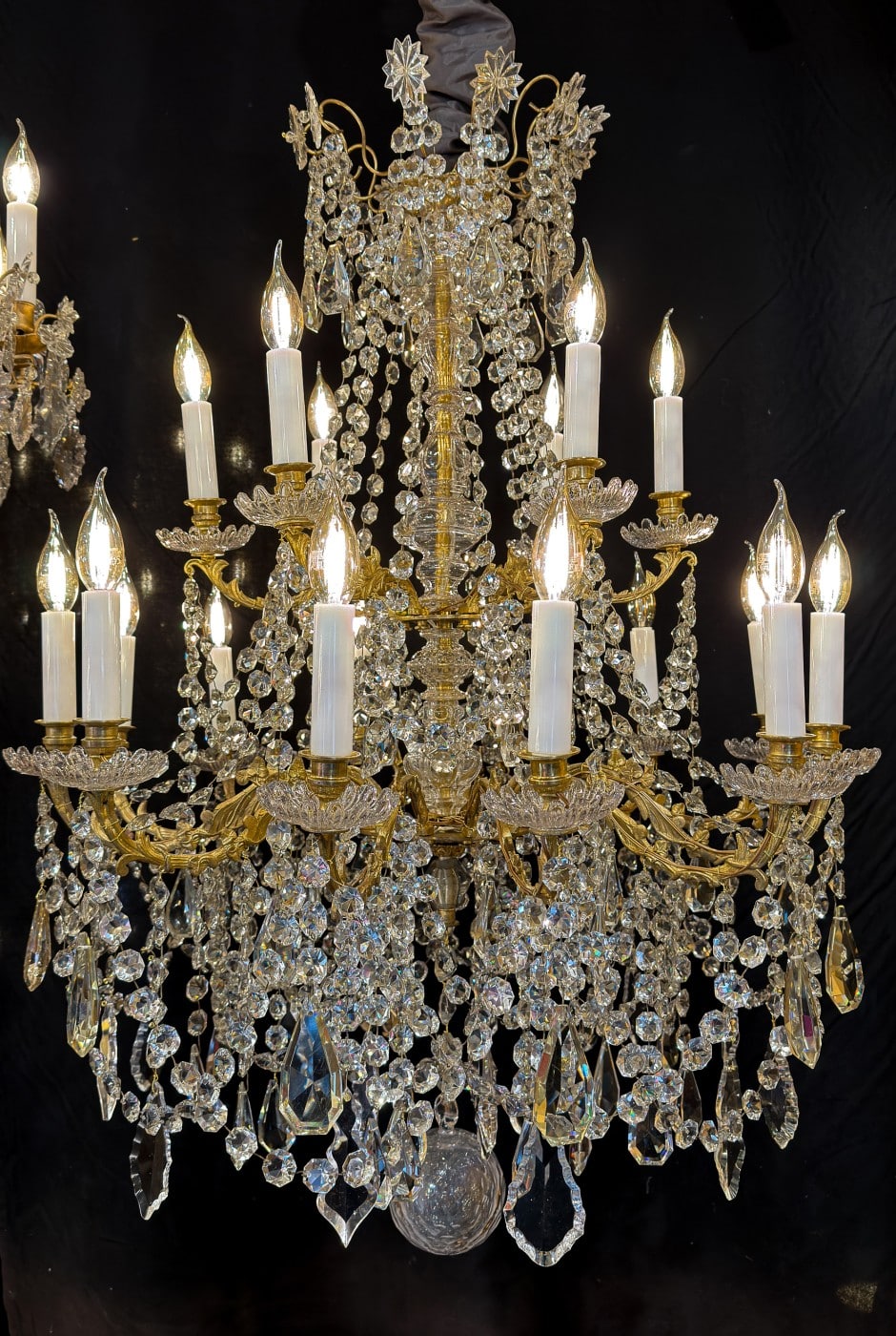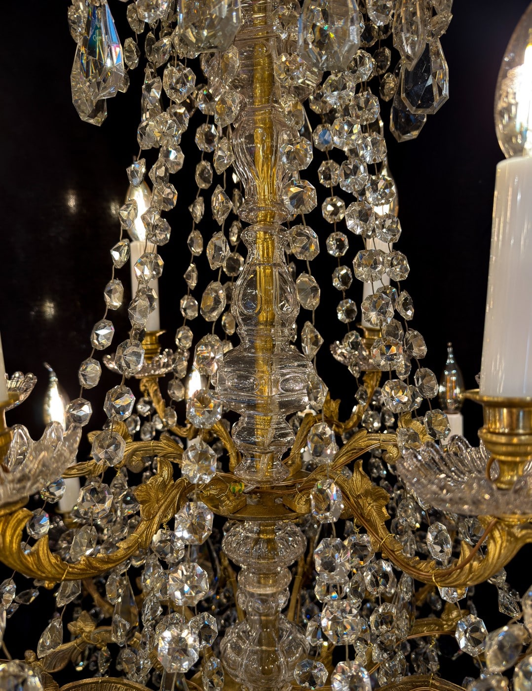 An elegant and decorative Louis XVI-style stem chandelier in gilt bronze, featuring eighteen candle arms arranged on two tiers. The chandelier is adorned with octagonal drops, star-shaped crystals, and clear cut-crystal elements. At its center, a tiered arrangement of cut-crystal « bottles » cascades down, culminating in a large, finely cut crystal finial.