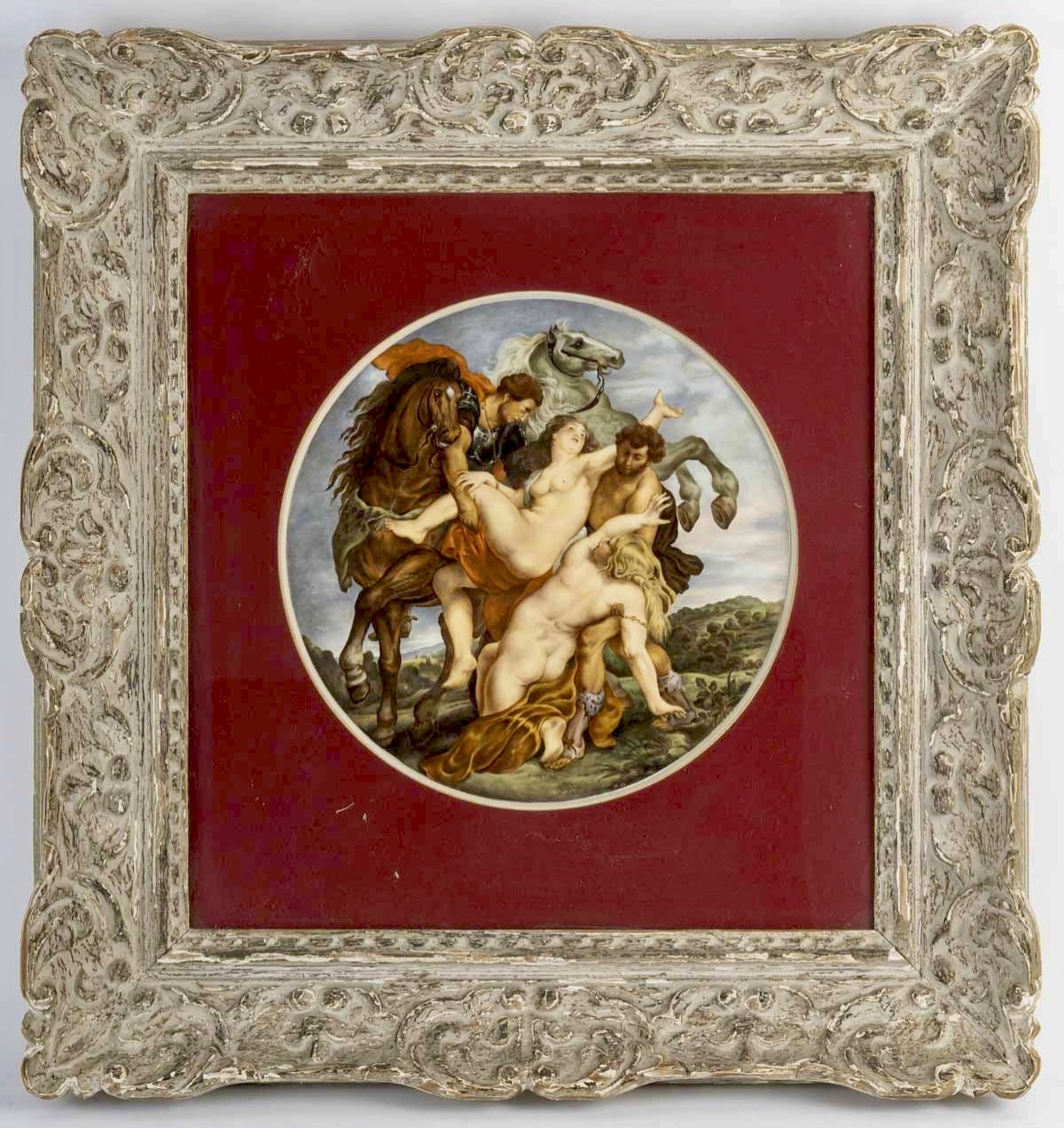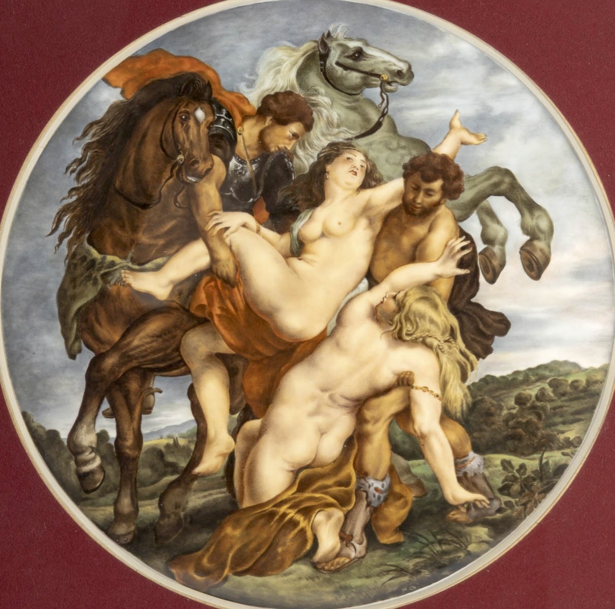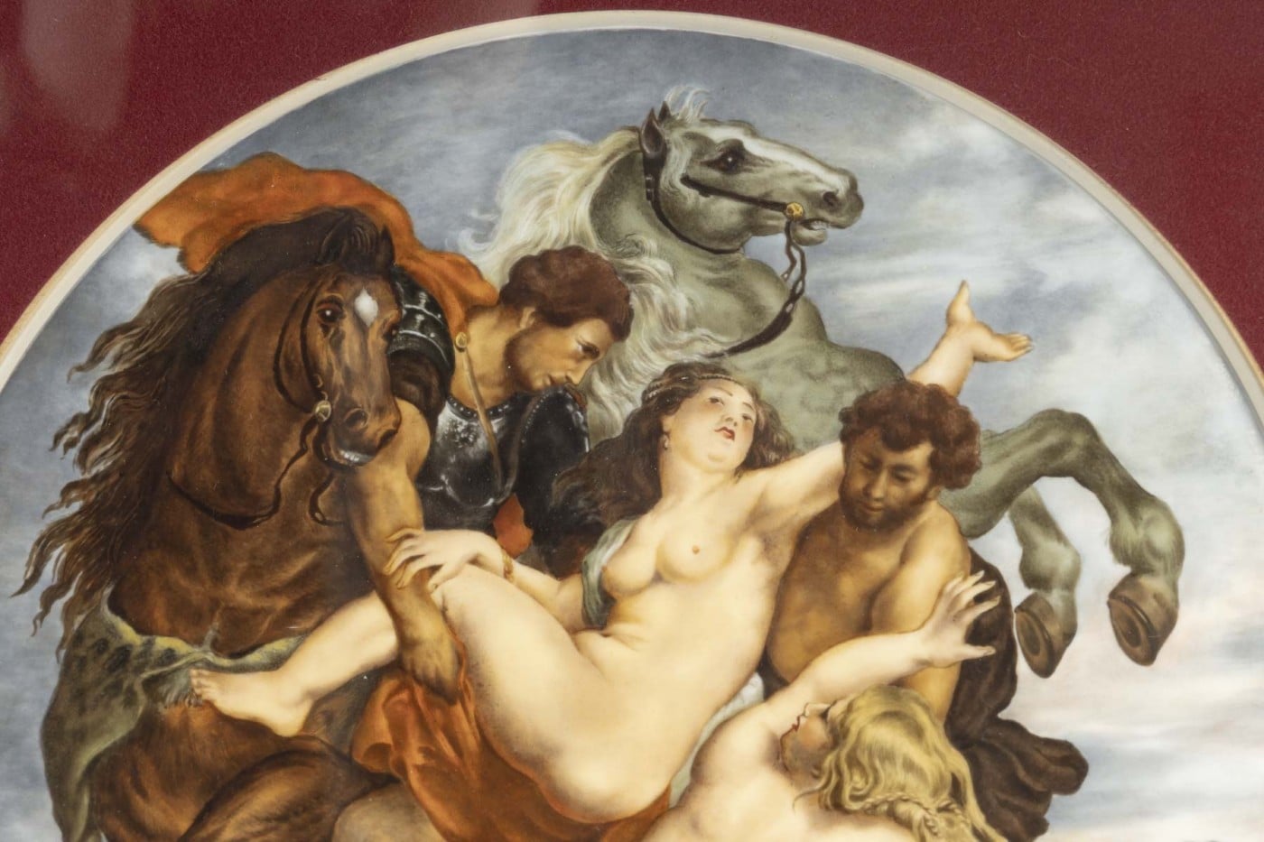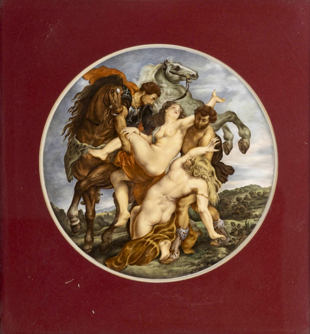 Rare plaque de forme ronde en porcelaine de Sèvres finement peinte à la main représentant » l’enlèvement des filles de Leucippe » d’après Paul Rubens.