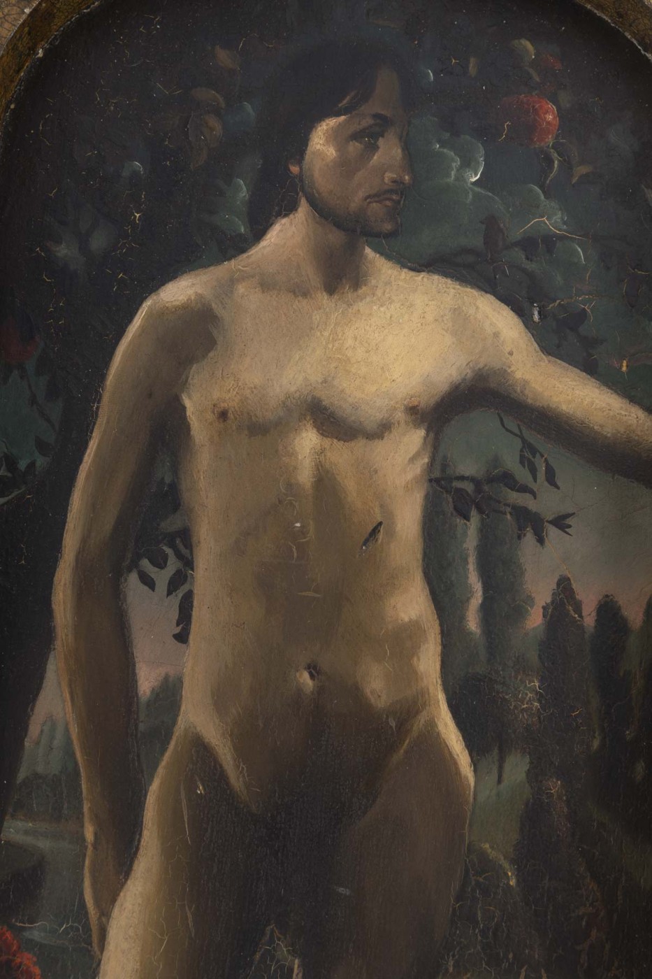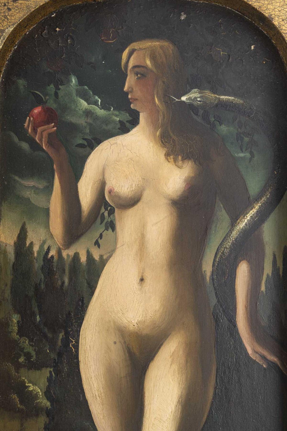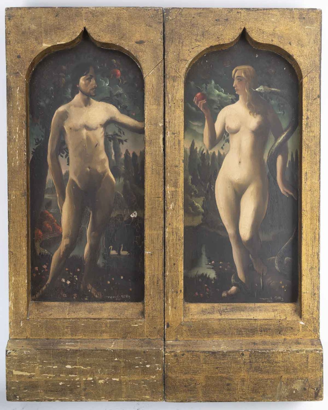 Ce remarquable diptyque représente Adam et Eve dans le Jardin d’Eden, traités dans une composition verticale évoquant les retables anciens flamands. Adam, à gauche, se tient dans une posture retenue, son regard dirigé vers Ève, tandis que celle-ci, à droite, tient la pomme, le serpent enroulé autour de son bras, incarnation de la tentation.