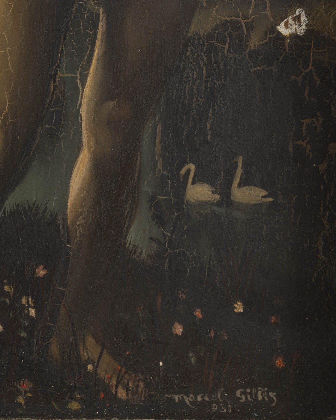 Le paysage stylisé, animé d’un lac paisible, de cygnes et d’une végétation dense, crée une atmosphère silencieuse et intemporelle, caractéristique de la peinture symboliste belge de l’entre-deux-guerres.