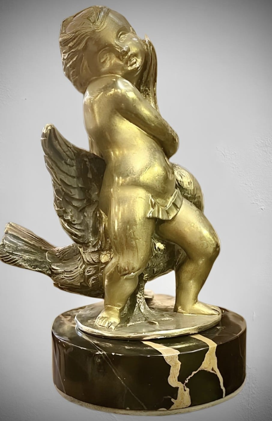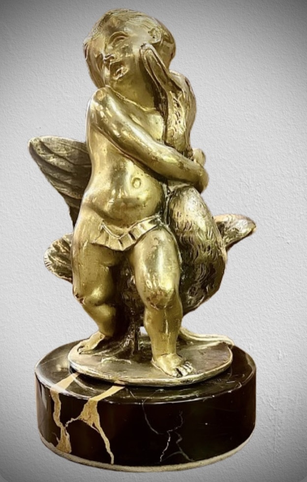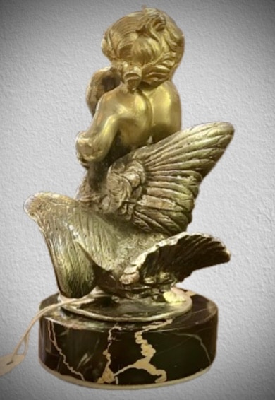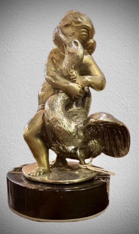 MASCOTTE AUTOMOBILE EN BRONZE À DOUBLE PATINE OR ET ARGENT REPRÉSENTANT UN AMOUR JOUANT AVEC UN CYGNE OU PLUS CERTAINEMENT « LEDA ET LE CYGNE JEUNE »