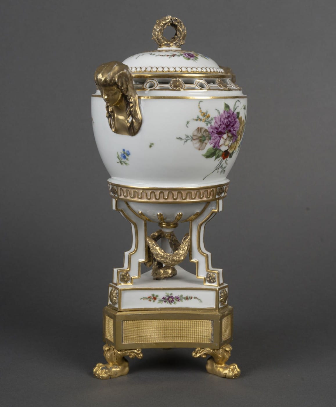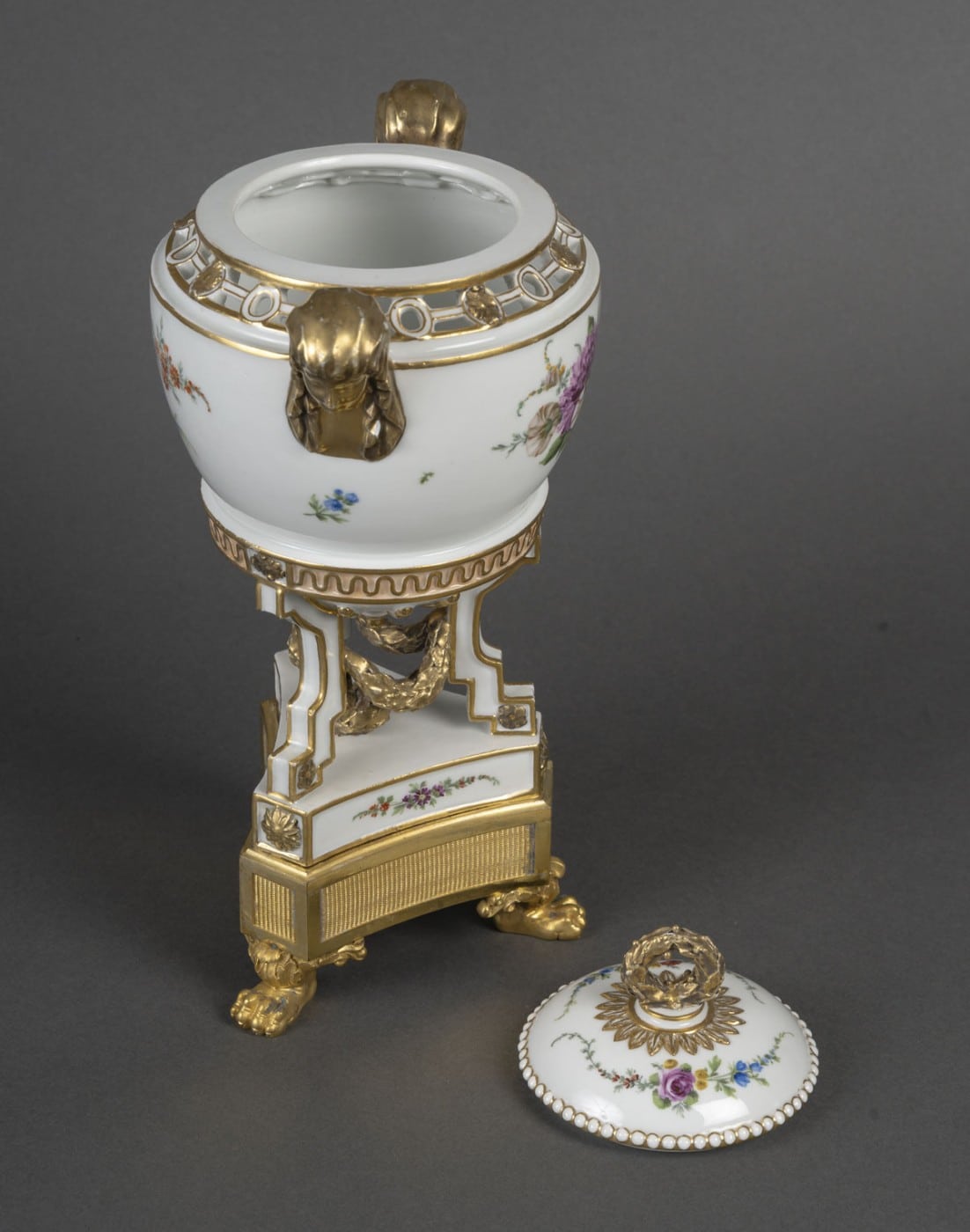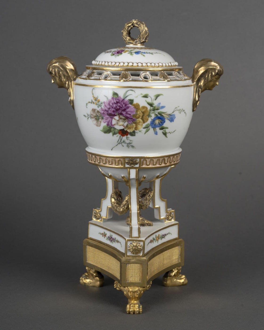 Pot pourri tripode en porcelaine blanche à rehauts dorés, la base de forme triangulaire peint de bouquet de fleurs est terminée aux angles par des fleurs doré. Les montants en escalier faisant jouer un tore de laurier au centre. Garni d’un culot, le vase souligné d’une frise de vagues. La panse à décor de deux bouquets de fleurs.