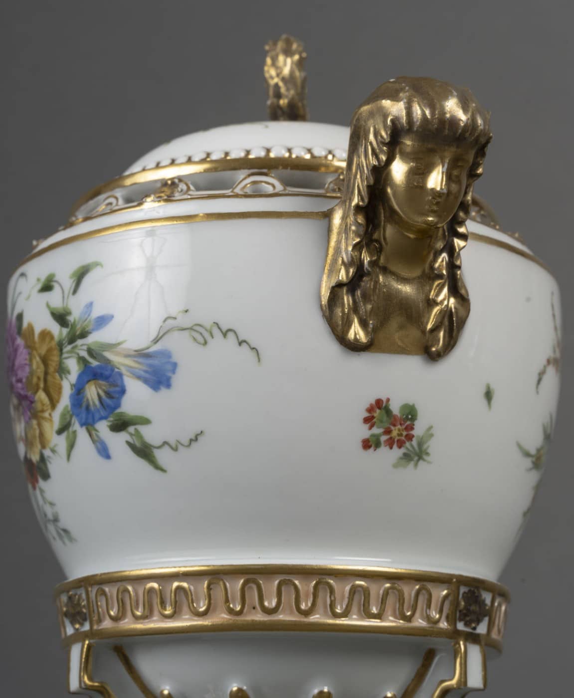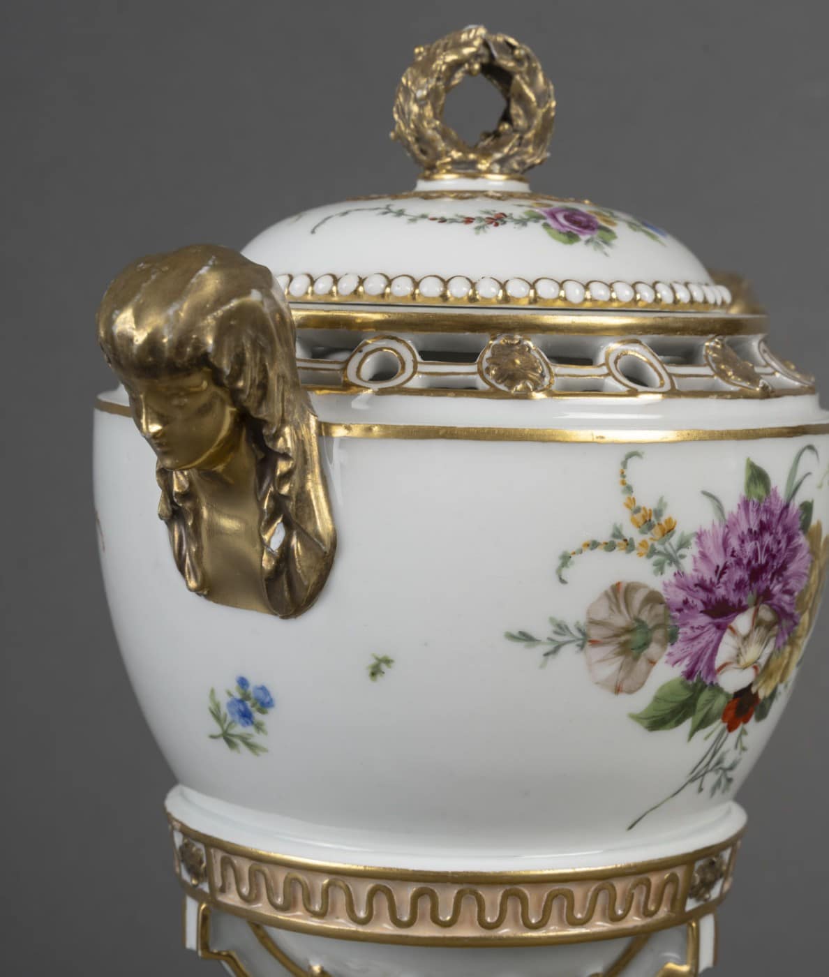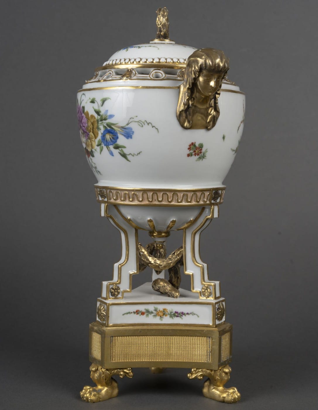 Pot pourri tripode en porcelaine blanche à rehauts dorés, la base de forme triangulaire peint de bouquet de fleurs est terminée aux angles par des fleurs doré. Les montants en escalier faisant jouer un tore de laurier au centre. Garni d’un culot, le vase souligné d’une frise de vagues. La panse à décor de deux bouquets de fleurs.