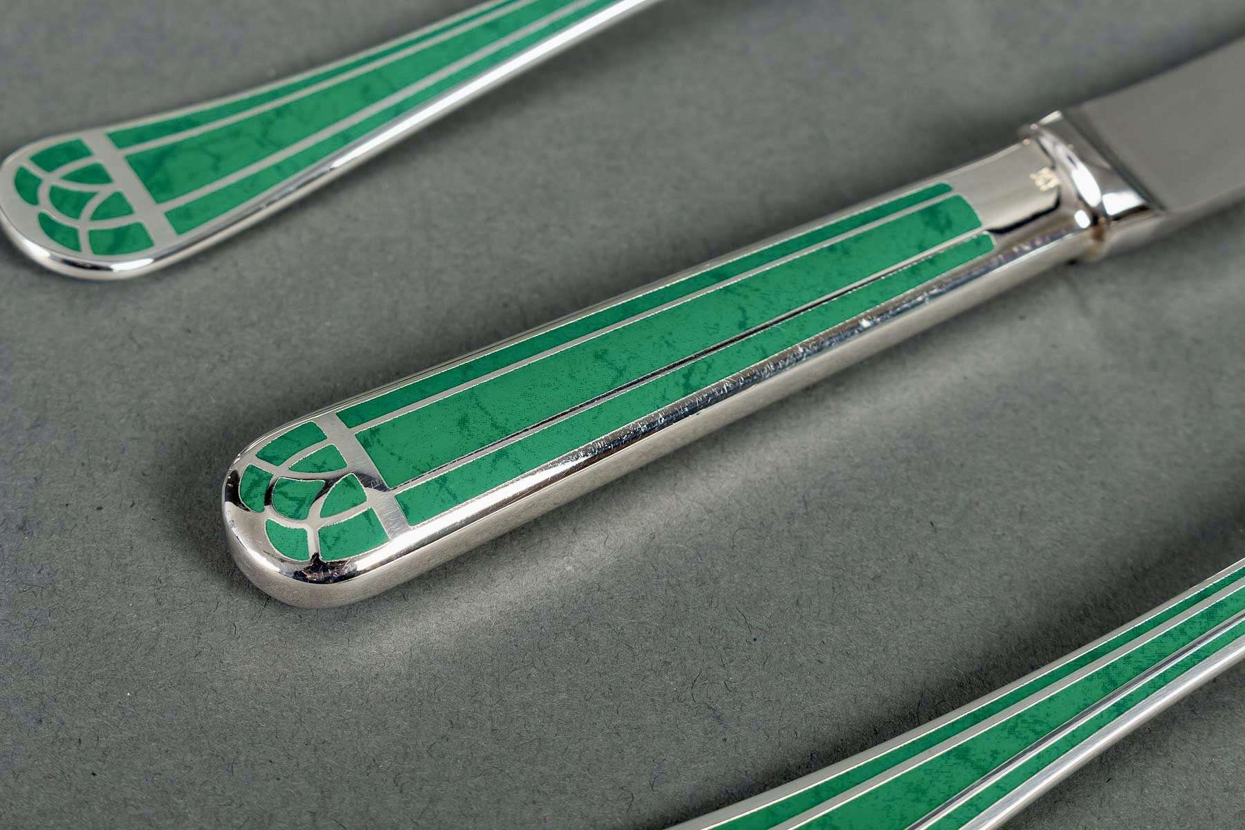 Ménagère « Talisman » en métal argenté et laque de Chine verte de Christofle.