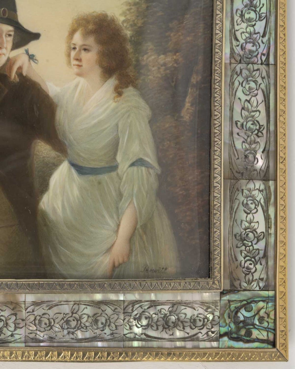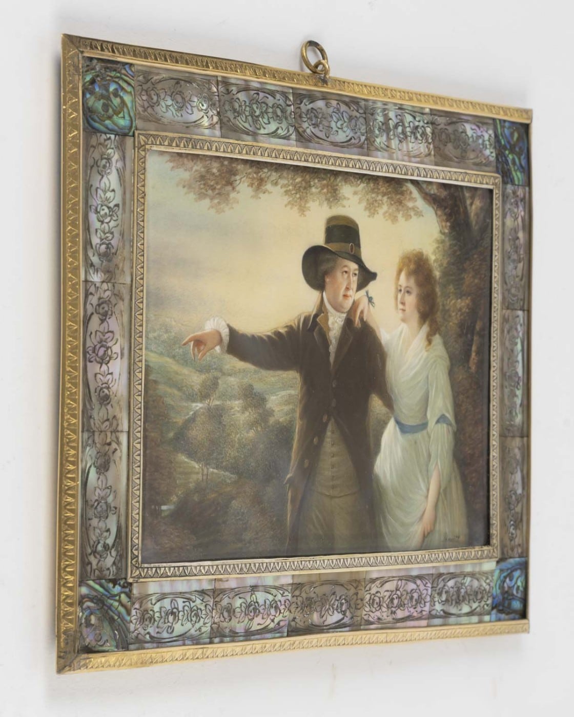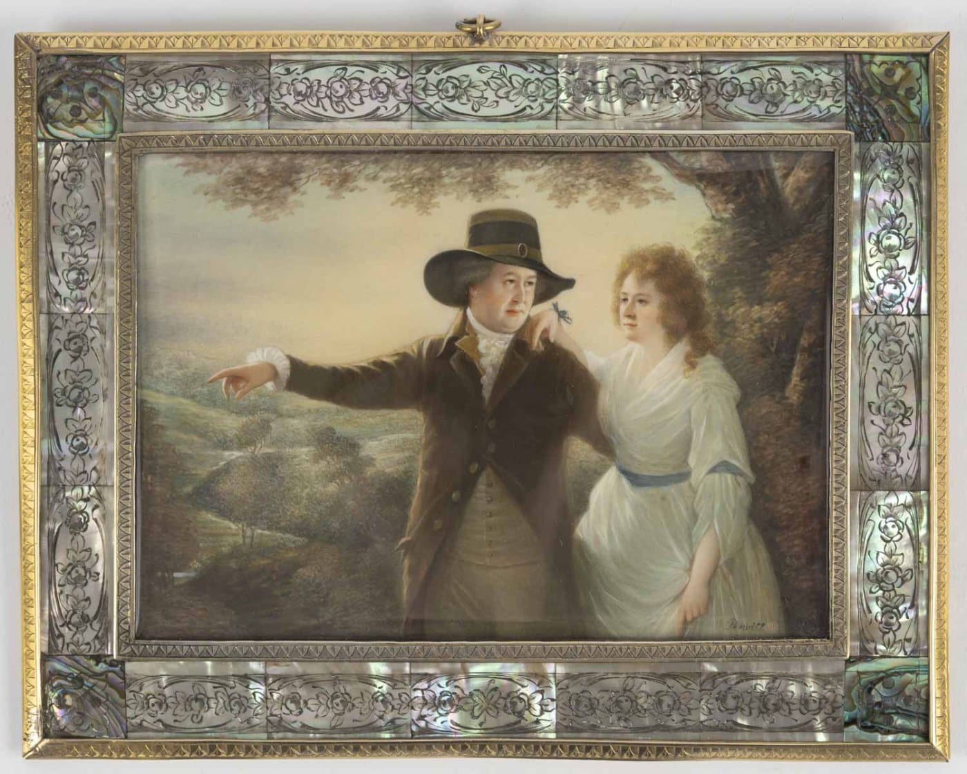 Miniature sur ivoire reprenant le tableau « Portrait of Sir John and Lady Clerk of Penicuik » peint vers 1790 et conservé à la National Gallery of Ireland de Dublin. Sous verre, dans un cadre encadrement en nacre gravé de fleurs ceint de baguettes de laiton gravé chacun d’un frise de palmettes. Le revers figurant une plaque de galalithe anthracite incrustée au centre d’un bouquet de fleurs en nacre.
