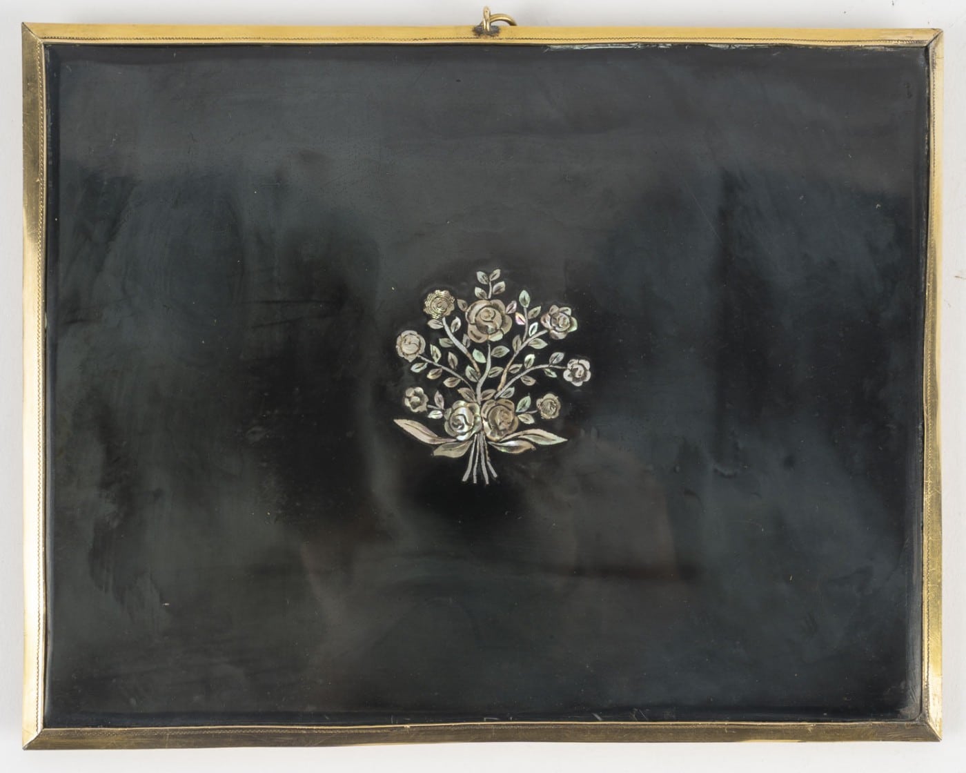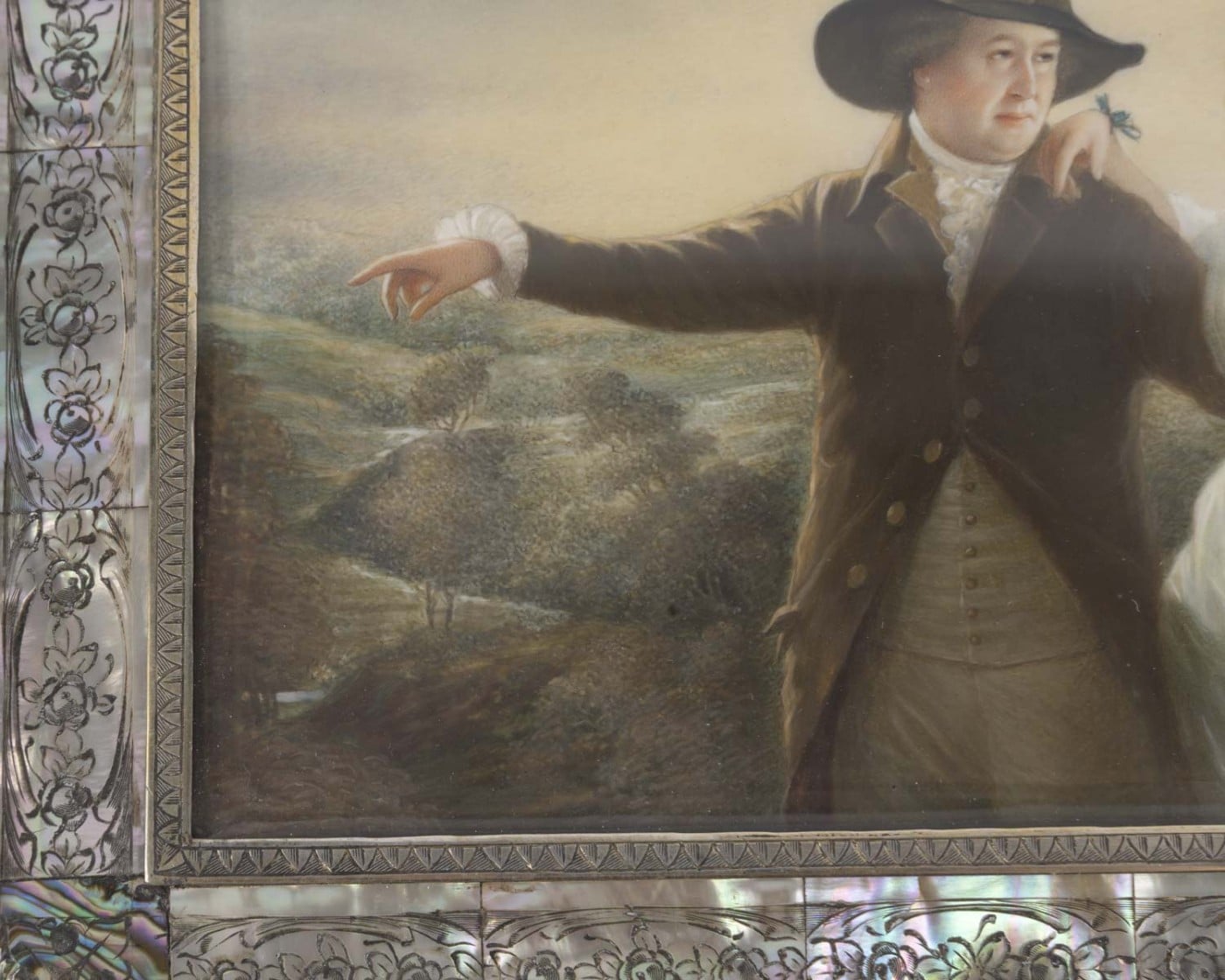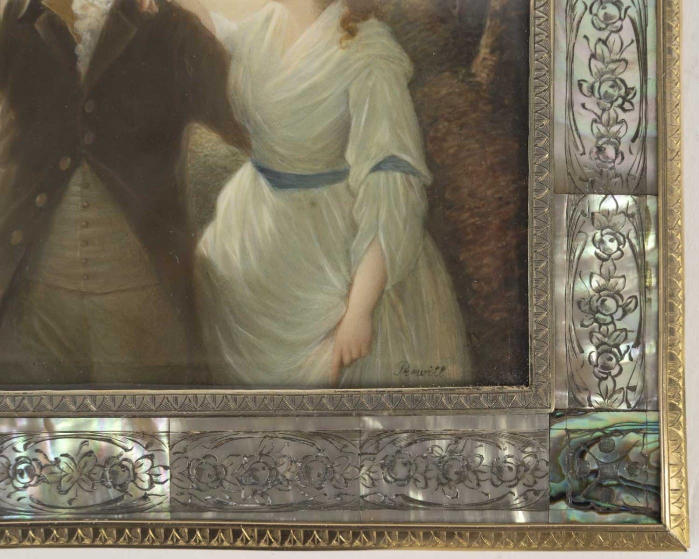 Miniature sur ivoire reprenant le tableau « Portrait of Sir John and Lady Clerk of Penicuik » peint vers 1790 et conservé à la National Gallery of Ireland de Dublin. Sous verre, dans un cadre encadrement en nacre gravé de fleurs ceint de baguettes de laiton gravé chacun d’un frise de palmettes. Le revers figurant une plaque de galalithe anthracite incrustée au centre d’un bouquet de fleurs en nacre.