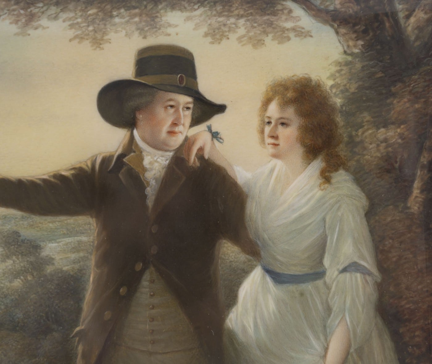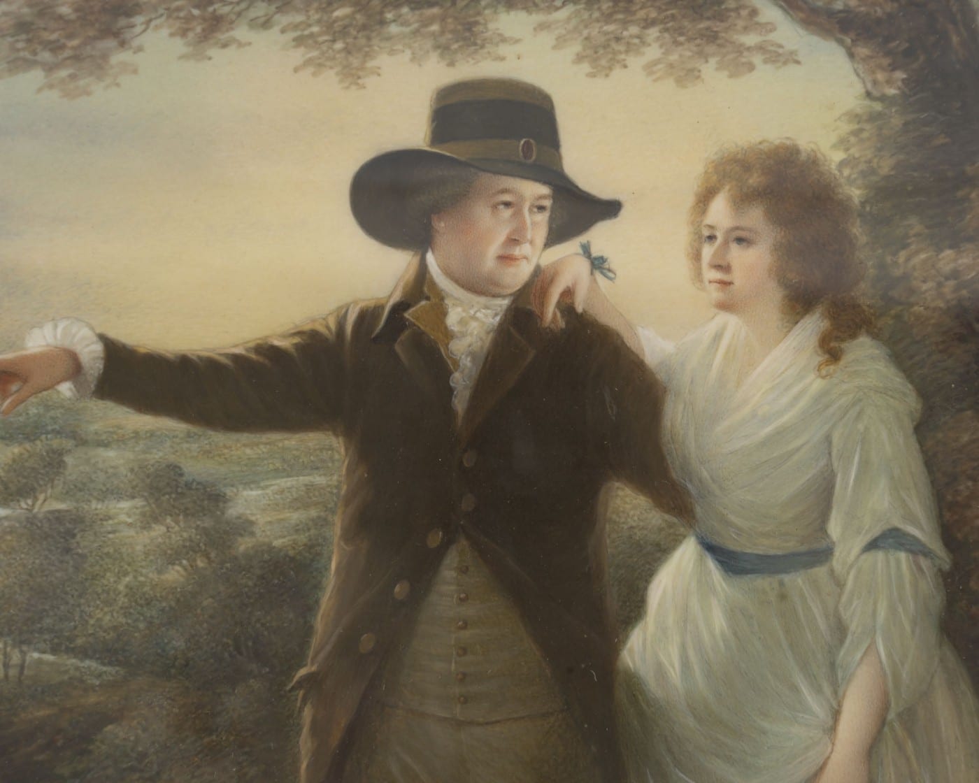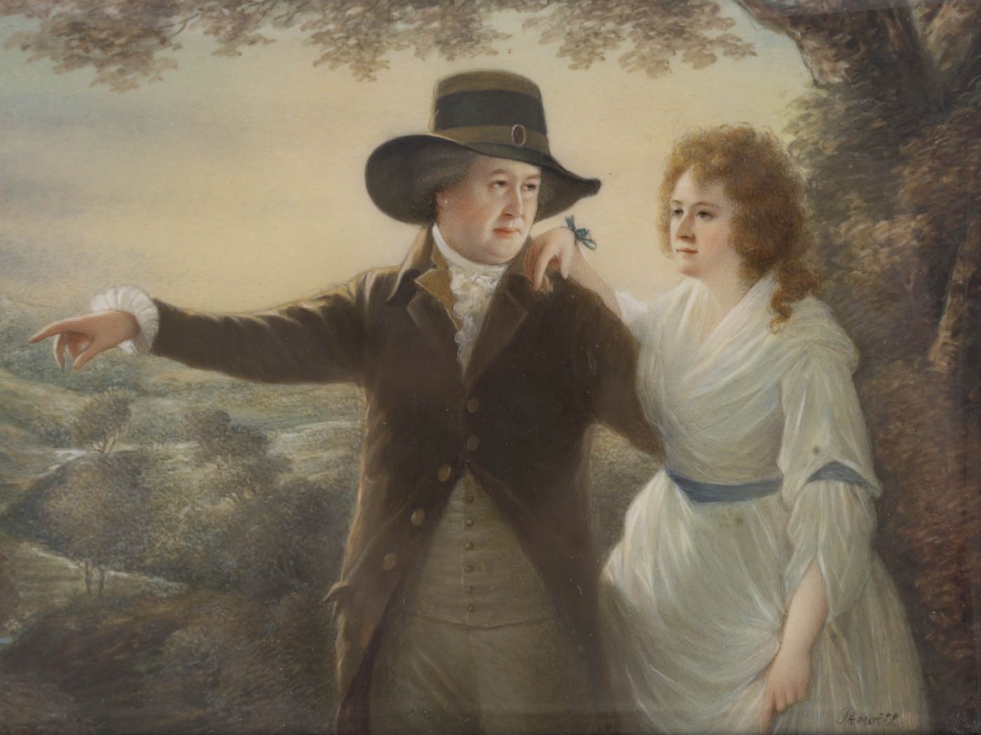 Sir John Clerk (vers 1740-1798), 5e baronnet, descendait d’un riche marchand qui avait fait construire Penicuik House, près d’Édimbourg. Il se consacra aux activités intellectuelles typiques des Lumières écossaises et épousa Rosemary Dacre, originaire du Cumberland, en 1777. Leur tendre relation est magnifiquement rendue dans ce double portrait, considéré comme l’un des plus beaux tableaux de Raeburn. Si le procédé du couple se promenant devant un paysage imaginaire avait déjà été utilisé par Gainsborough, Reynolds et Romney, le décor ici est étroitement inspiré du domaine du couple, avec le paysage broussailleux des collines de Pentland. Les deux personnages s’intègrent parfaitement au paysage grâce à leurs gestes et au contre-jour. La lumière du soleil est essentielle : elle caresse la rivière sinueuse, l’arbre, le manteau de Sir John et la joue de son épouse. Elle se reflète sur sa robe de mousseline, soulignant ainsi le lien qui les unit.