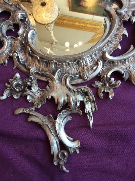 Miroir de style Louis XV, rocaille, en bronze argenté, avec biseau.