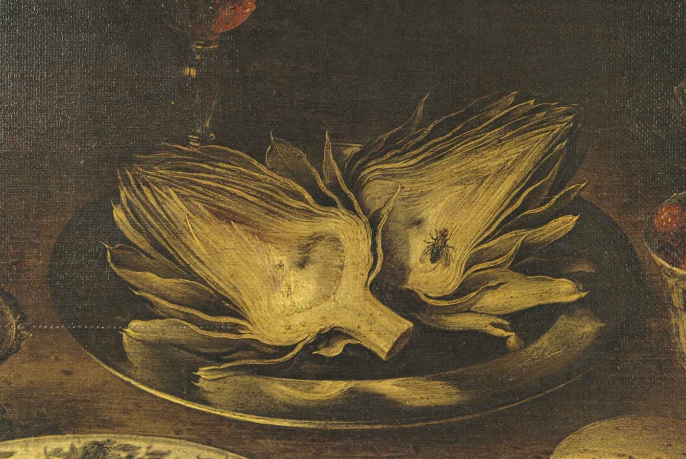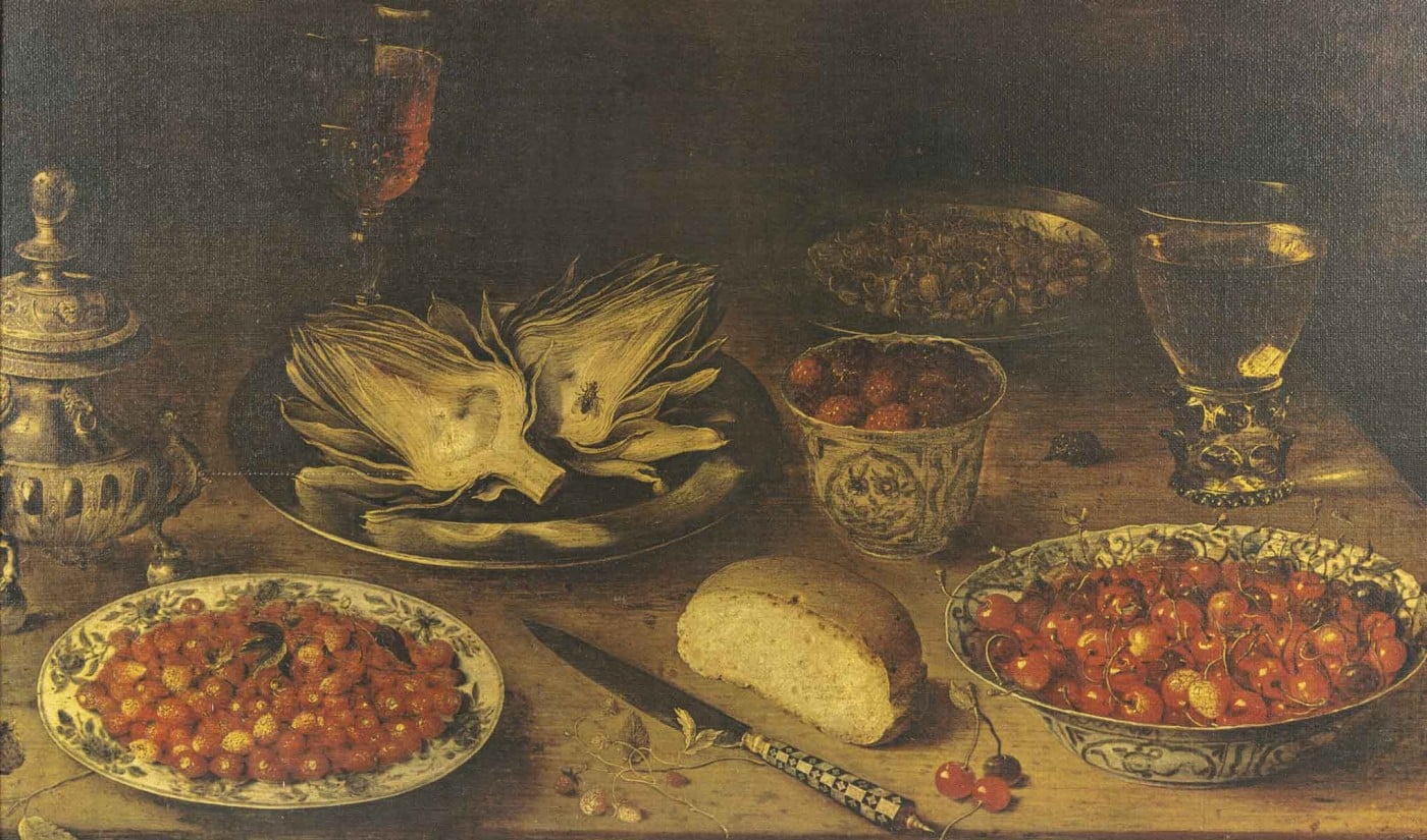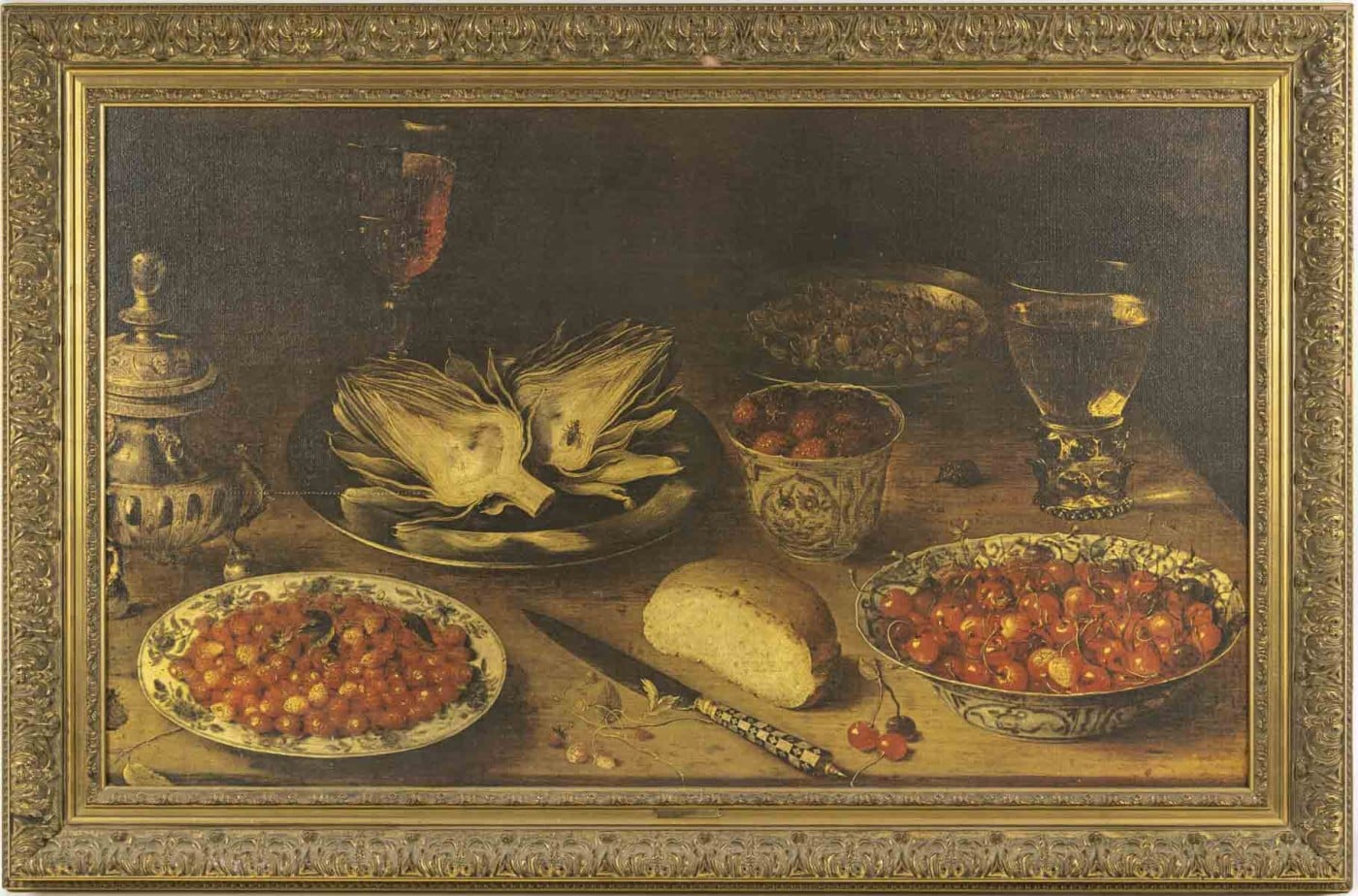 Style flamand du XVIIe siècle ,une composition riche avec des artichauts, des cerises, du pain, un verre de vin et divers objets en métal et en verre, disposés sur une table en bois. Le style est caractérisé par des détails minutieux, une lumière douce et une attention particulière aux textures, typiques des œuvres d’artistes comme Abraham van Beert, comme suggéré par le certificat.