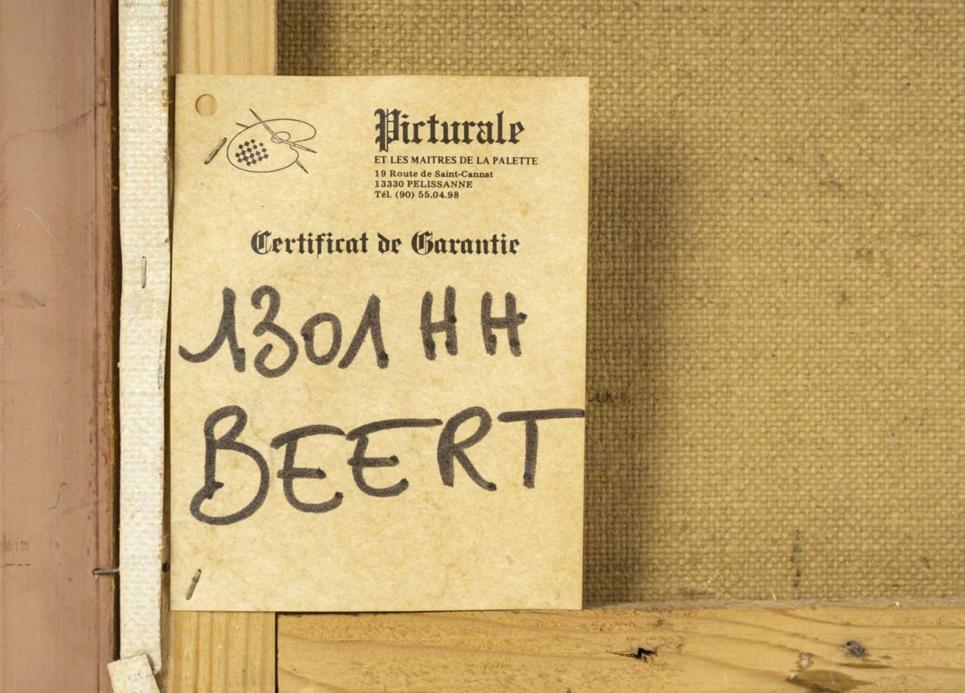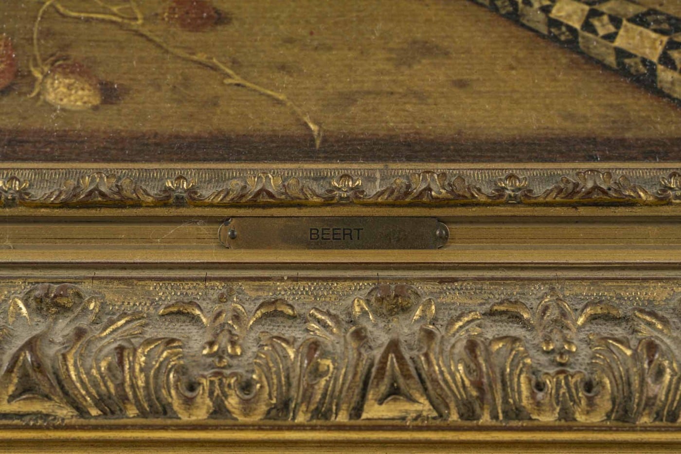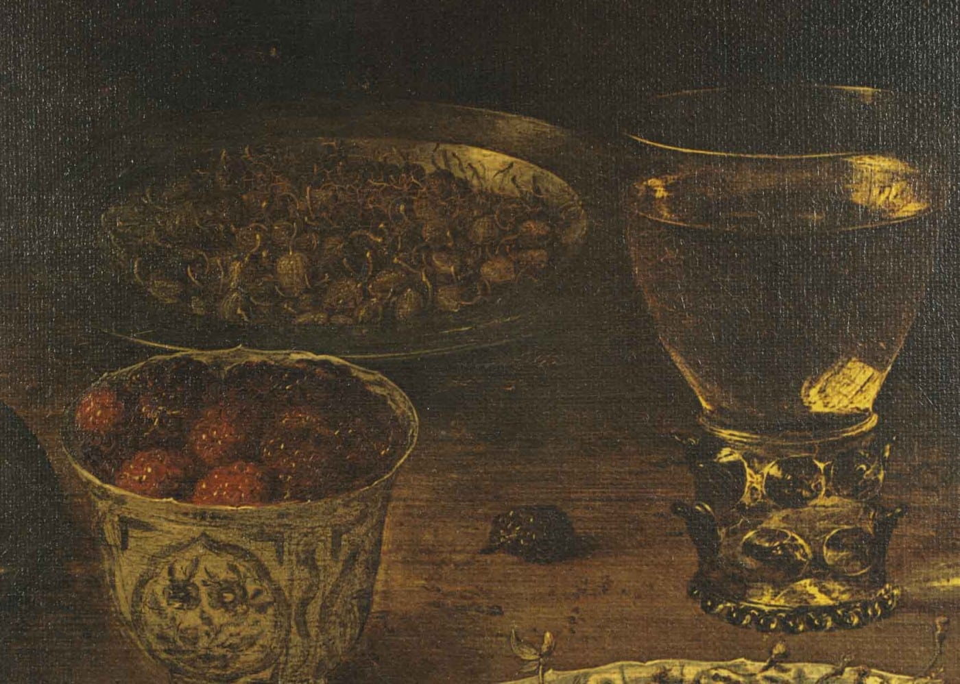 Style flamand du XVIIe siècle ,une composition riche avec des artichauts, des cerises, du pain, un verre de vin et divers objets en métal et en verre, disposés sur une table en bois. Le style est caractérisé par des détails minutieux, une lumière douce et une attention particulière aux textures, typiques des œuvres d’artistes comme Abraham van Beert, comme suggéré par le certificat.