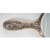 D’atours Rococo, un volubile décor joliment ciselé souligne le pourtour de chaque pièce: perlés, volutes et reinceaux feuillagés, palmettes côtoient fleurettes, boutons de roses disposés en agrafes, brins de muguets librement épanchés. Bordés d’entrelancs fleuris, d’amples cartouches dit « en miroir » surmontés de tigelles à fleurs stylisées ornent le manche, la prise du face-à-main, de la brosse à cheveux.
