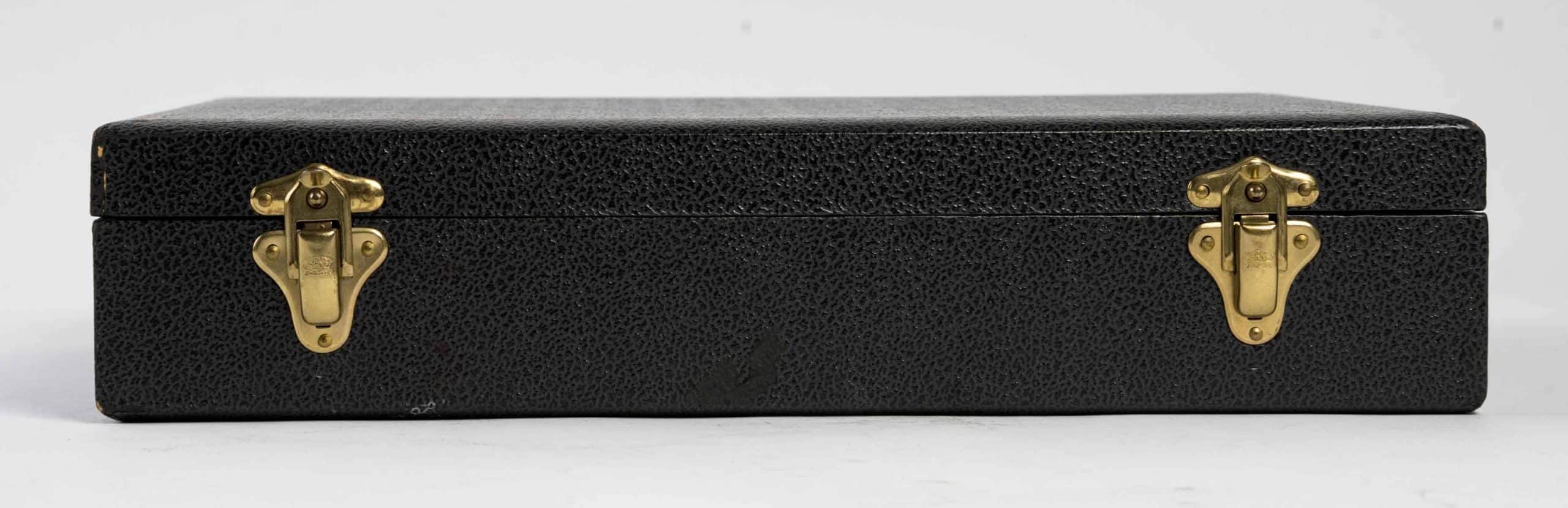 Gainé de percaline noire relevée d’un filet à motifs fleuronnés doré au petit fer, un écrin marqué de la Maison de Bagagerie londonienne « Cheney of London » enferme en les plis d’une garniture de satin blanc les pièces de ce nécessaire de coiffure.