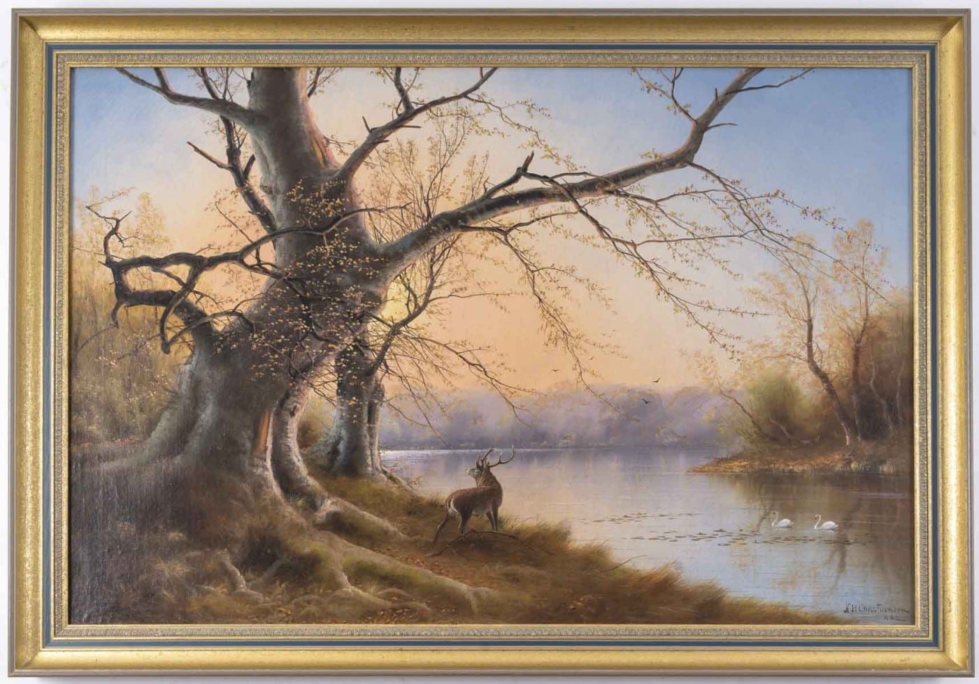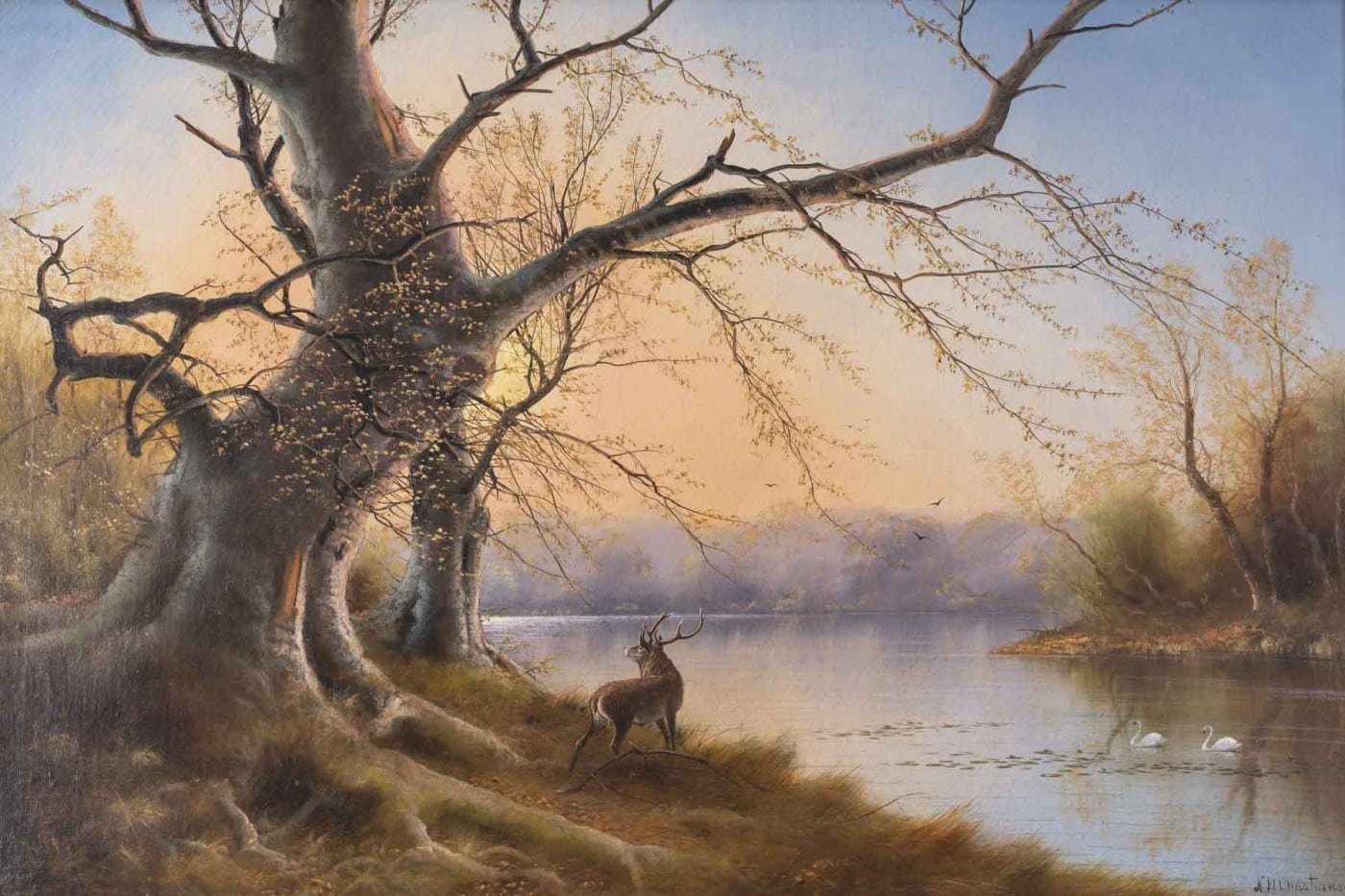 Paysage au cerf. Nils Hans CHRISTIANSEN, peintre Danois né en 1850 et décédé en 1922.