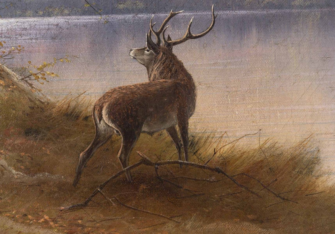 Un paysage de fin d’automne, un cerf à l’arrêt devant un lac aux reflets d’argent, un moment suspendu.