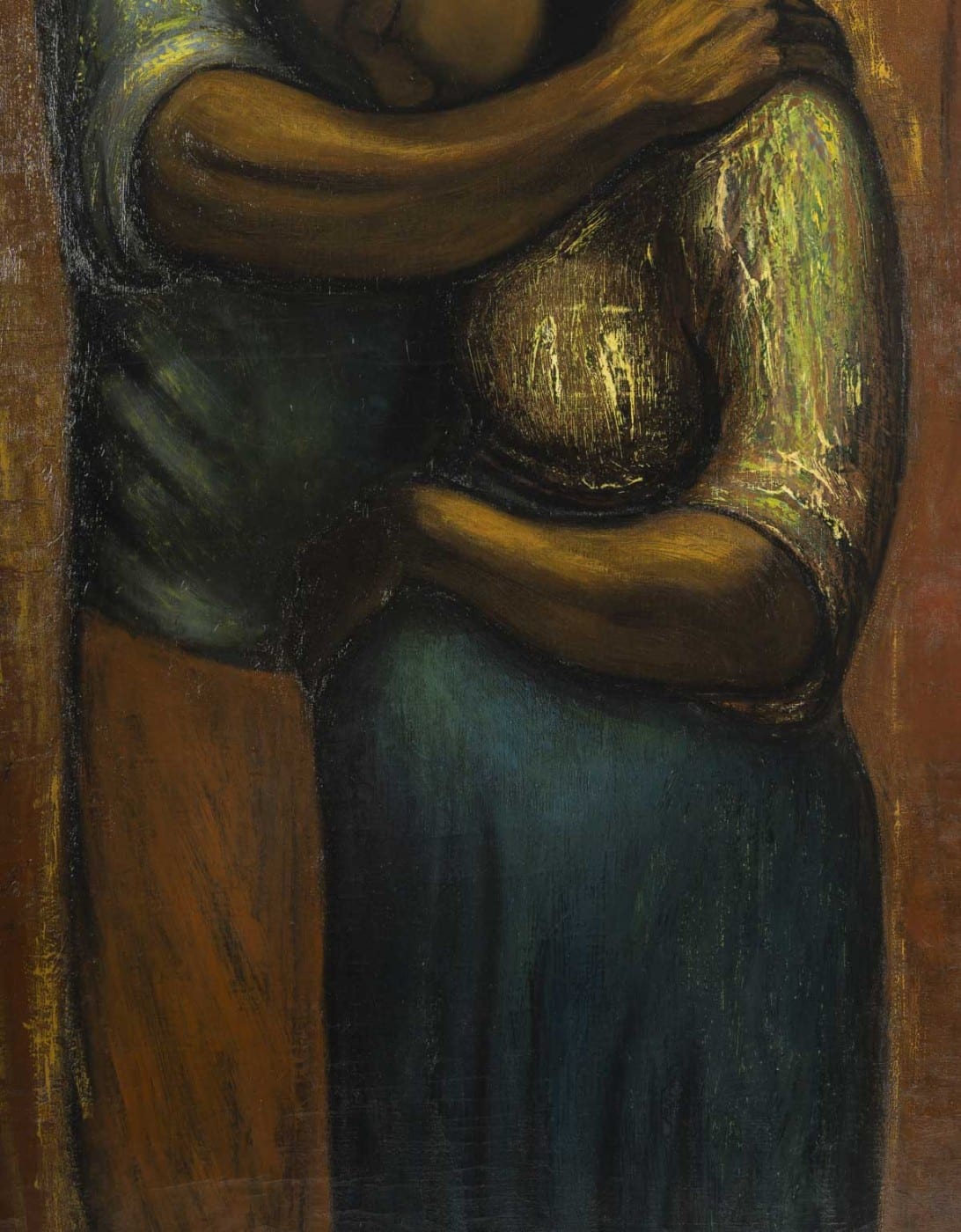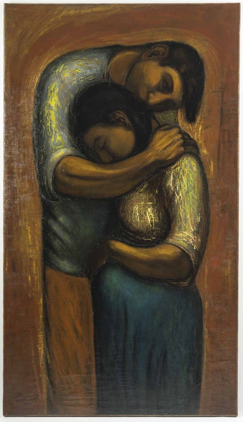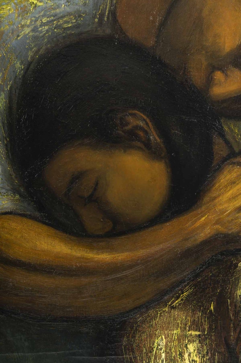 Une oeuvre forte et puissante du peintre salvadorien Noé Canjura représentant un couple enlacé. Un sujet intime d’une grande puissance émotionnelle.