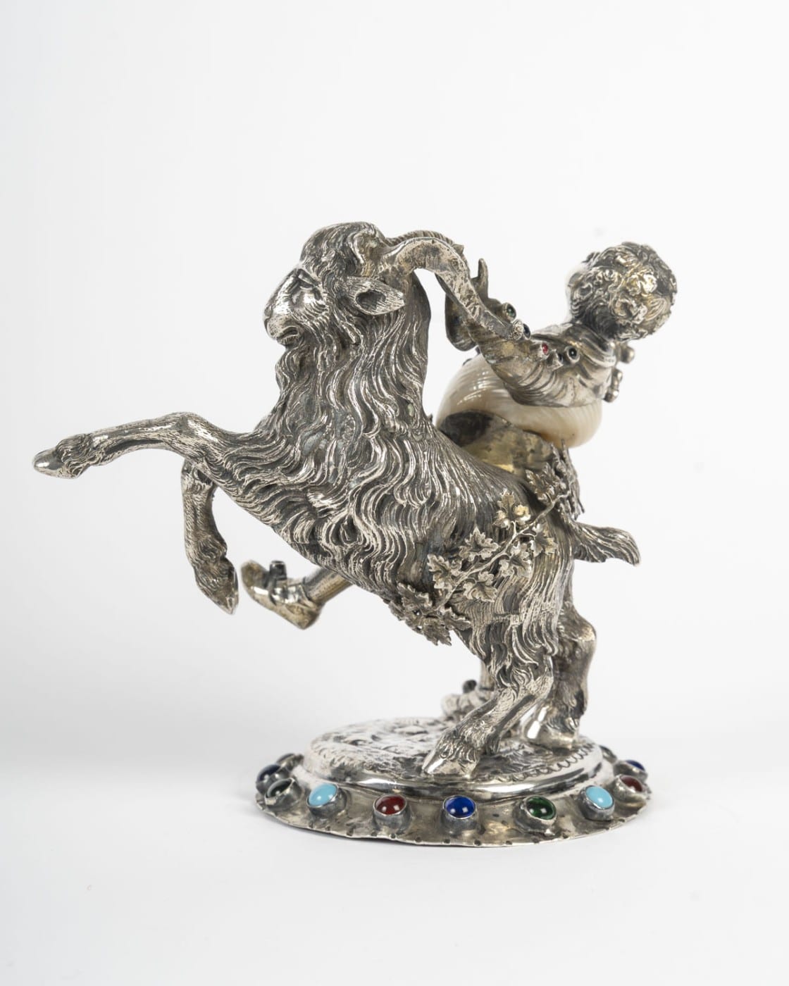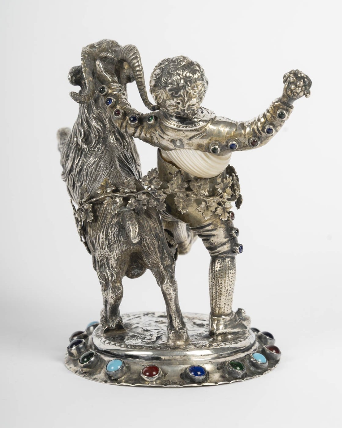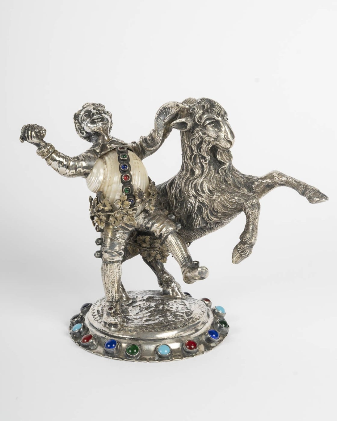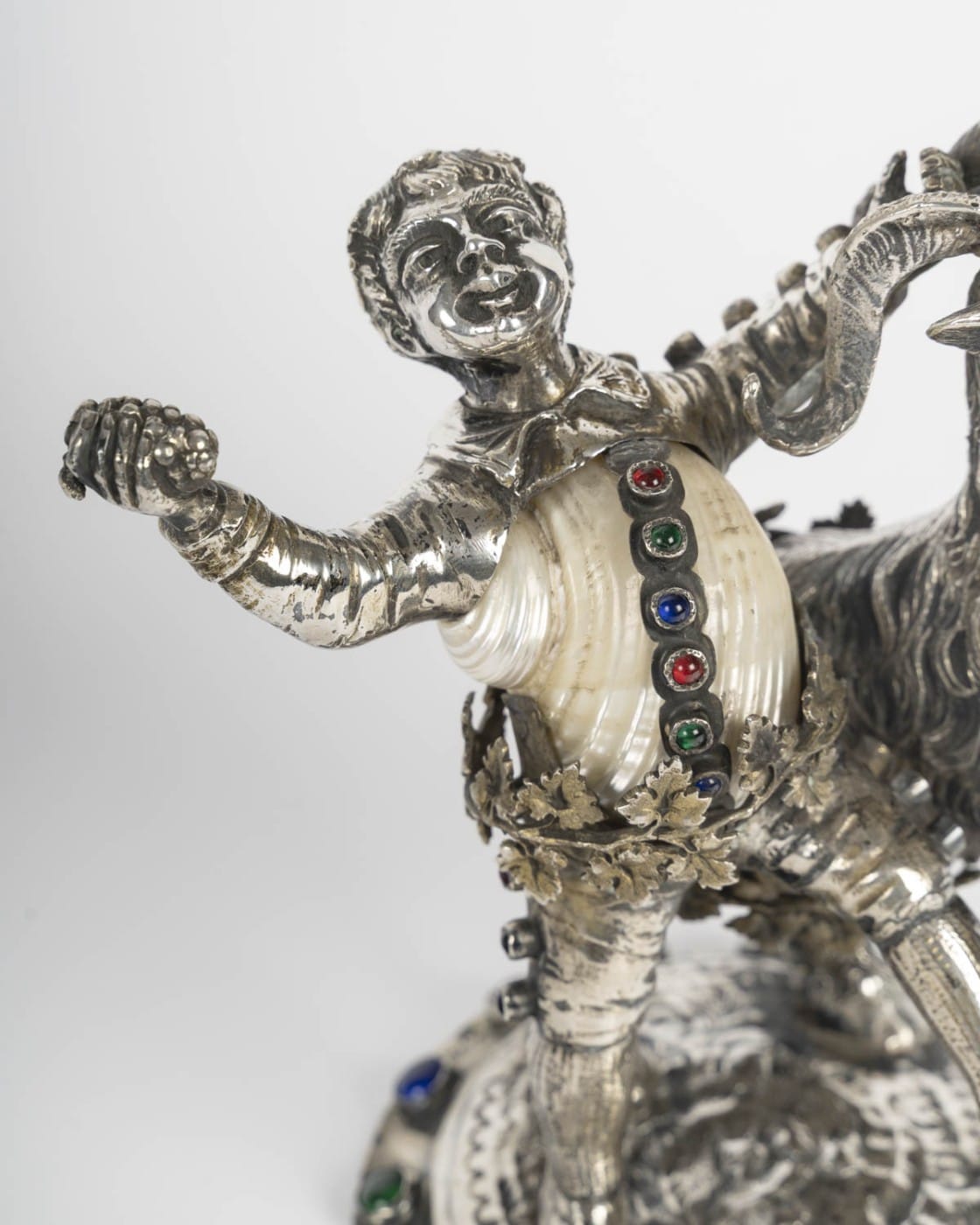 Amusant petit sujet figurant un jeune bacchus et un bouc en argent ciselé et gravé, nacre et incrustations de cabochons de verre coloré. Le corps formé d’un coquillage.