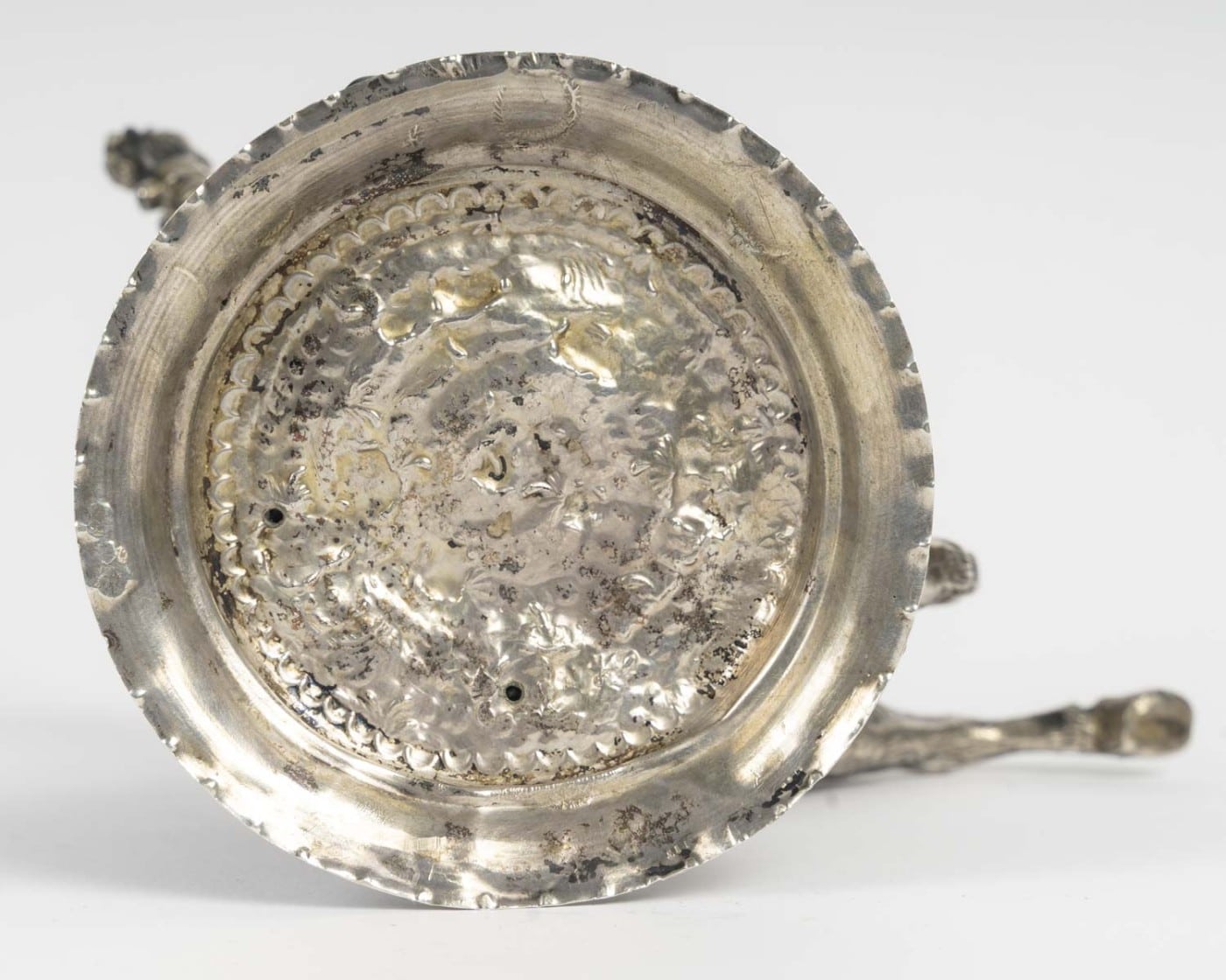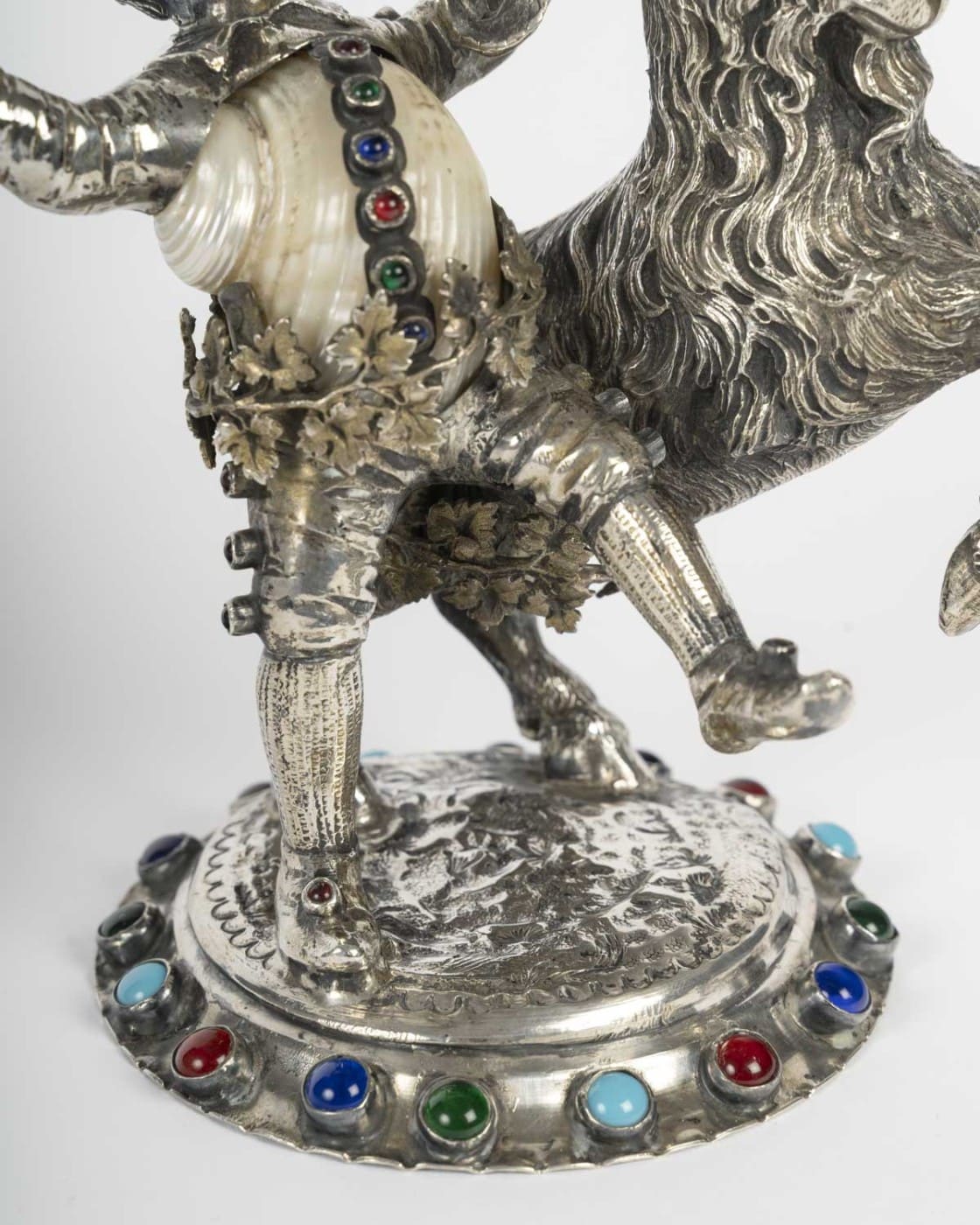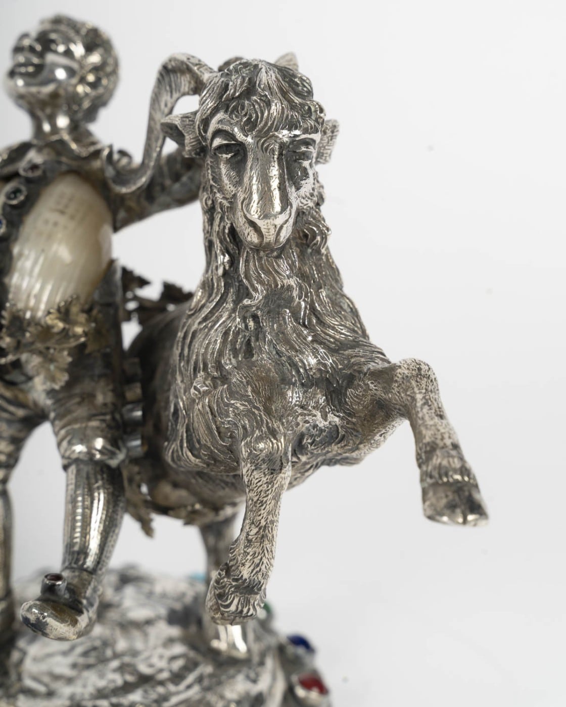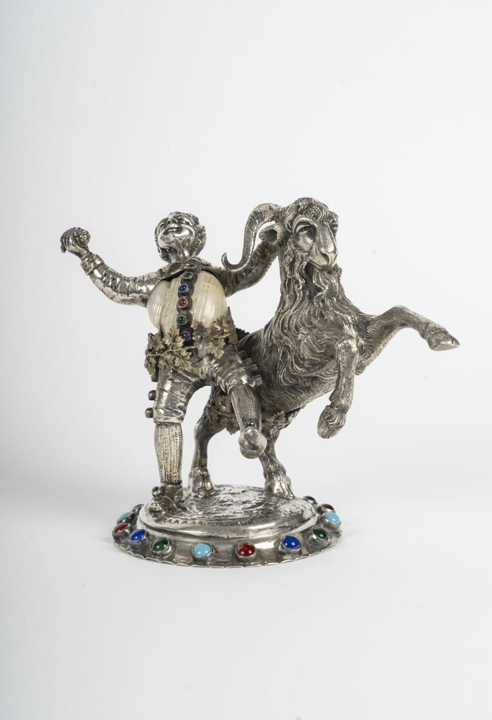 Amusant petit sujet figurant un jeune bacchus et un bouc en argent ciselé et gravé, nacre et incrustations de cabochons de verre coloré. Le corps formé d’un coquillage.