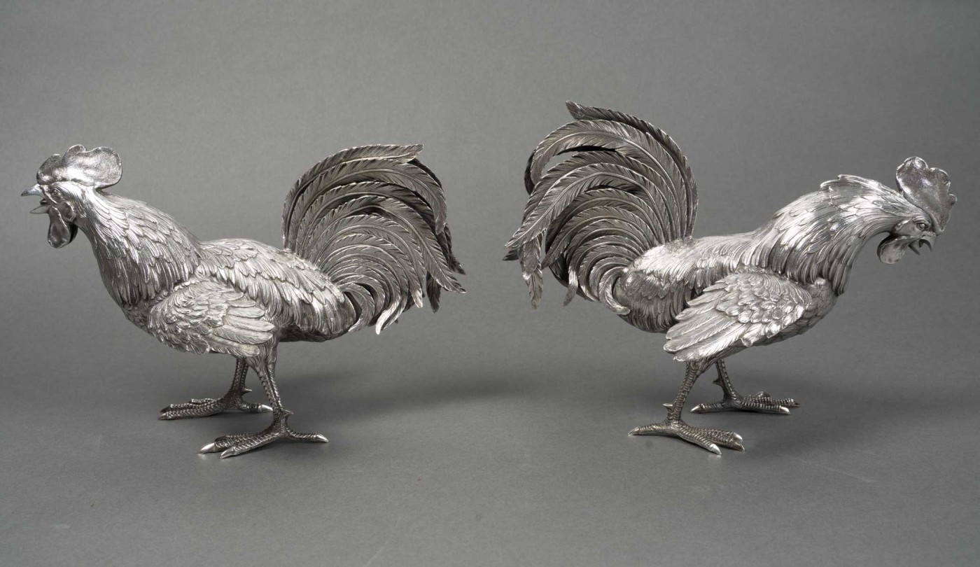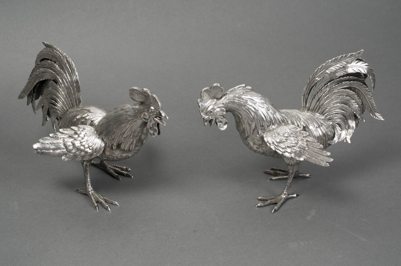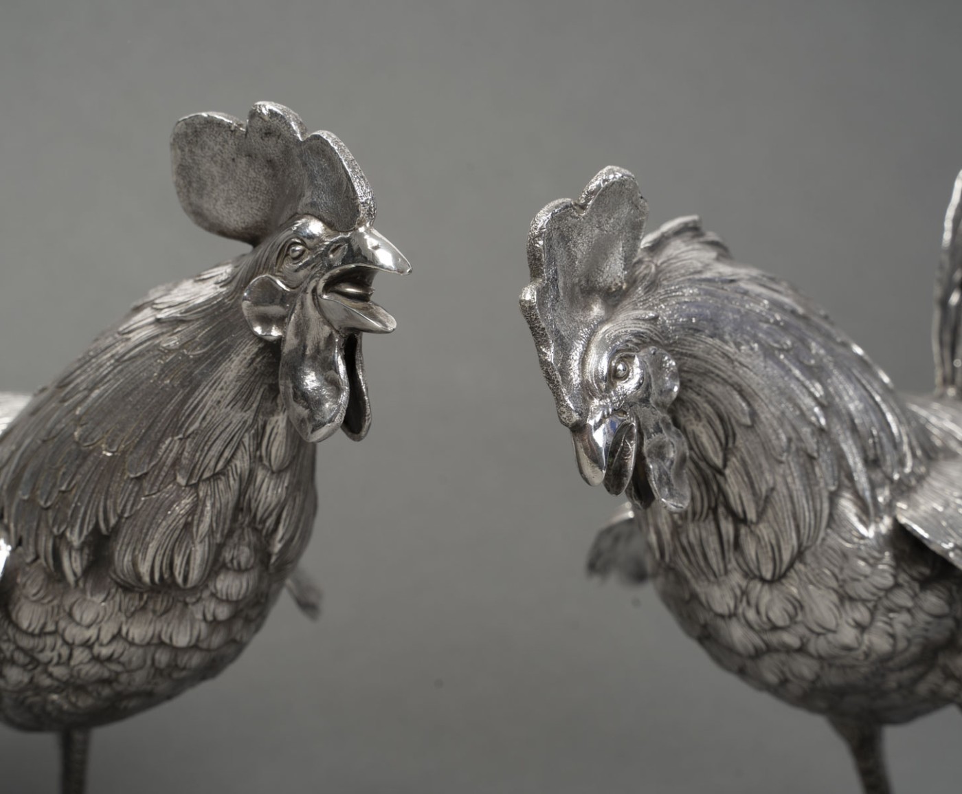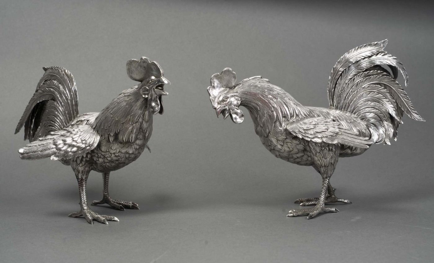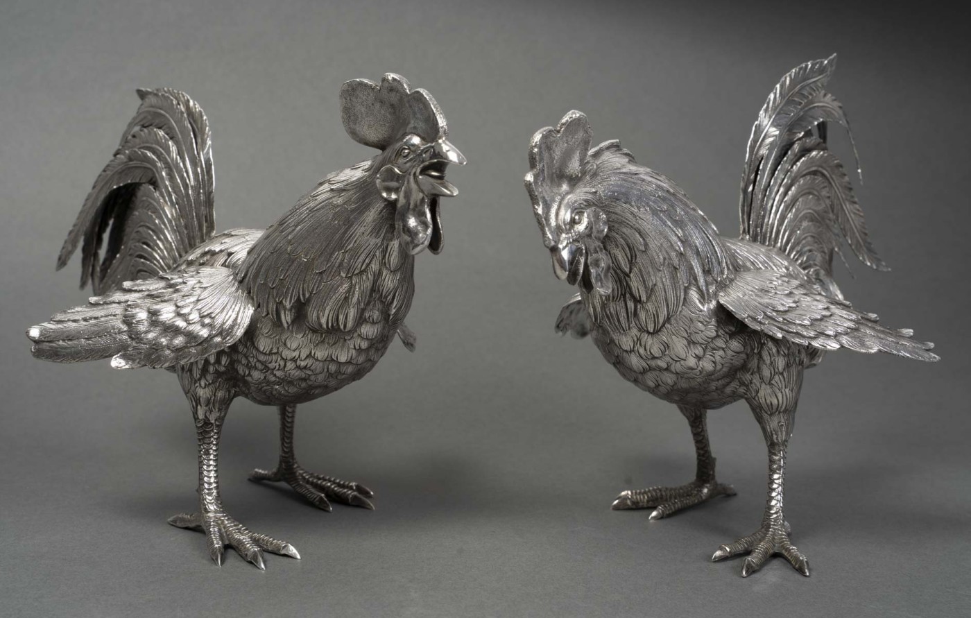Orfèvre ESCHWEGE Paire de coqs combattant en argent massif circa 1950