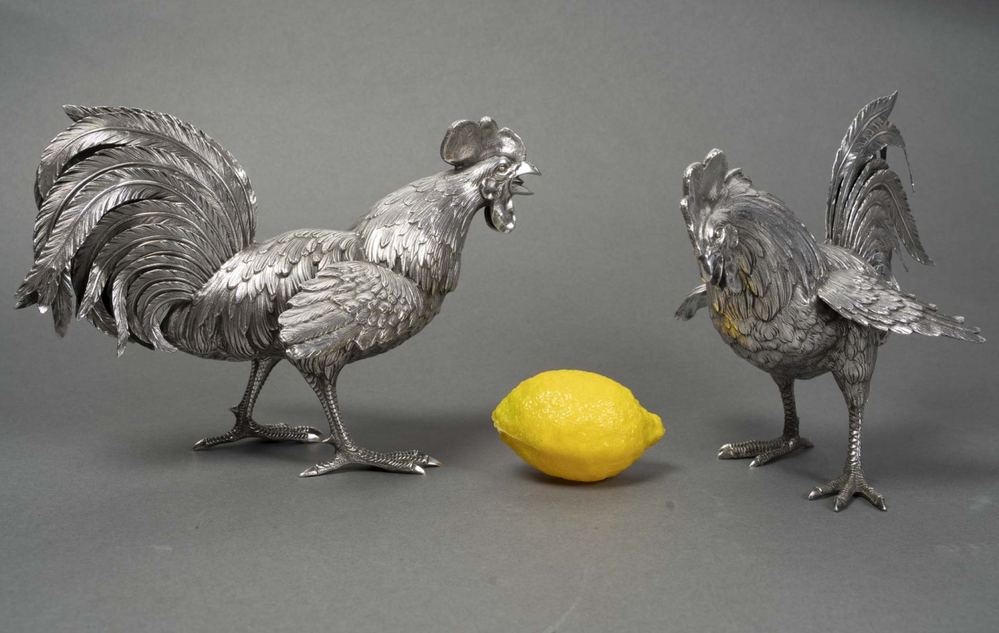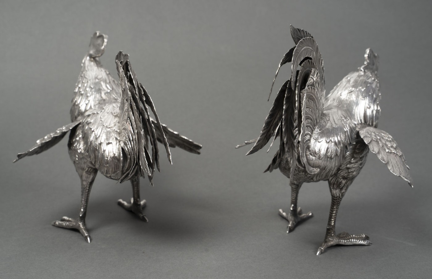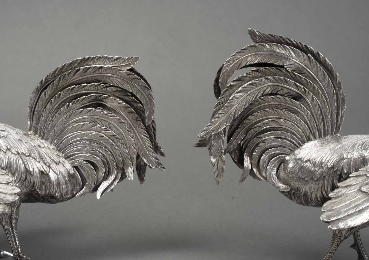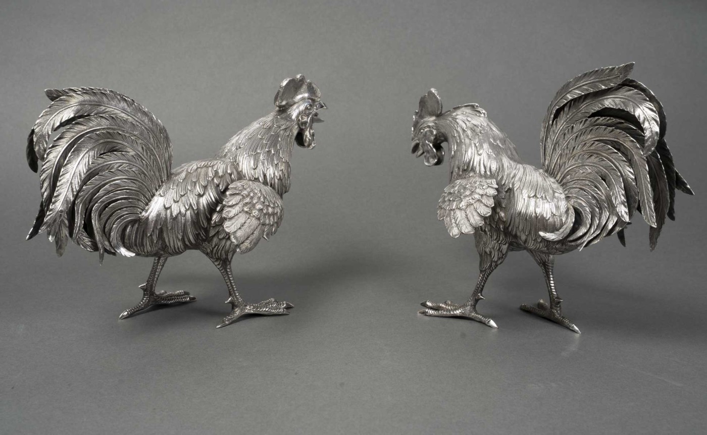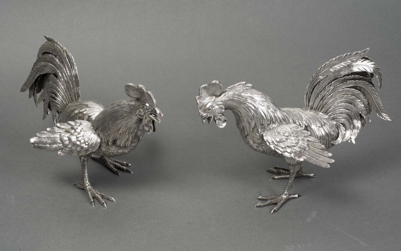 Orfèvre ESCHWEGE Paire de coqs combattant en argent massif circa 1950