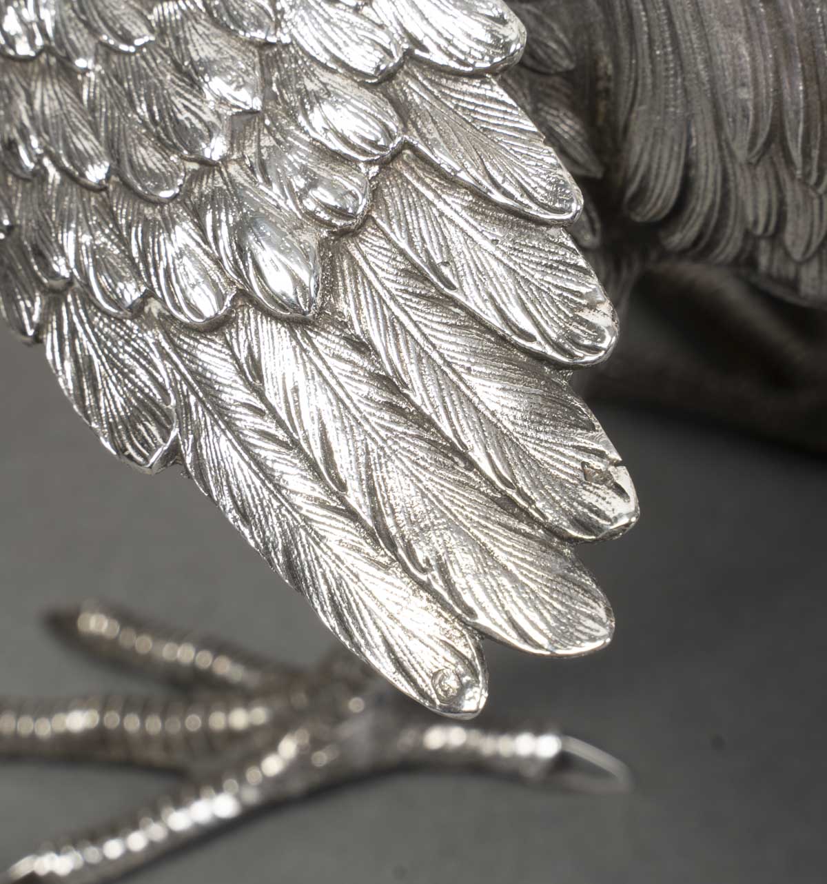 Travail d’une grande virtuosité, typique de la Maison Eschwege, orfèvrerie parisienne réputée de l’après-guerre pour ses sculptures animalières au naturalisme expressif. Ces sculptures étaient destinées au décor de la table lors des grands diners de chasse.