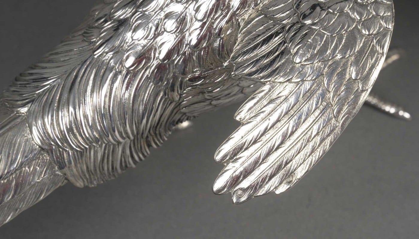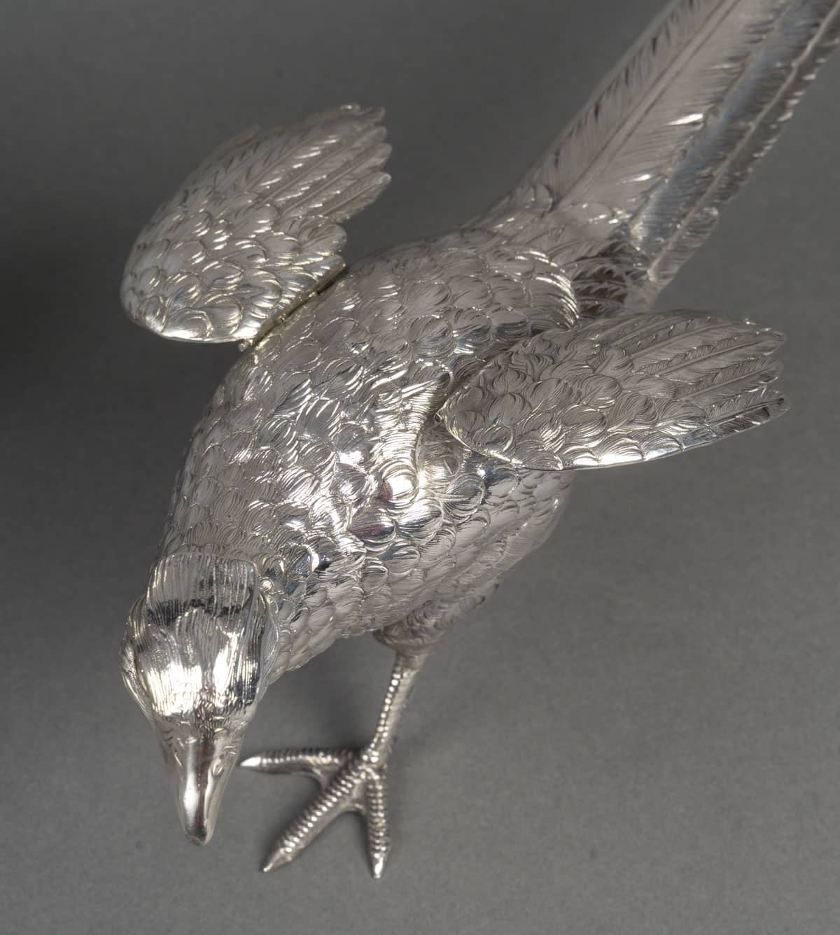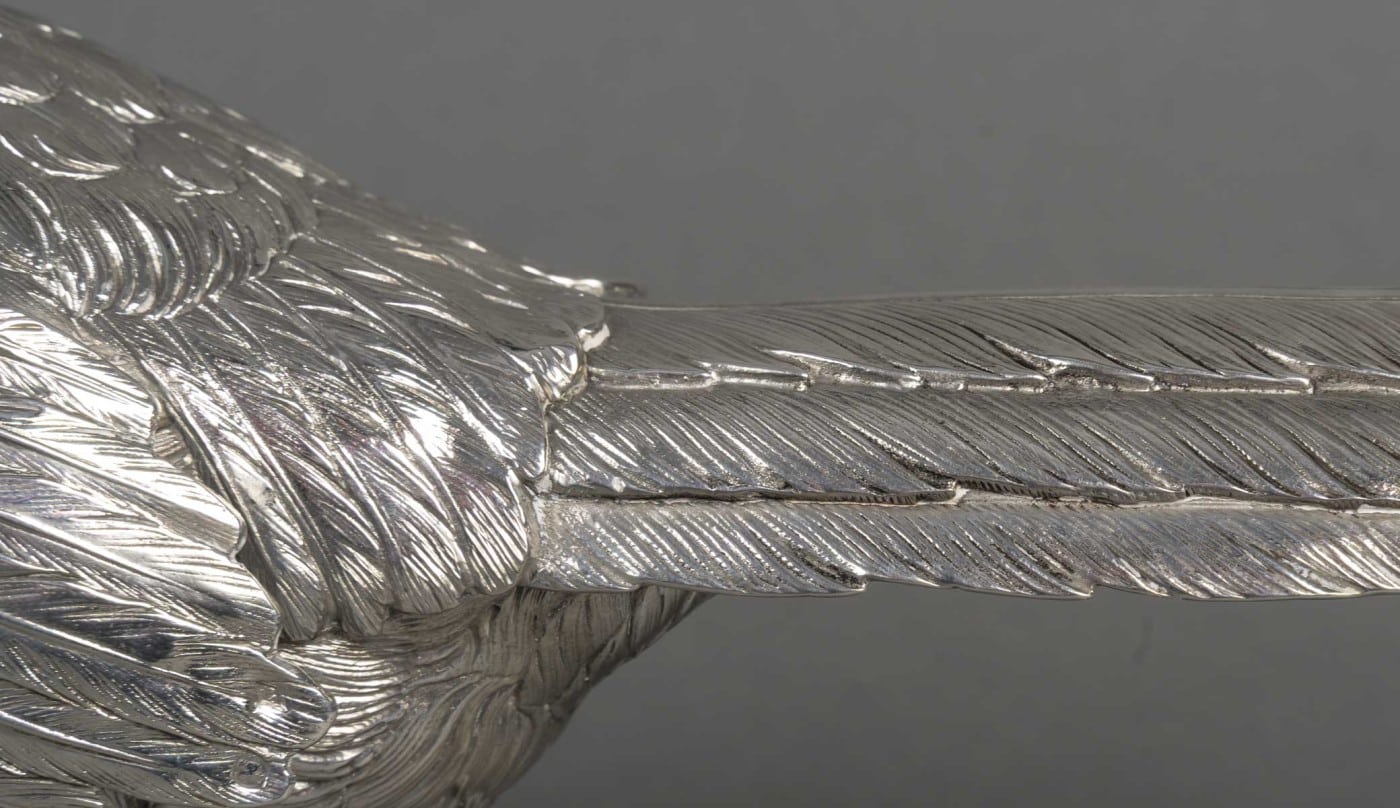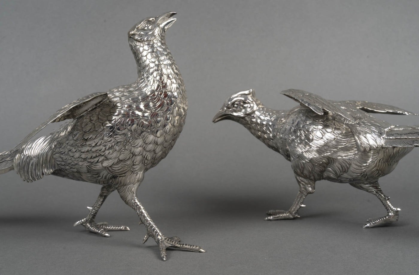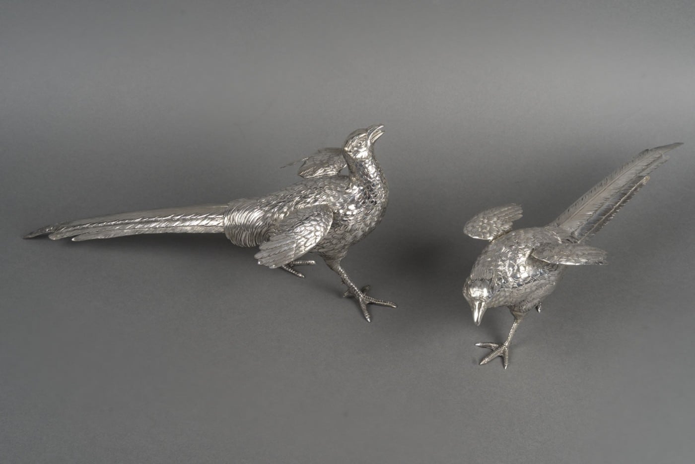 Paire de faisans mâle et femelle en argent massif entièrement ciselés de plumes, et dont les ailes articulées se soulèvent. L’un a la tête en bas et l’autre a la tête en haut.